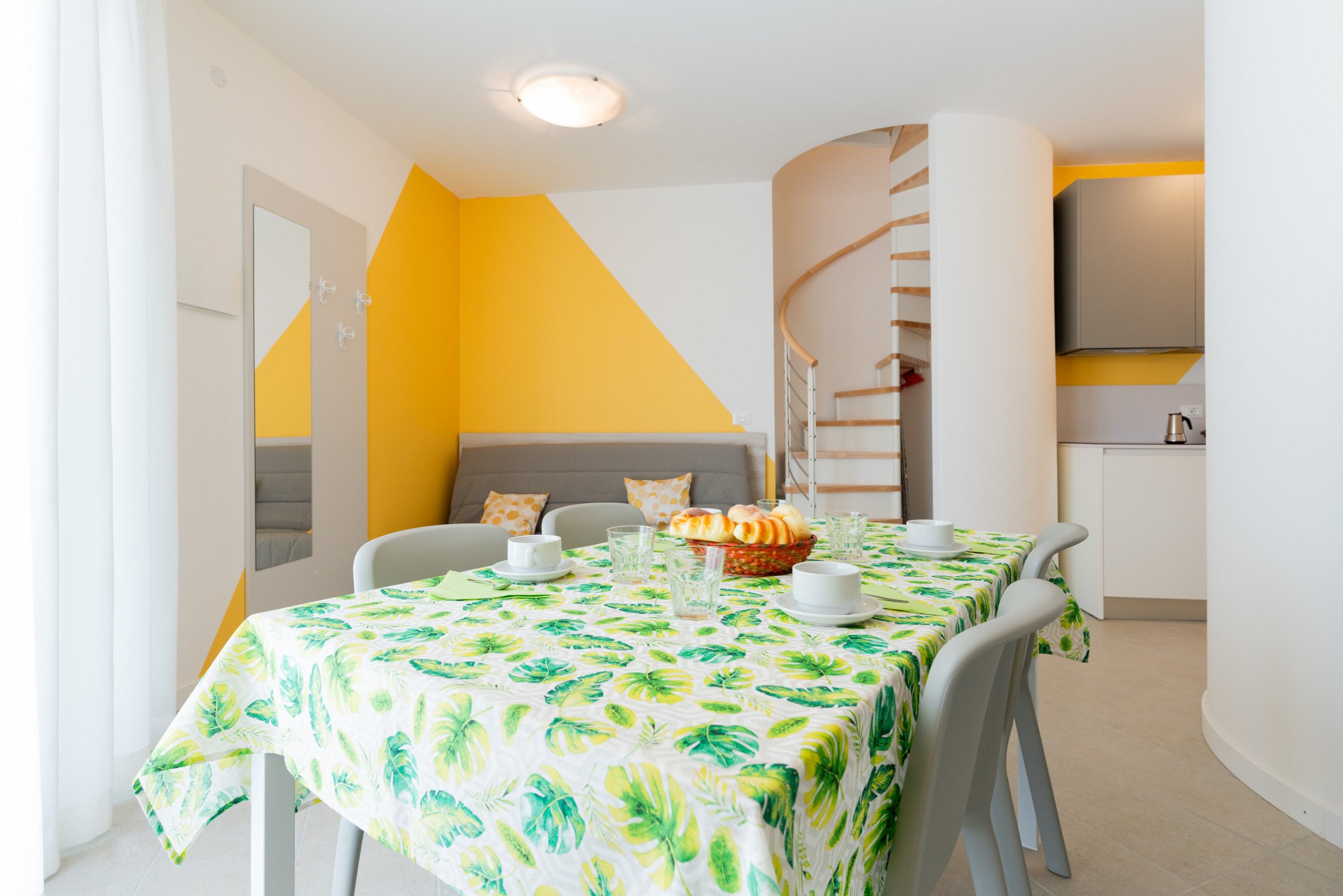 The renovated three-room apartments, located between the second and third floors, offer spacious terraces or balconies facing south or north-west, ideal for enjoying a coffee in the sun or an outdoor dinner while admiring different views of Bibione.