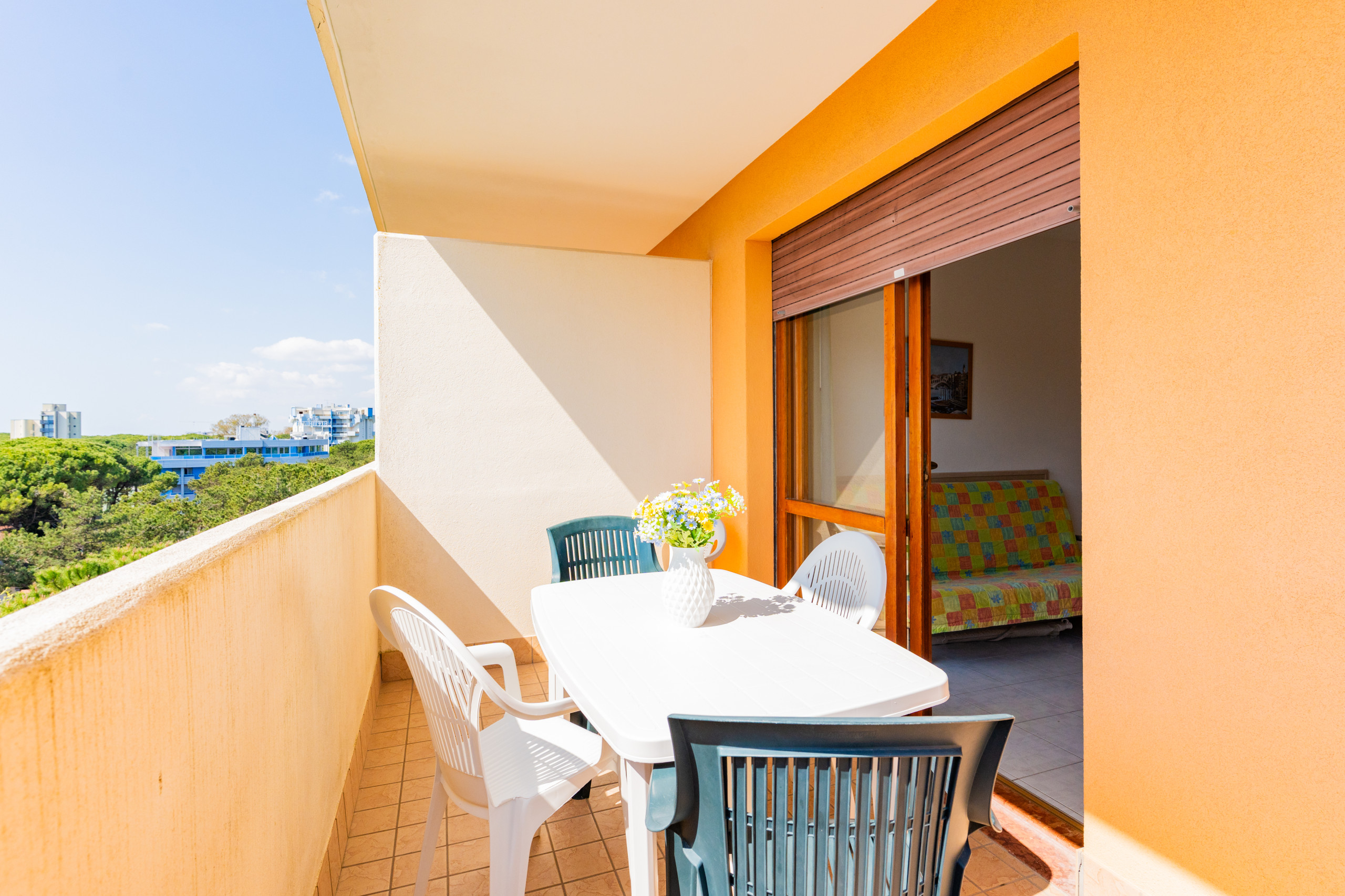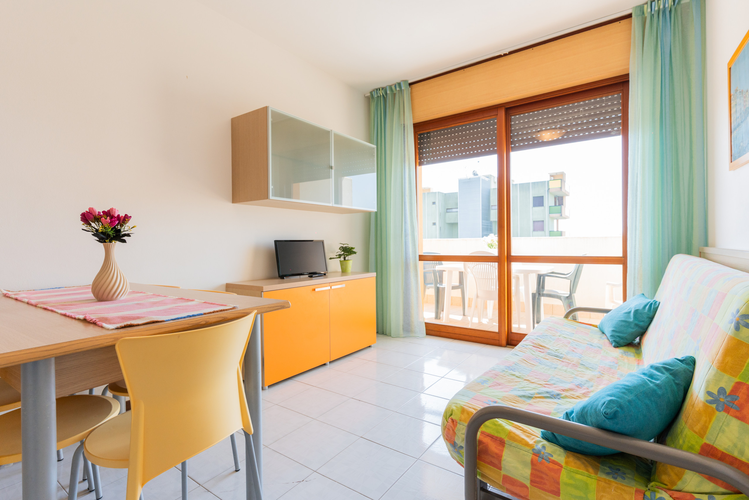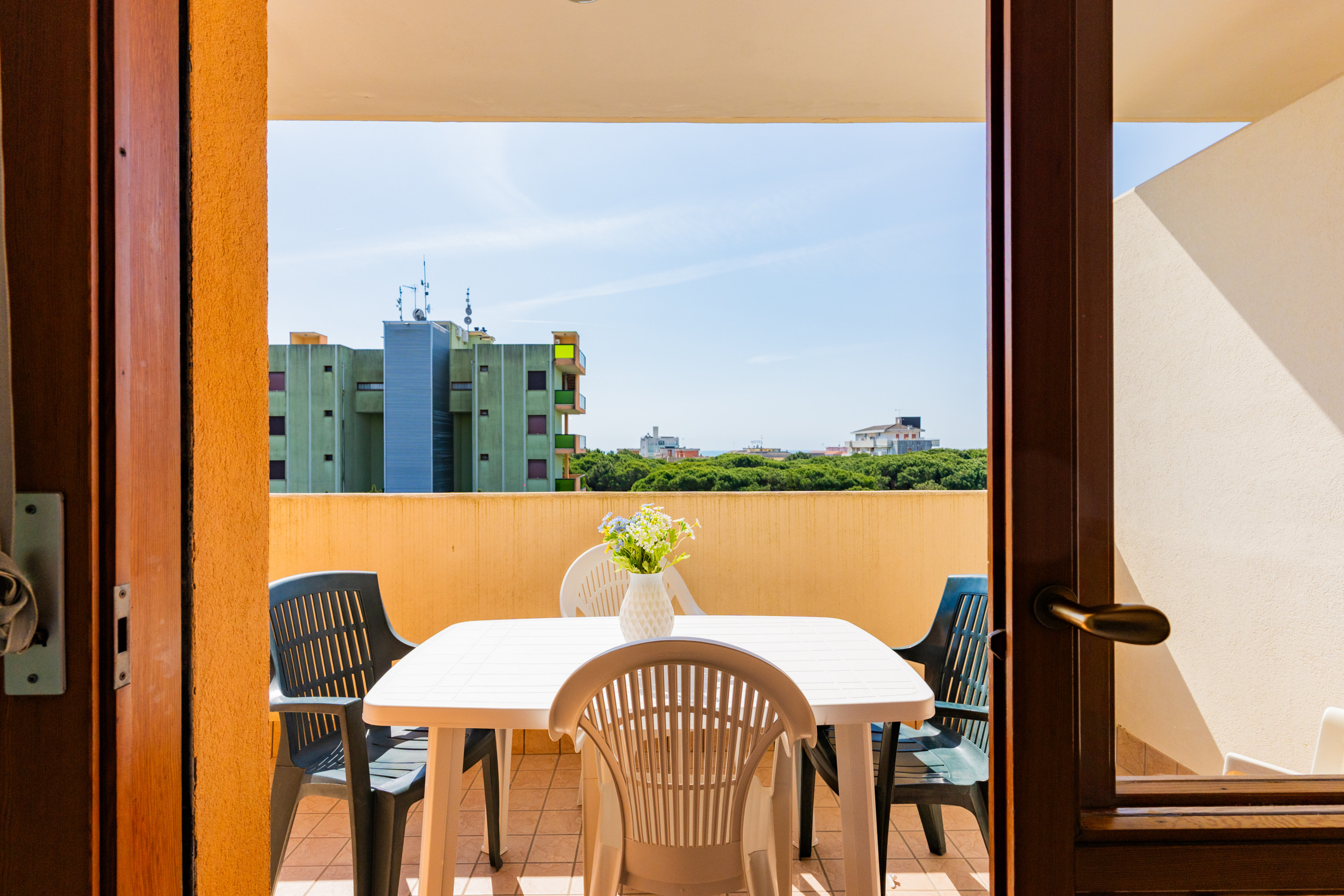 The renovated three-room apartments, located between the second and third floors, offer spacious terraces or balconies facing south or north-west, ideal for enjoying a coffee in the sun or an outdoor dinner while admiring different views of Bibione.