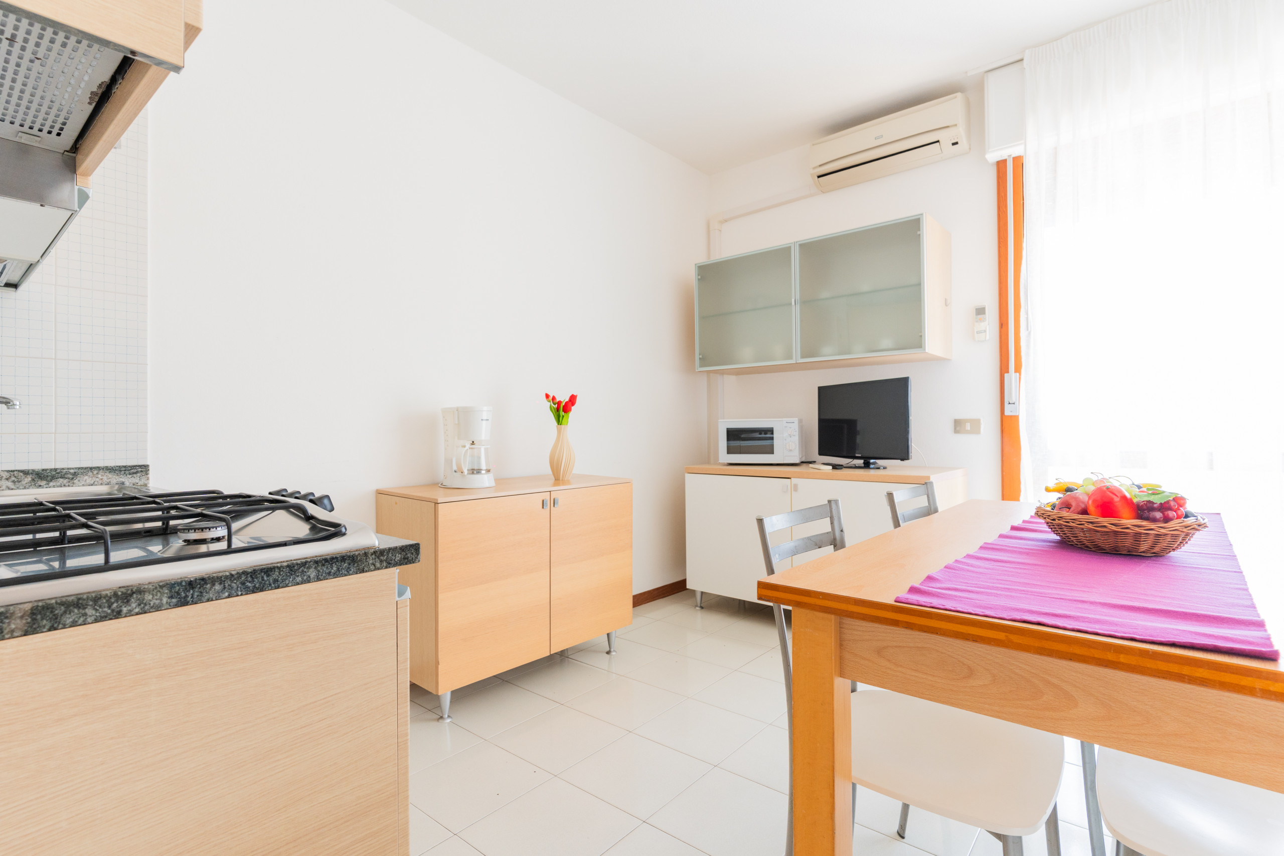 Every apartment is equipped with air conditioning, armoured entrance door, column fridge, microwave, satellite LCD TV, free Wi-Fi and German coffee machine. A numbered uncovered parking space completes the equipment.