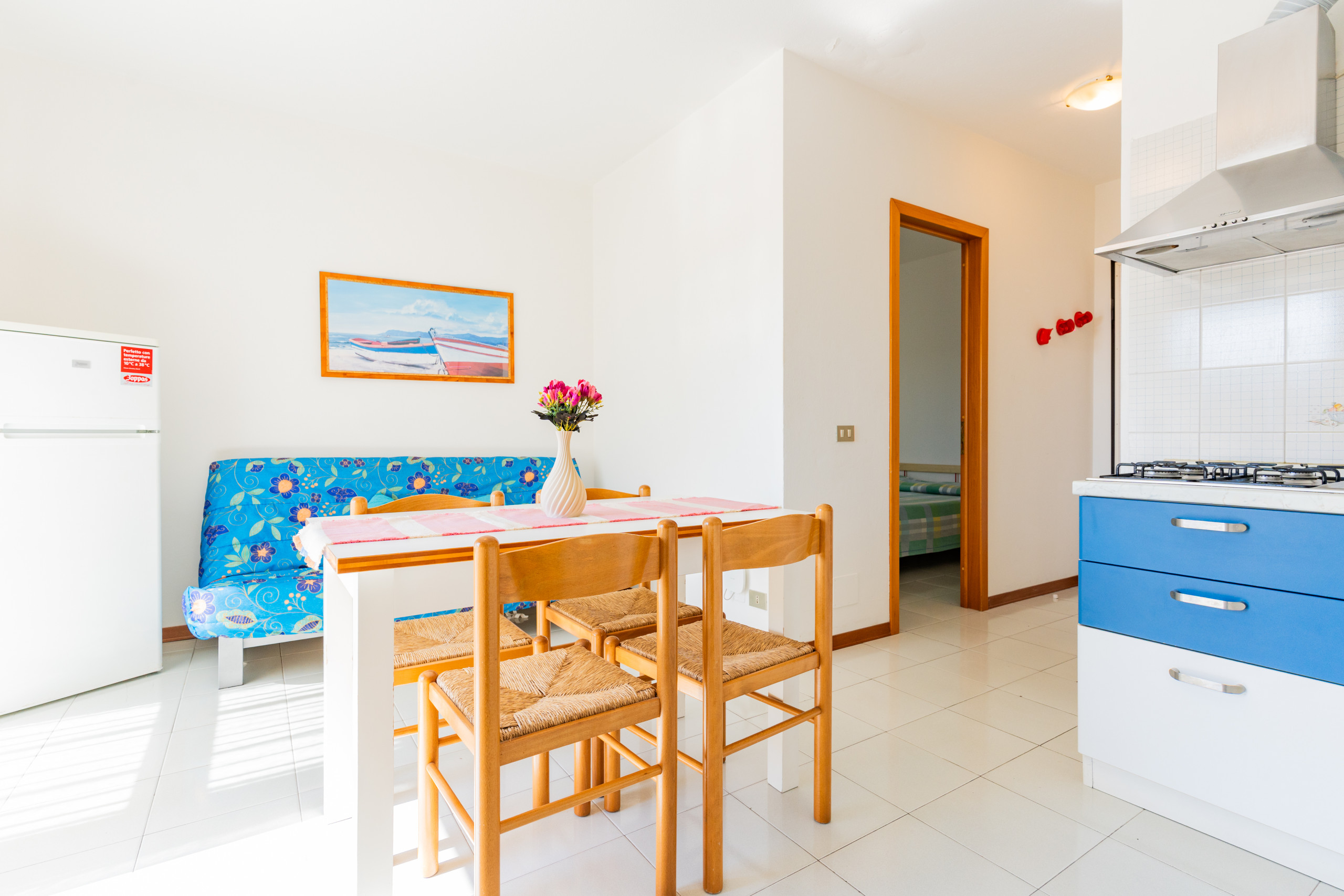 The interiors consist of a living room with an equipped kitchenette, a double sofa bed and two single armchairs with beds, as well as a windowed bathroom with a shower enclosure.