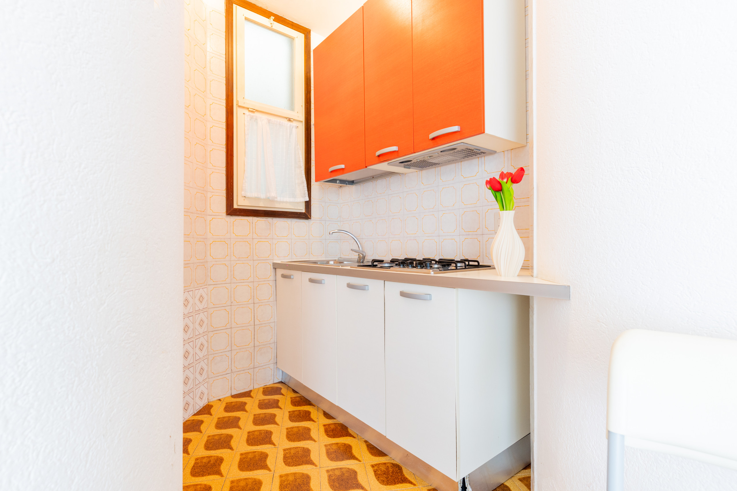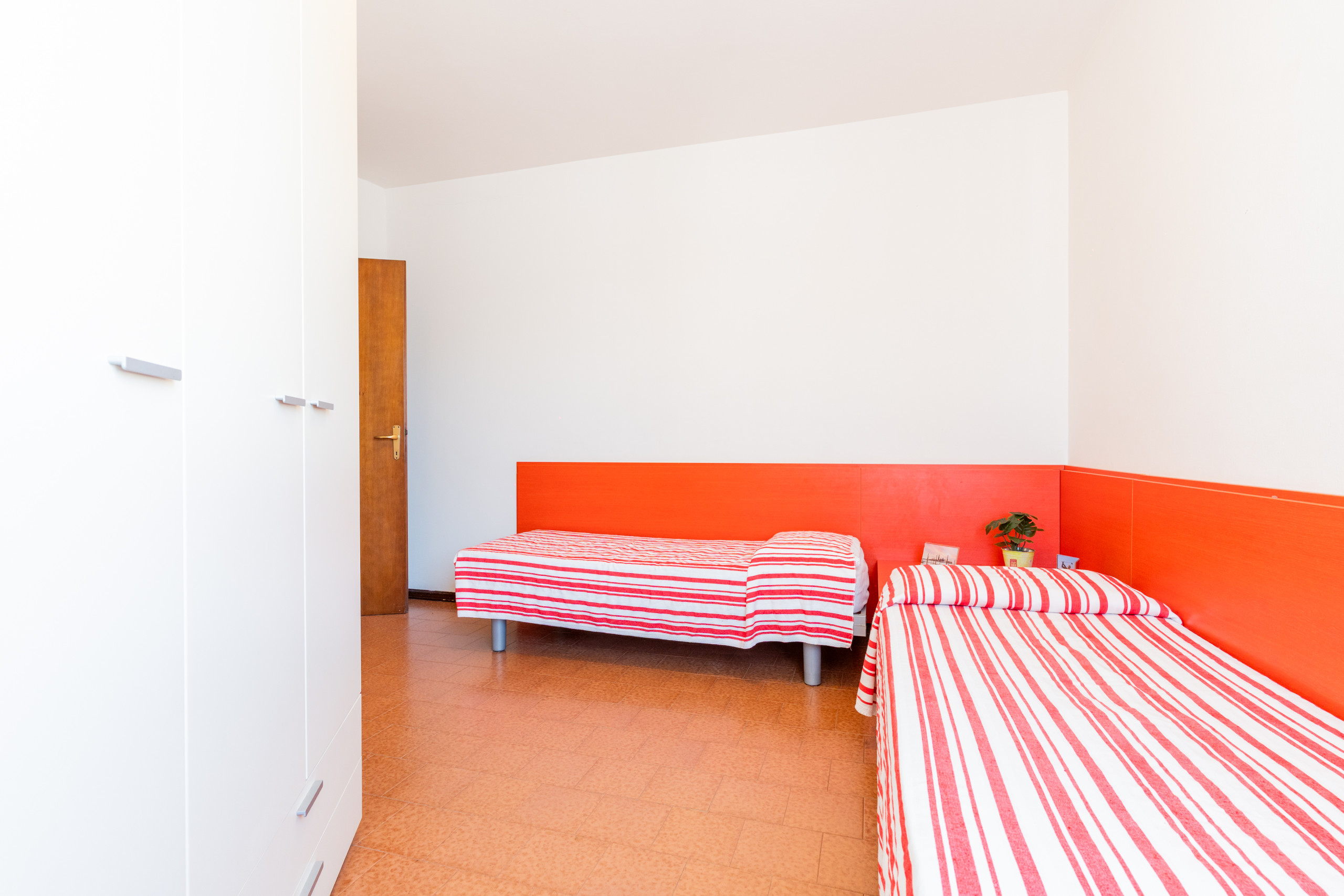 The interiors consist of a living room with an equipped kitchenette and a double sofa bed, a double bedroom, a second room with two single beds and a bathroom with a shower curtain.