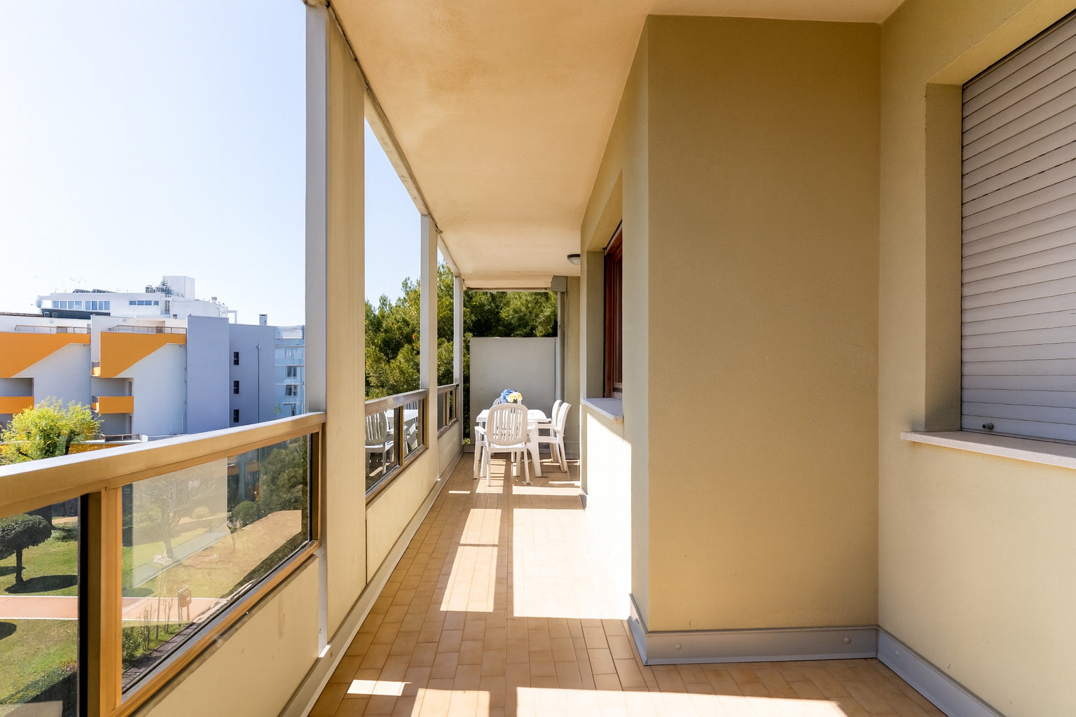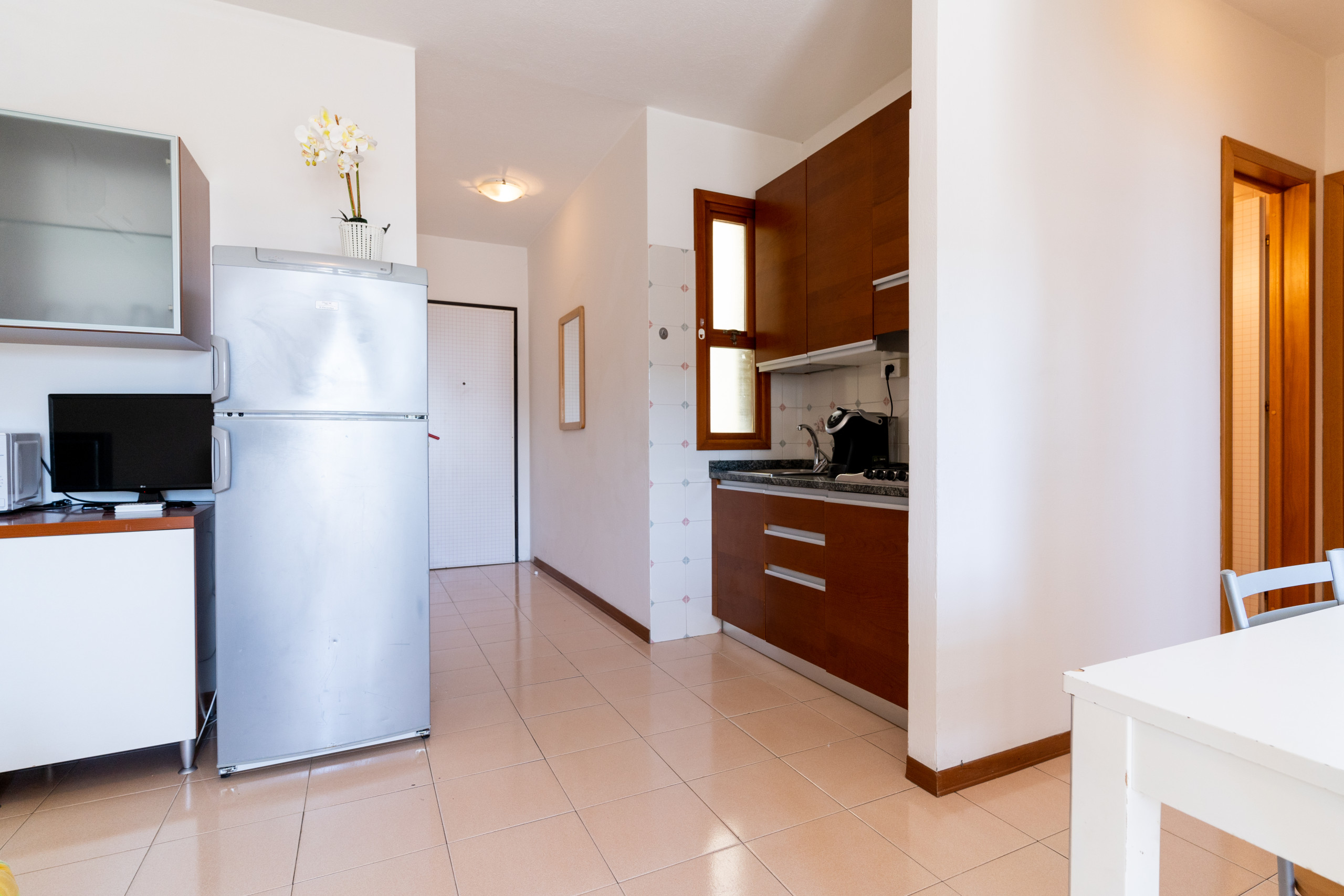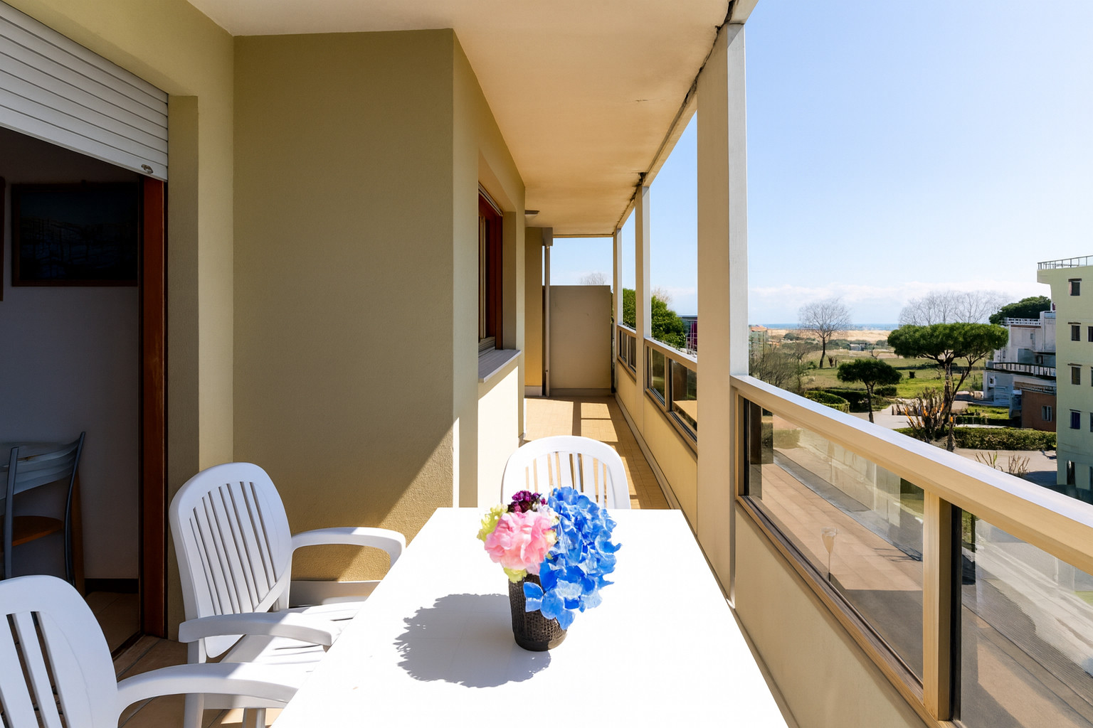 The renovated three-room apartments, located between the second and third floors, offer spacious terraces or balconies facing south or north-west, ideal for enjoying a coffee in the sun or an outdoor dinner while admiring different views of Bibione.