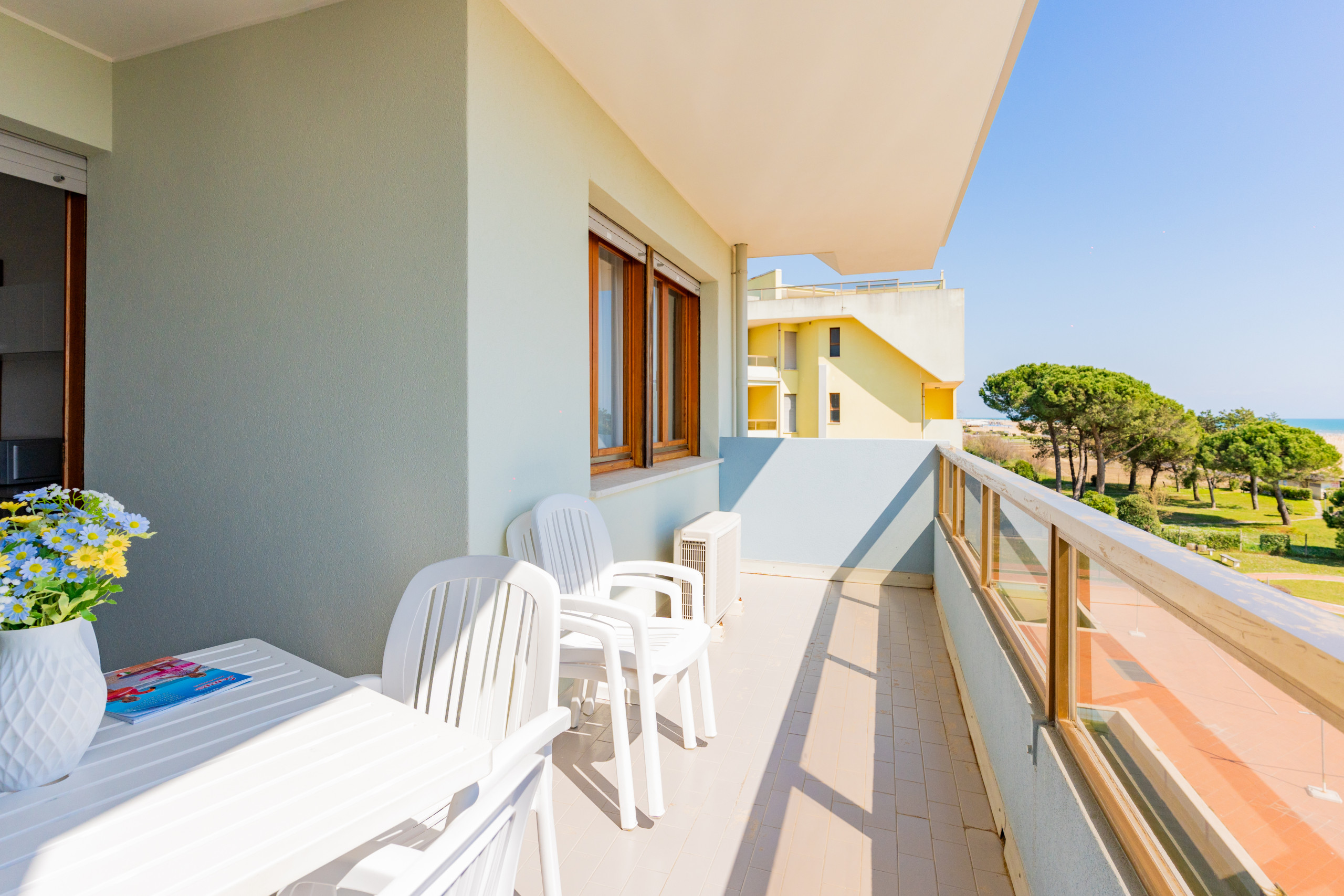 The renovated three-room apartments, located between the second and third floors, offer spacious terraces or balconies facing south or north-west, ideal for enjoying a coffee in the sun or an outdoor dinner while admiring different views of Bibione.