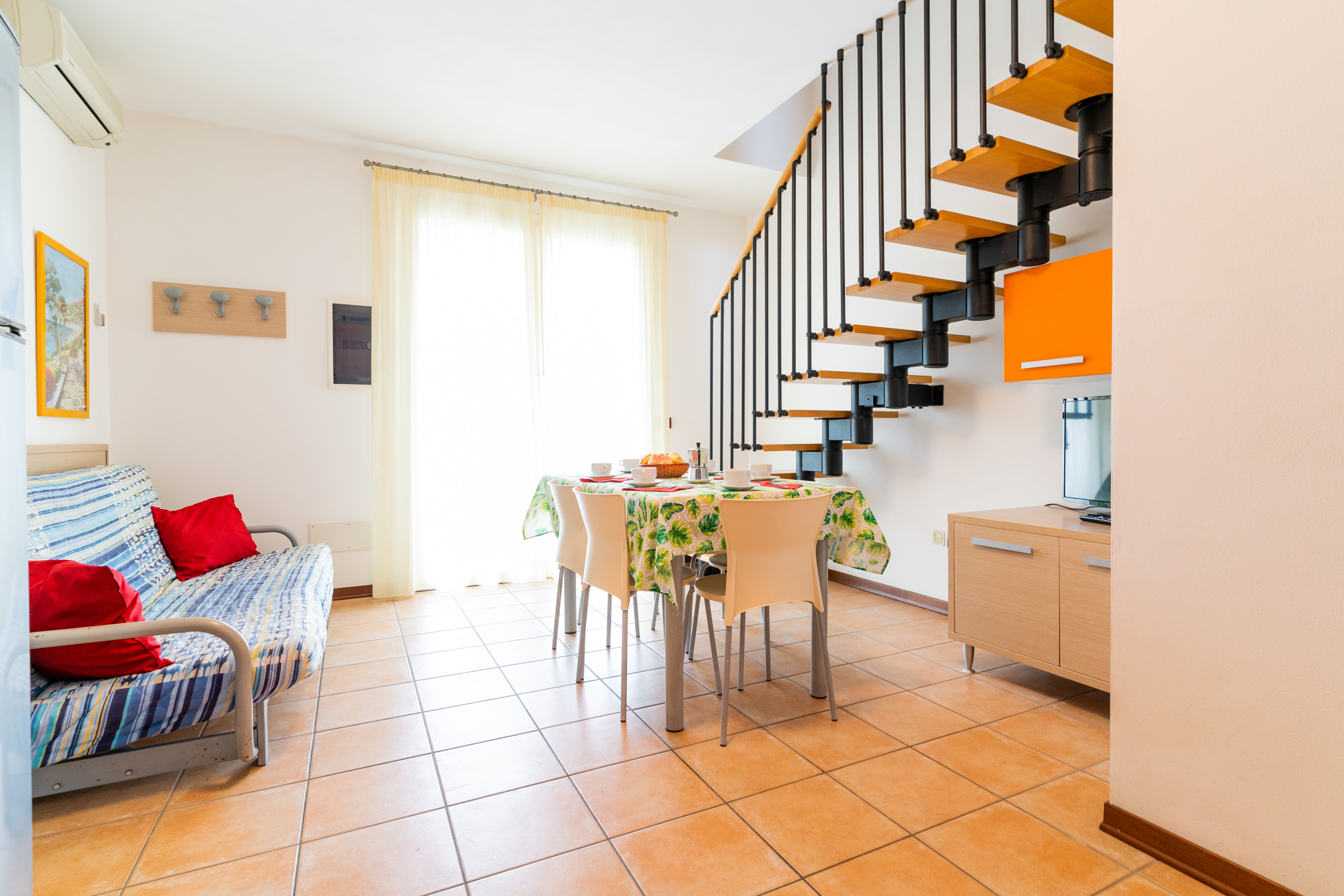 Each small villa (55 sq m) is arranged on two floors: on the ground floor we find a living room with a kitchenette and a comfortable French double sofa bed, and a bathroom with only WC and sink;