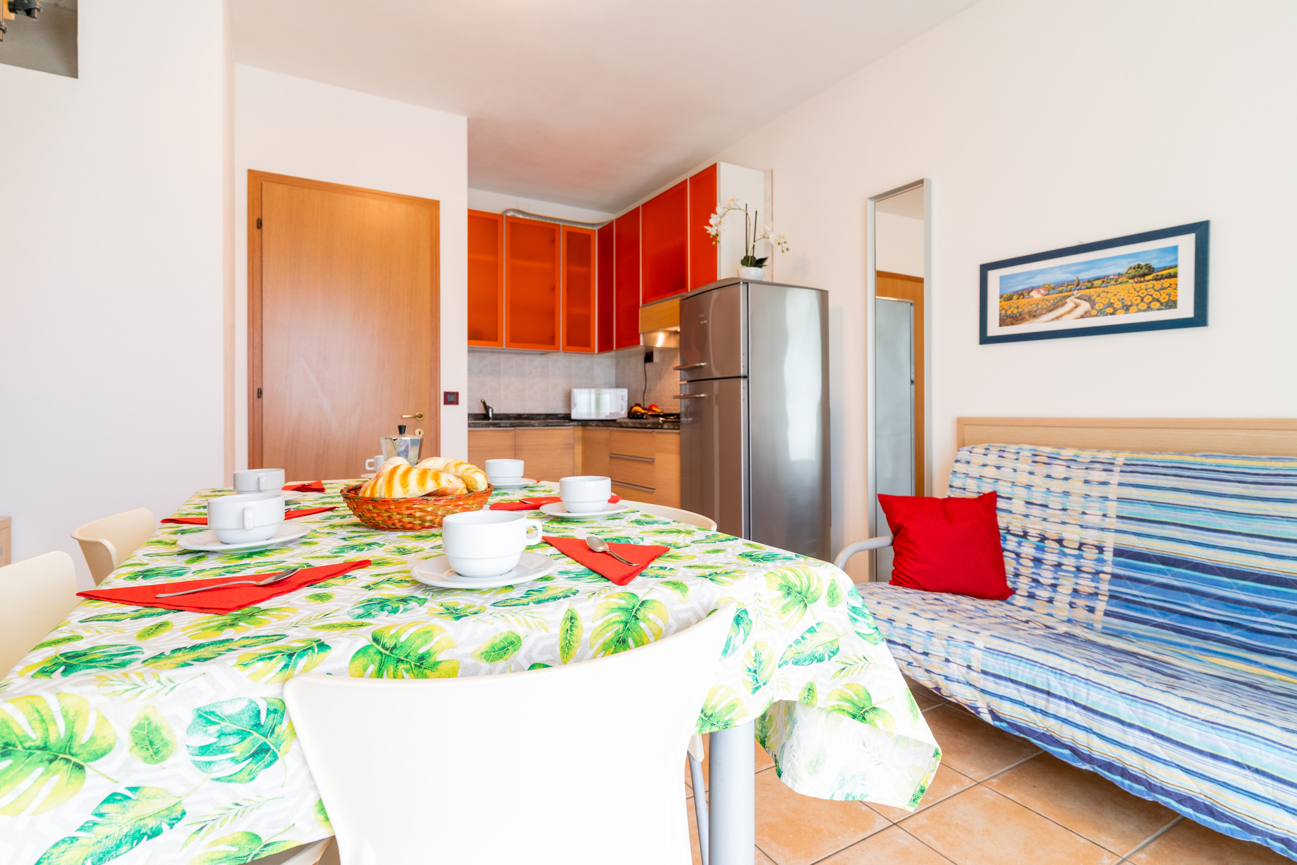 • bright living room with equipped kitchenette, dining table, French sofa bed and access to terrace or balcony;