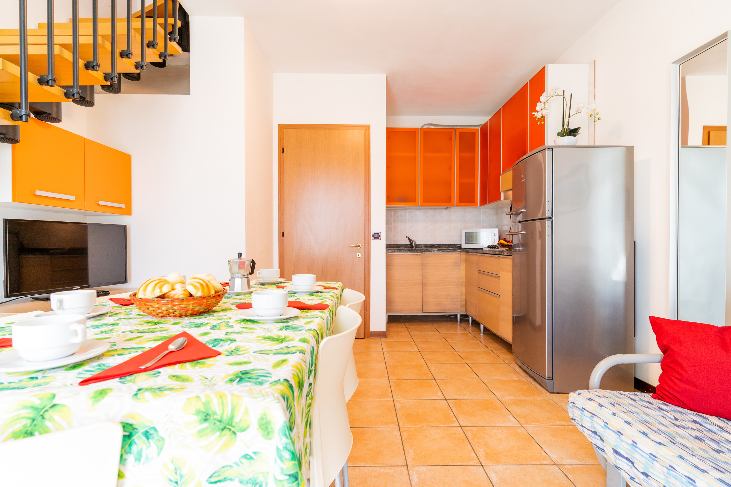 Free Wi-Fi in common areas. Each two-room villa (45 sqm) is spread over two floors: on the ground floor we find a living room with a kitchenette and a comfortable French-style sofa bed; on the first floor a bedroom with a balcony, equipped with a double bed and a single bed, and a spacious bathroom with a shower cubicle. The villas are provided with everything necessary for cooking (fridge with freezer, microwave), satellite TV, air conditioning and safe.