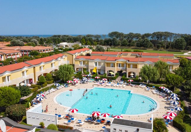 All apartments are developed on a single level and some offer views of the swimming pool while others have side views. The living room has an equipped kitchenette, table, chairs and a French double sofa bed, with access to the balcony or garden, ideal for outdoor lunches and dinners. The main bedroom is furnished with a double bed and a single bed, while the second bedroom offers two single beds. The bathroom is spacious and equipped with a shower enclosure.