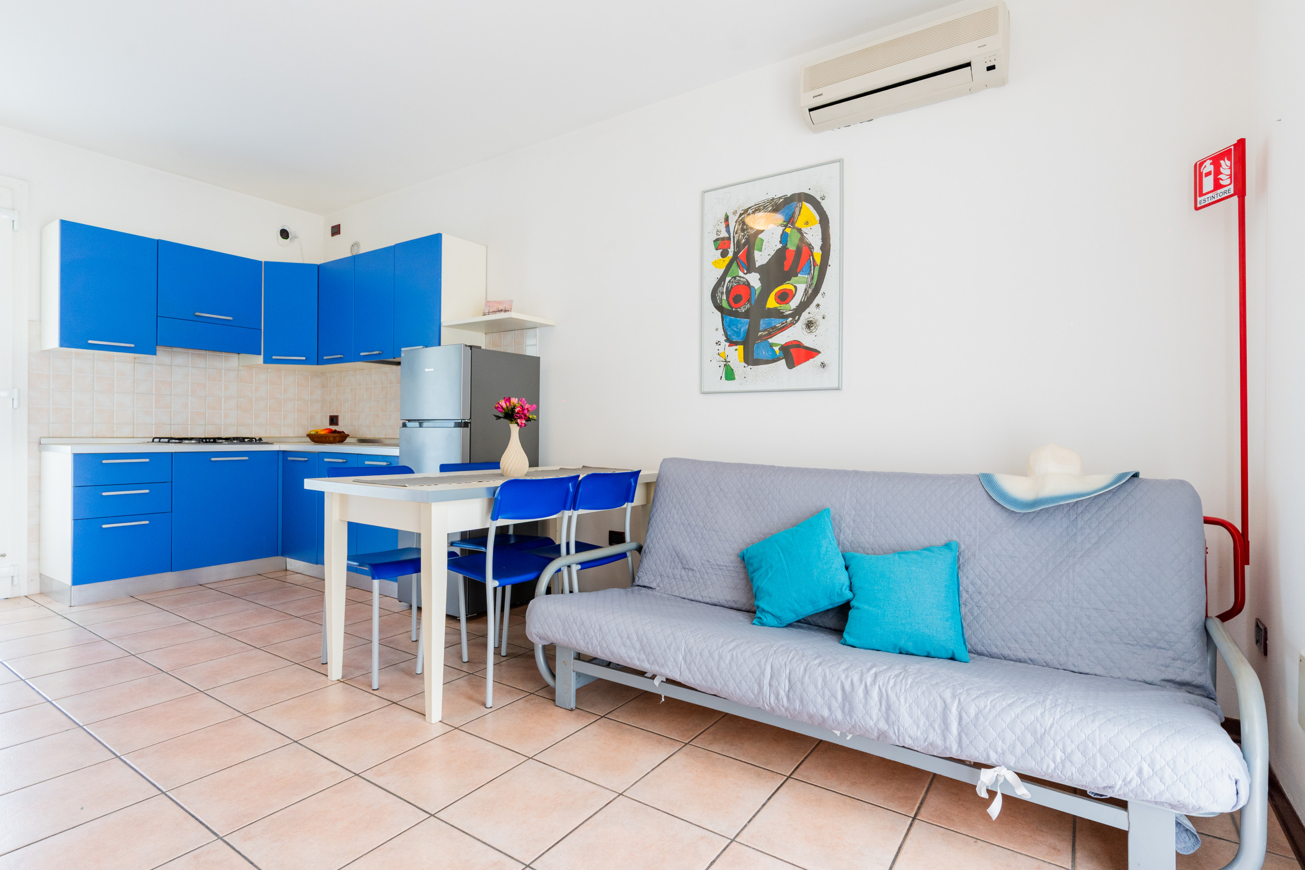 Inside, the three-room apartments of about 50 sqm consist of a master bedroom, a double bedroom and a living room with an equipped kitchenette and a double sofa bed. The bathroom is modern and equipped with a shower cubicle.