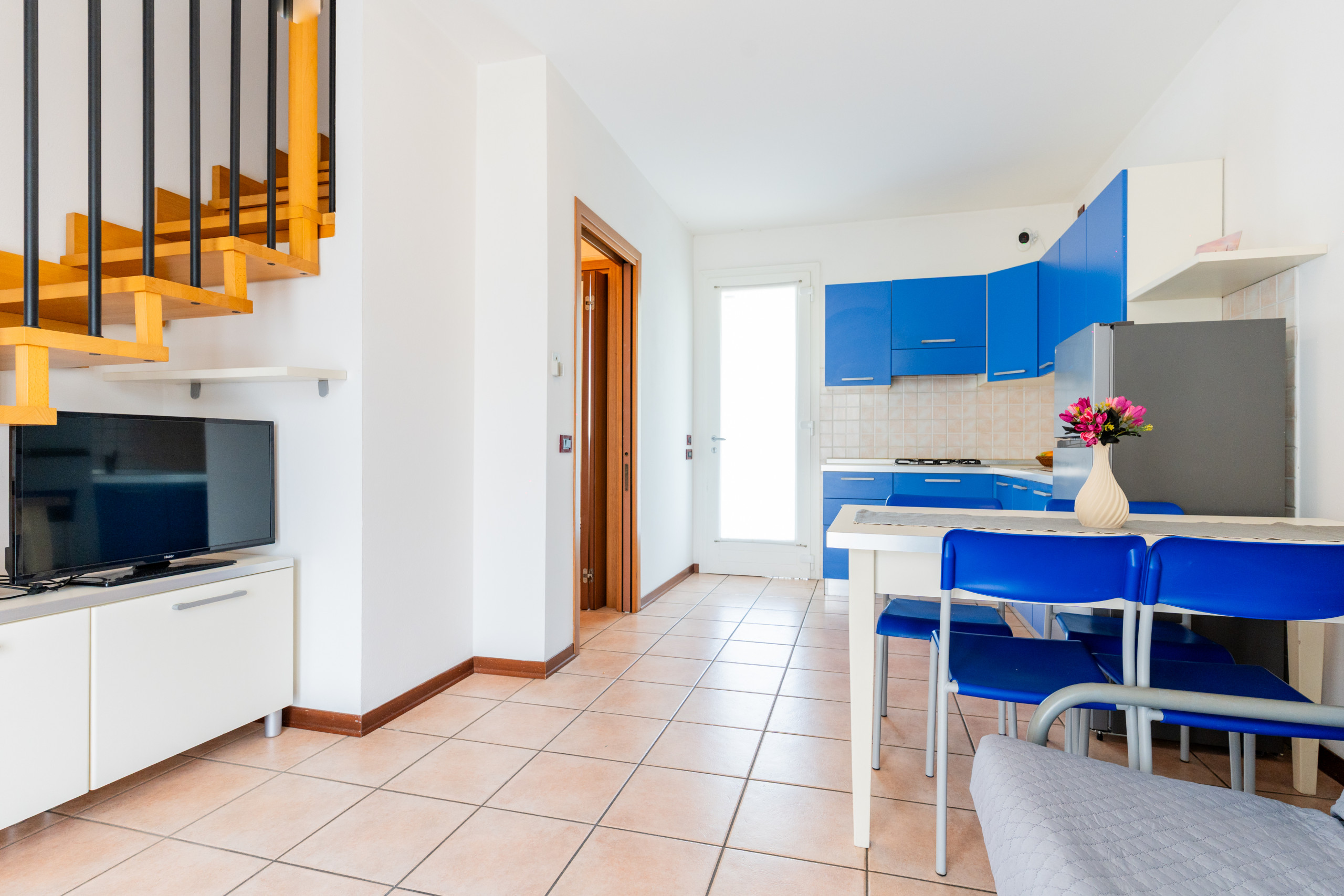 The three-room apartment, located on the ground floor, can accommodate up to 6 people and offers welcoming and bright spaces. It consists of a living room with an equipped kitchenette and a double sofa bed, a private garden ideal for lunches or outdoor relaxation moments, a bathroom with shower, a double bedroom with a third bed, and a small room with a single bed.