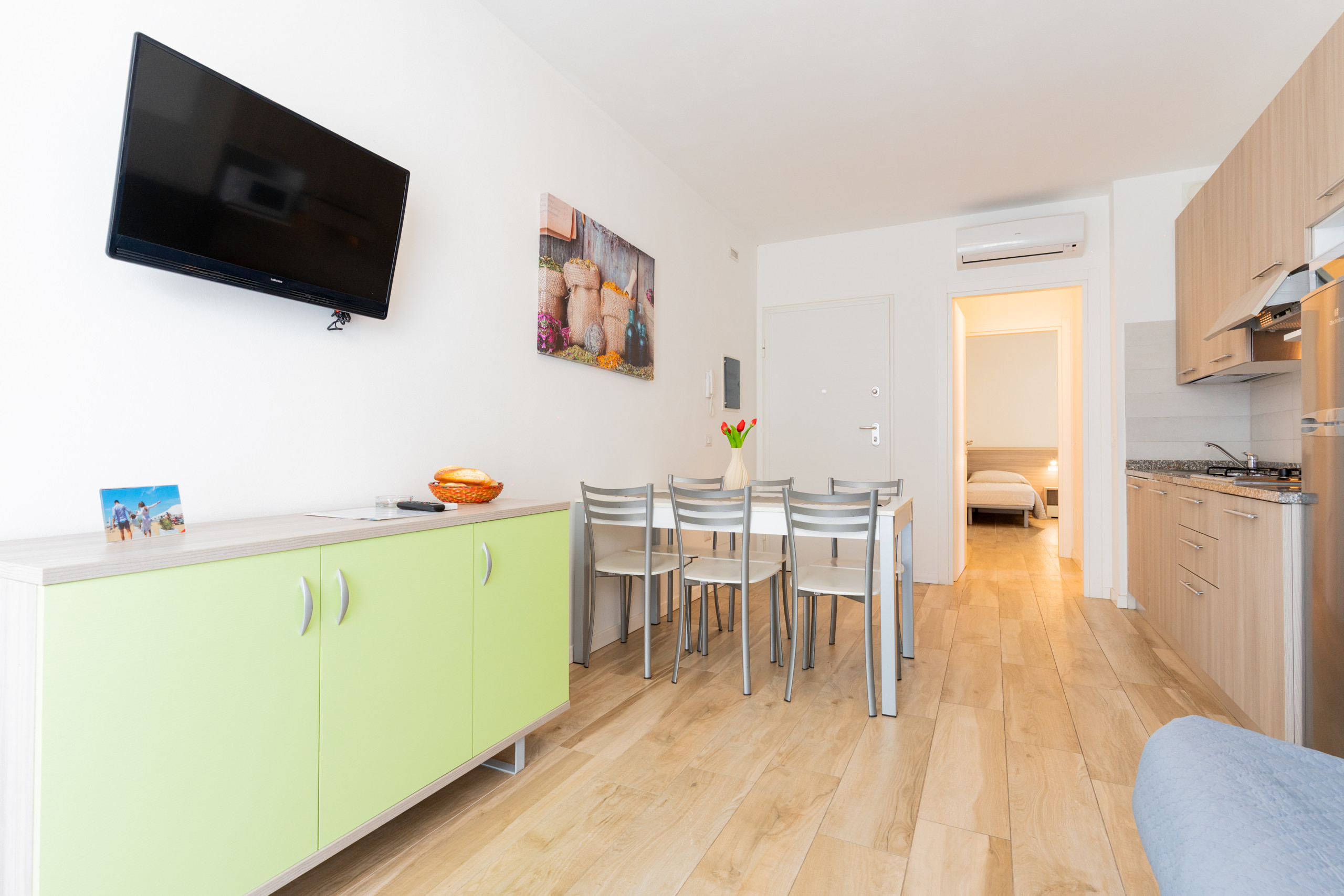 • bright living room with equipped kitchenette, dining table, French sofa bed and access to terrace or balcony;