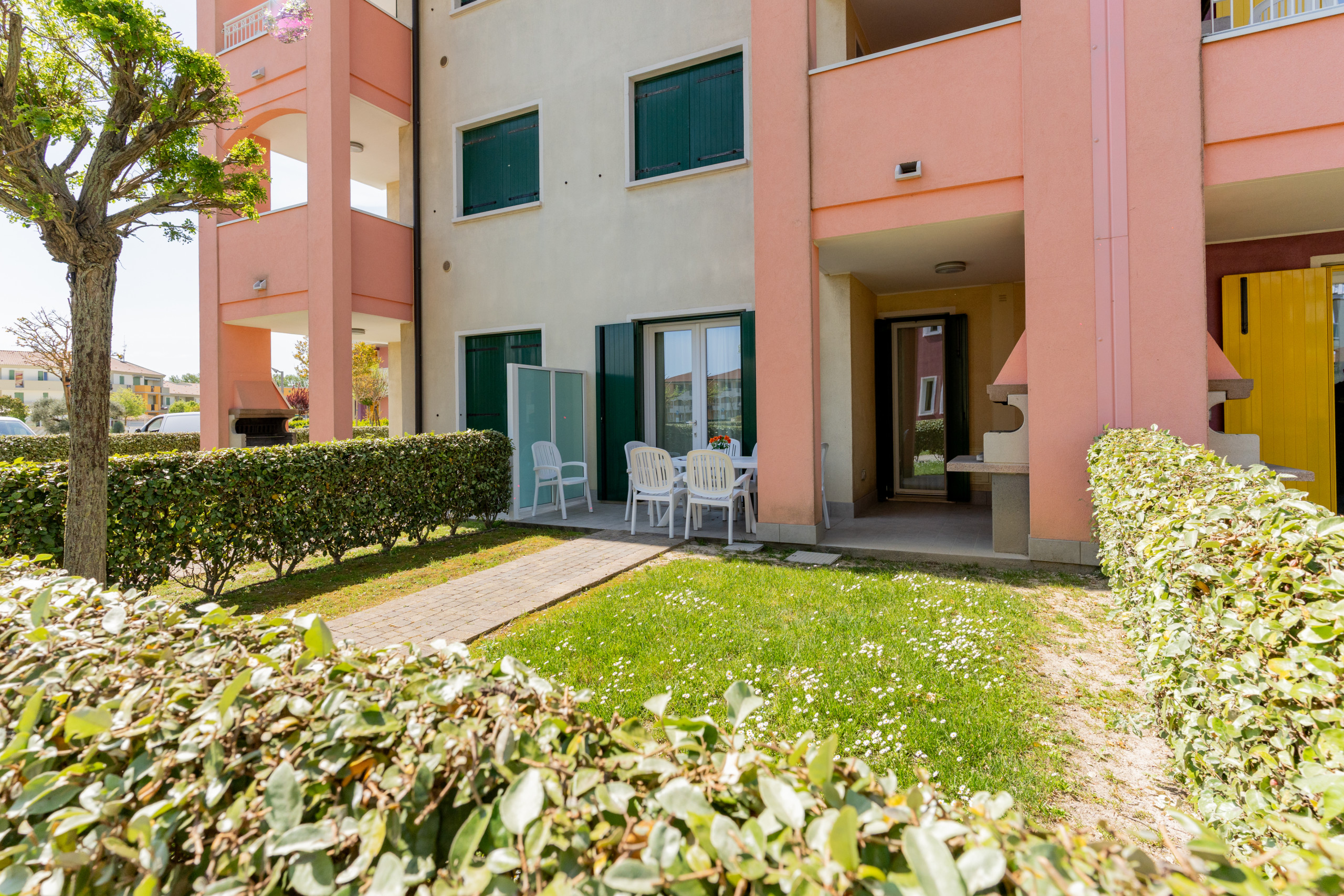 Welcome to the Ai Carpini Village, our splendid modern three-room apartments of 67 sqm located on the ground floor, are ideal for a stay characterised by comfort and tranquillity. These accommodations offer a private garden, with some equipped with a personal BBQ, for an outdoor relaxation experience.