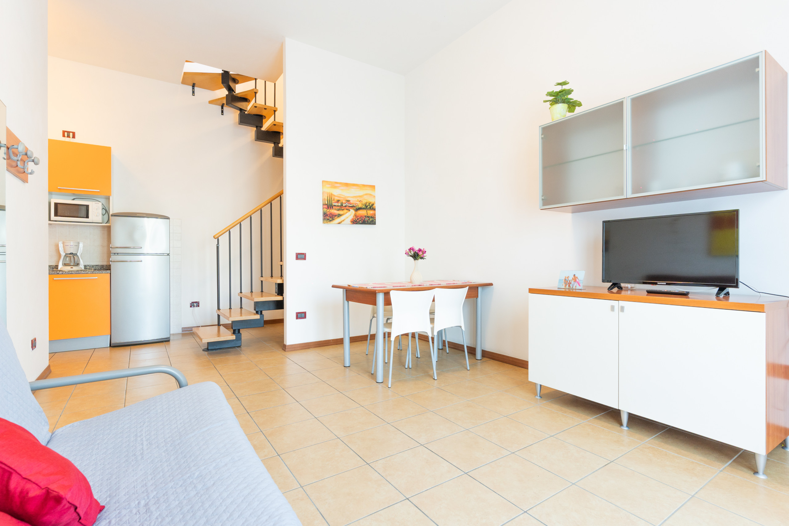 Each small villa (45 sq m) is arranged on two floors: on the ground floor we find a living room with a kitchenette and a comfortable French-style sofa bed;