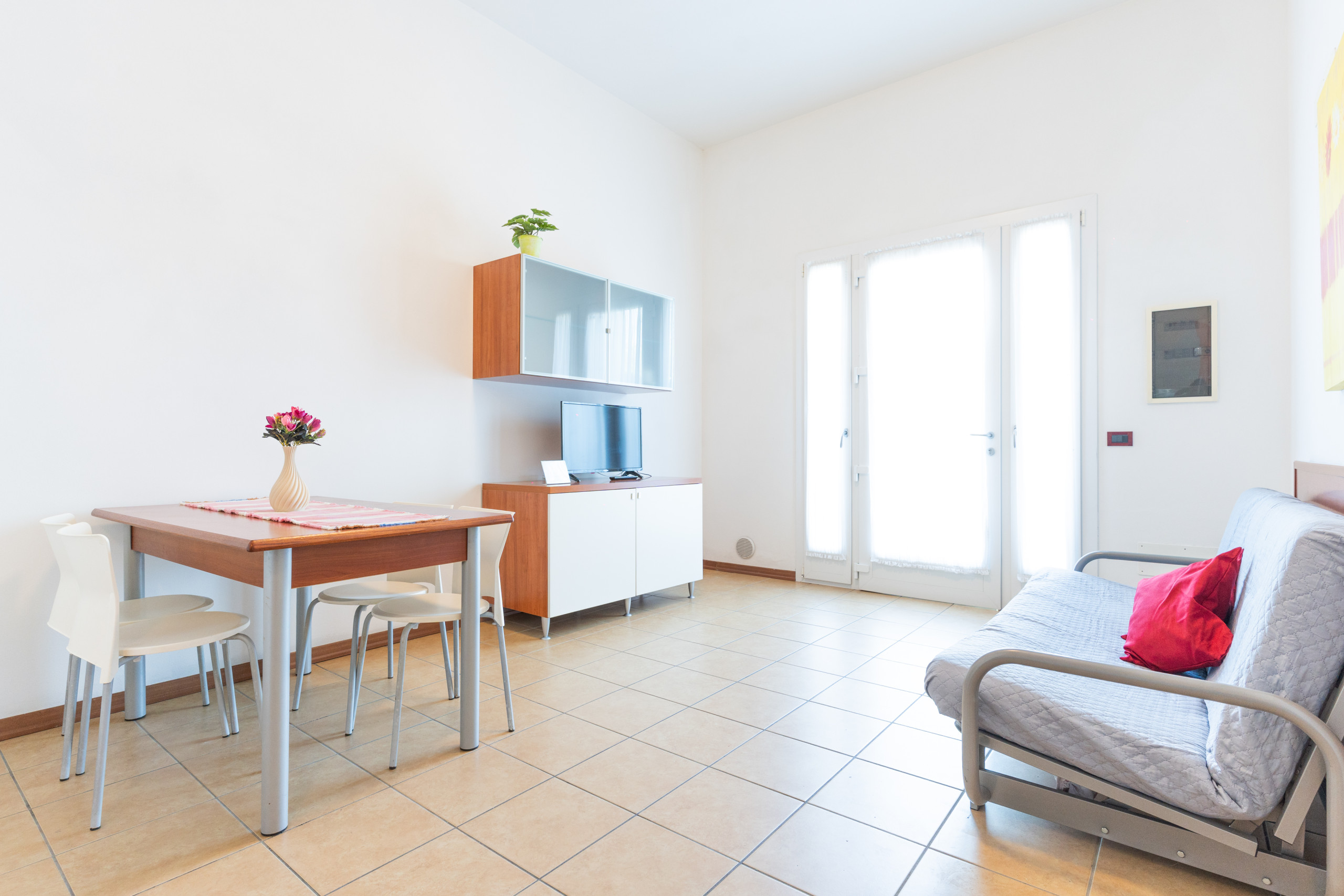 1 bedroom villa on 2 floors. Ground floor: garden, Kitchenette and double sofabed. On the first floor: 1 bathroom, bedroom with double and single bed. "La Quercia" arcade is a real meeting point the entire holiday village area of Caorle Lido Altanea: a wide square, shops, bars, restaurant and many other commercial activities overlooking the covered pedestrian gallery. A spectacular elevated and lighted swimming pool, offers a special setting to this village made of 22 shops and 84 apartments. Fee-paying beach service available (information in Lampo office in Caorle Lido Altanea).