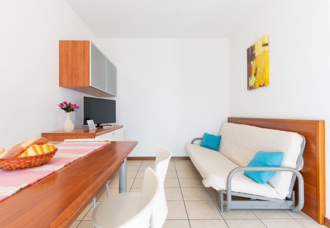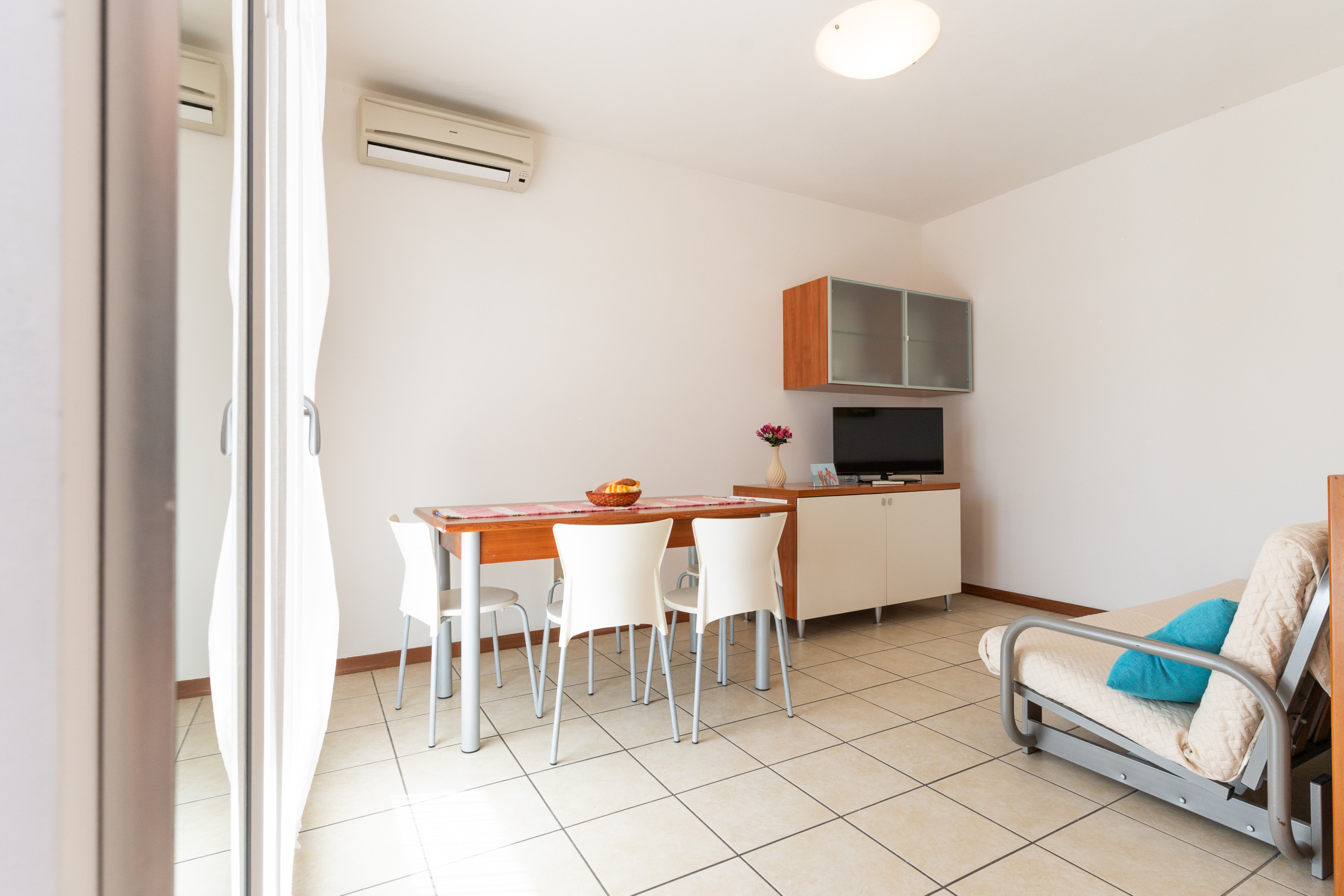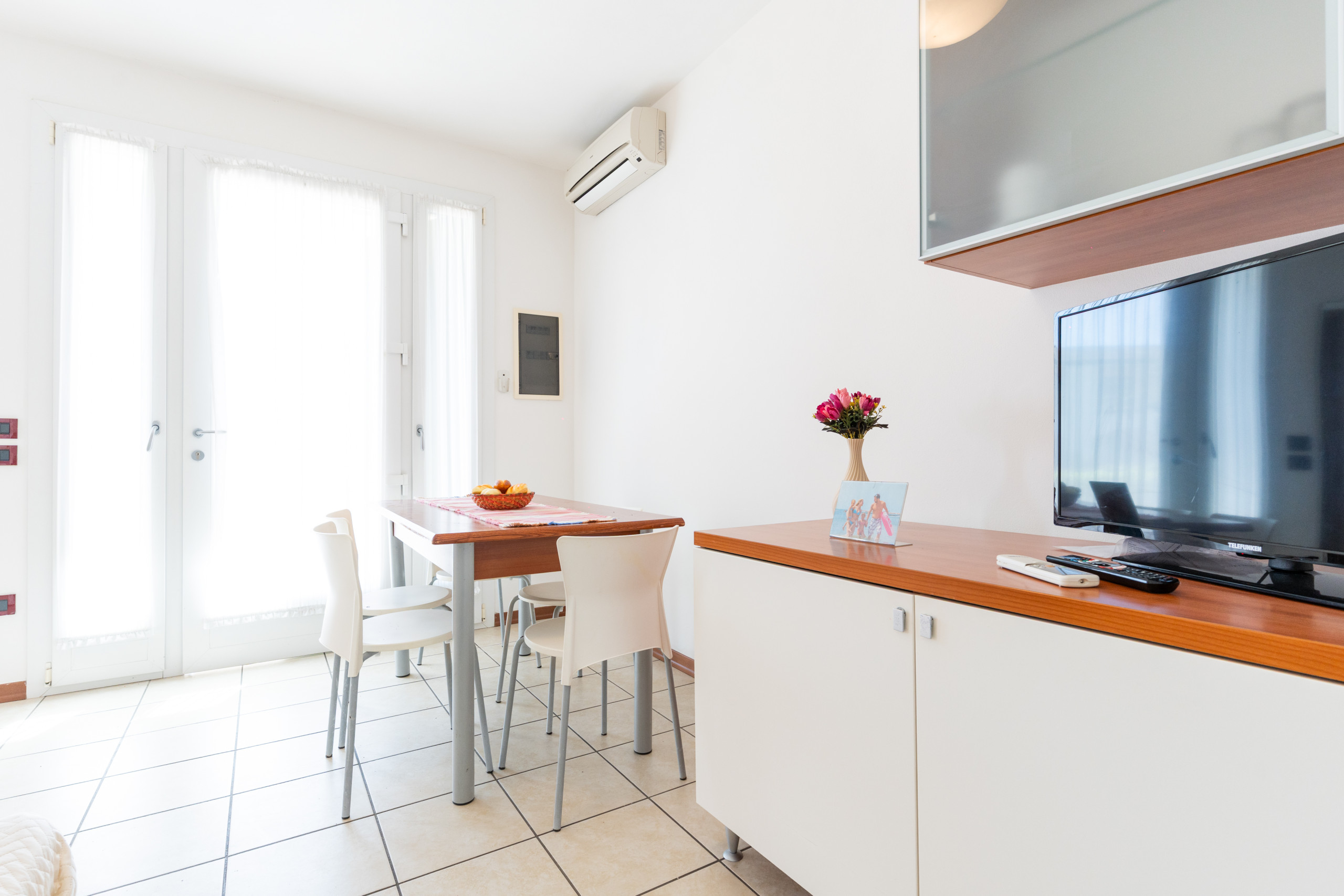 The three-room apartment, located on the ground floor, can accommodate up to 6 people and offers welcoming and bright spaces. It consists of a living room with an equipped kitchenette and a double sofa bed, a private garden ideal for lunches or outdoor relaxation moments, a bathroom with shower, a double bedroom with a third bed, and a small room with a single bed.