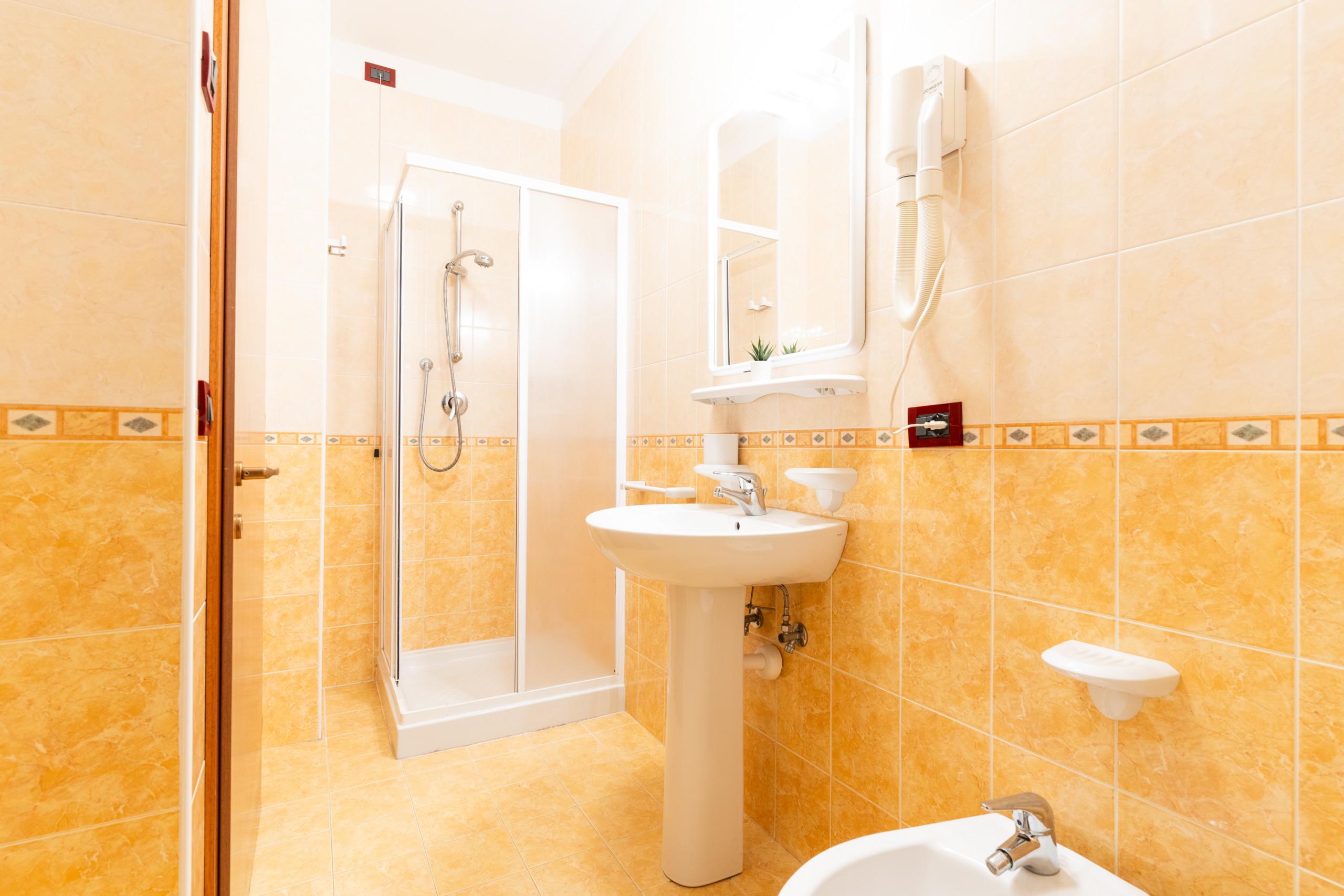 - First floor, accessible via internal stairs: two bedrooms (some with balcony) one furnished with a double bed, the second with two single beds, and two modern bathrooms, of which only one with a shower enclosure.
