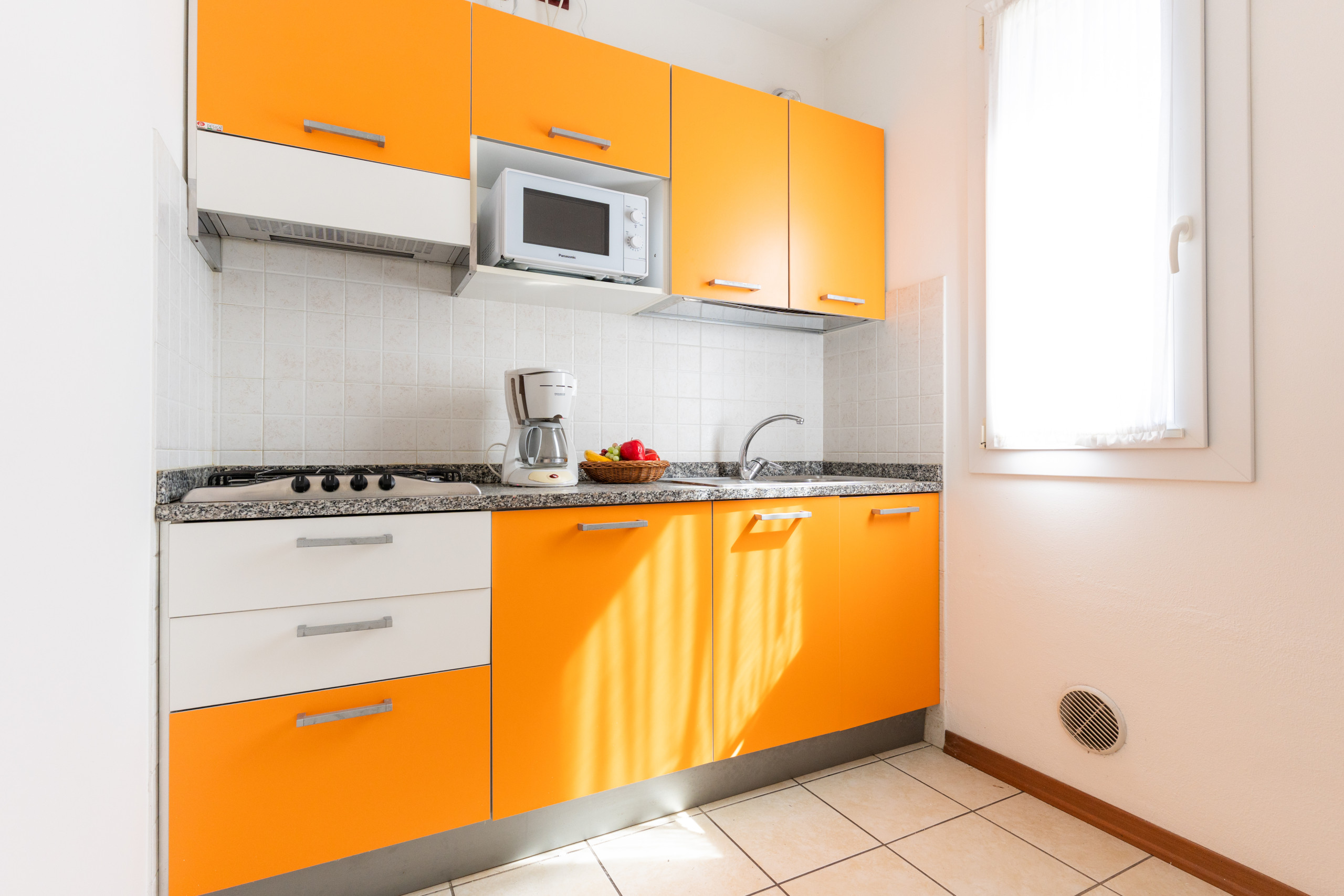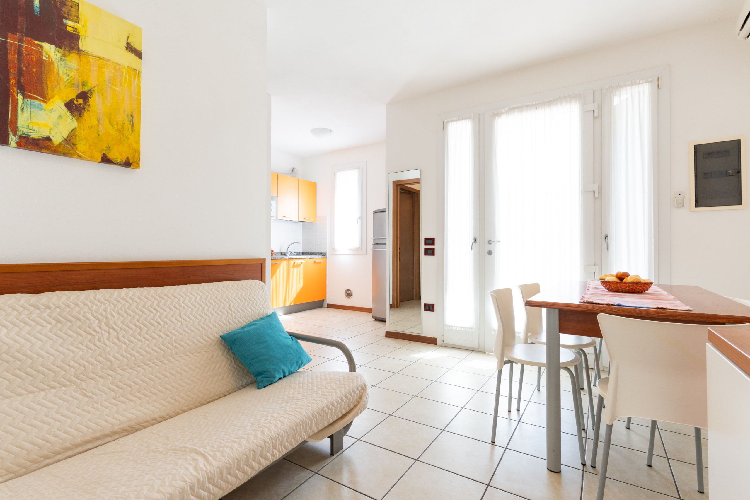 Inside, the three-room apartments of about 50 sqm consist of a master bedroom, a double bedroom and a living room with an equipped kitchenette and a double sofa bed. The bathroom is modern and equipped with a shower cubicle.