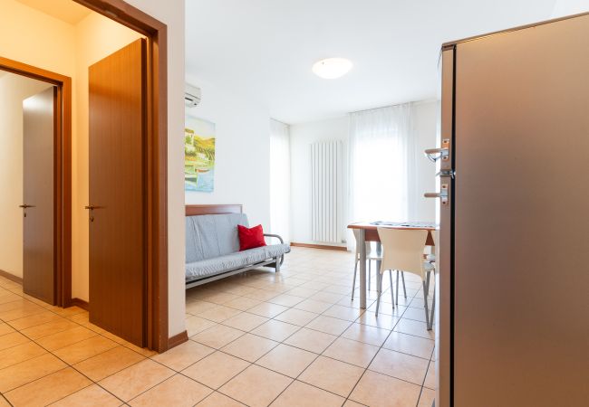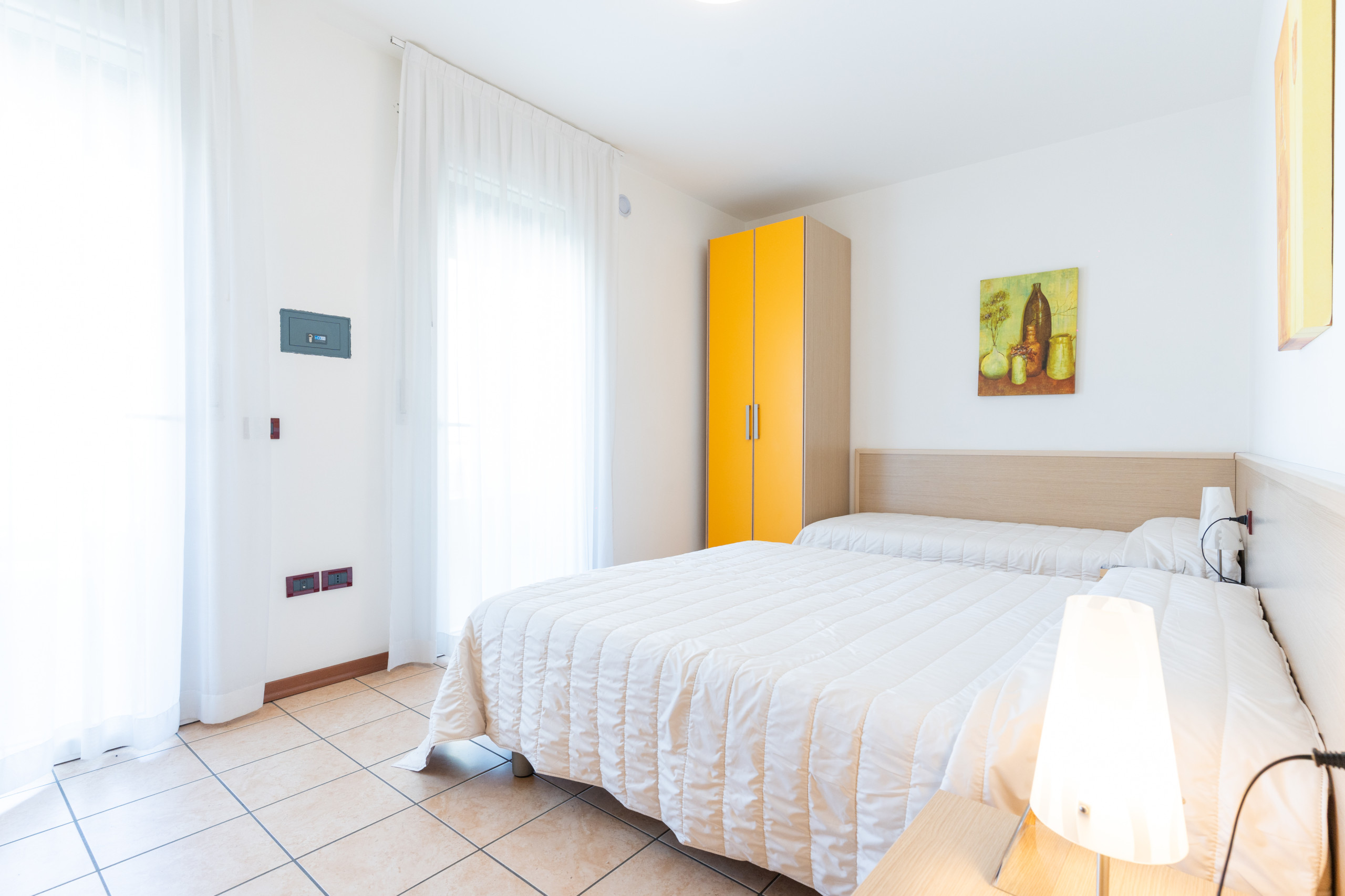 All apartments are developed on a single level and some offer views of the swimming pool while others have side views. The living room has an equipped kitchenette, table, chairs and a French double sofa bed, with access to the balcony or garden, ideal for outdoor lunches and dinners. The main bedroom is furnished with a double bed and a single bed, while the second bedroom offers two single beds. The bathroom is spacious and equipped with a shower enclosure.