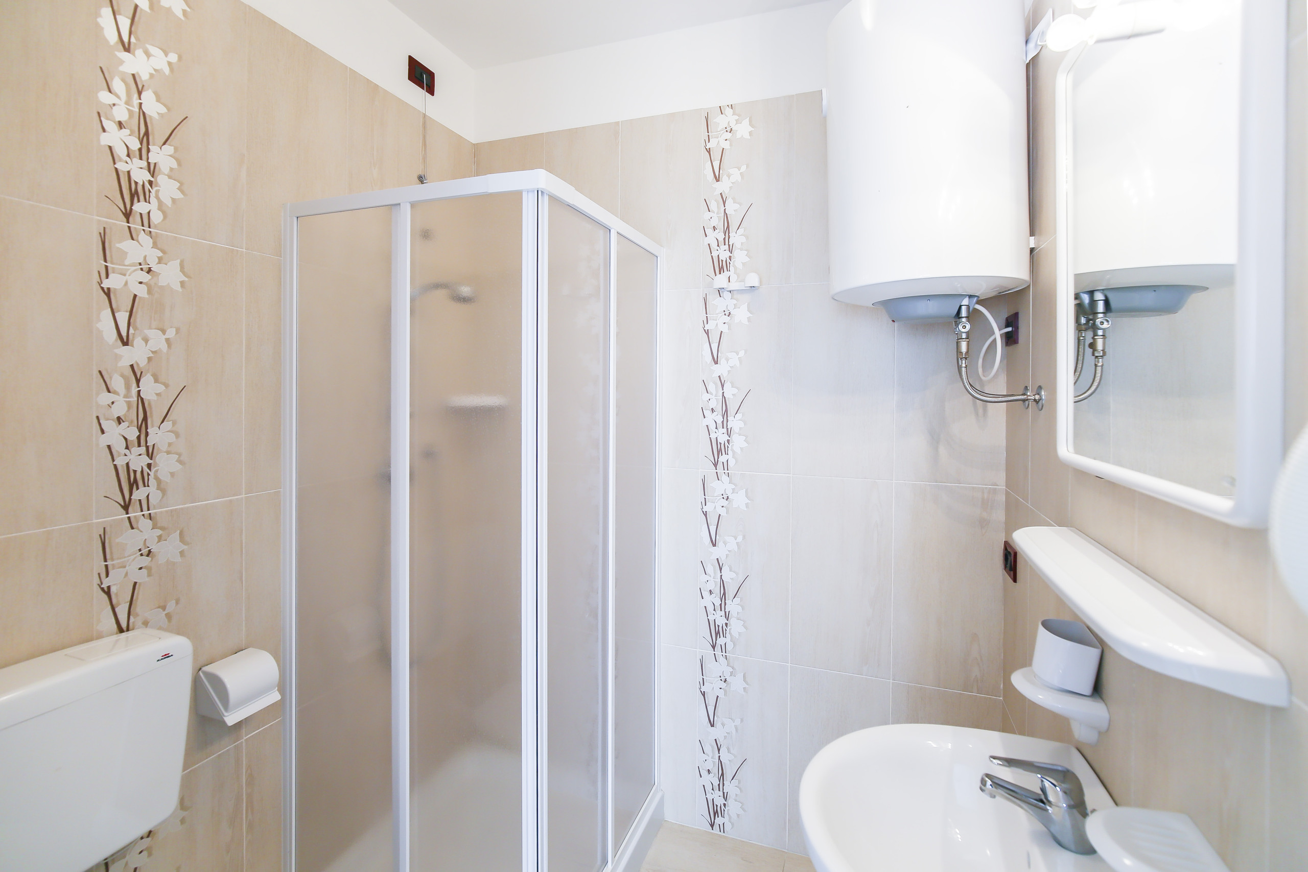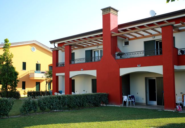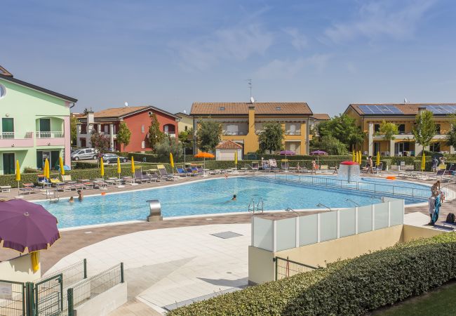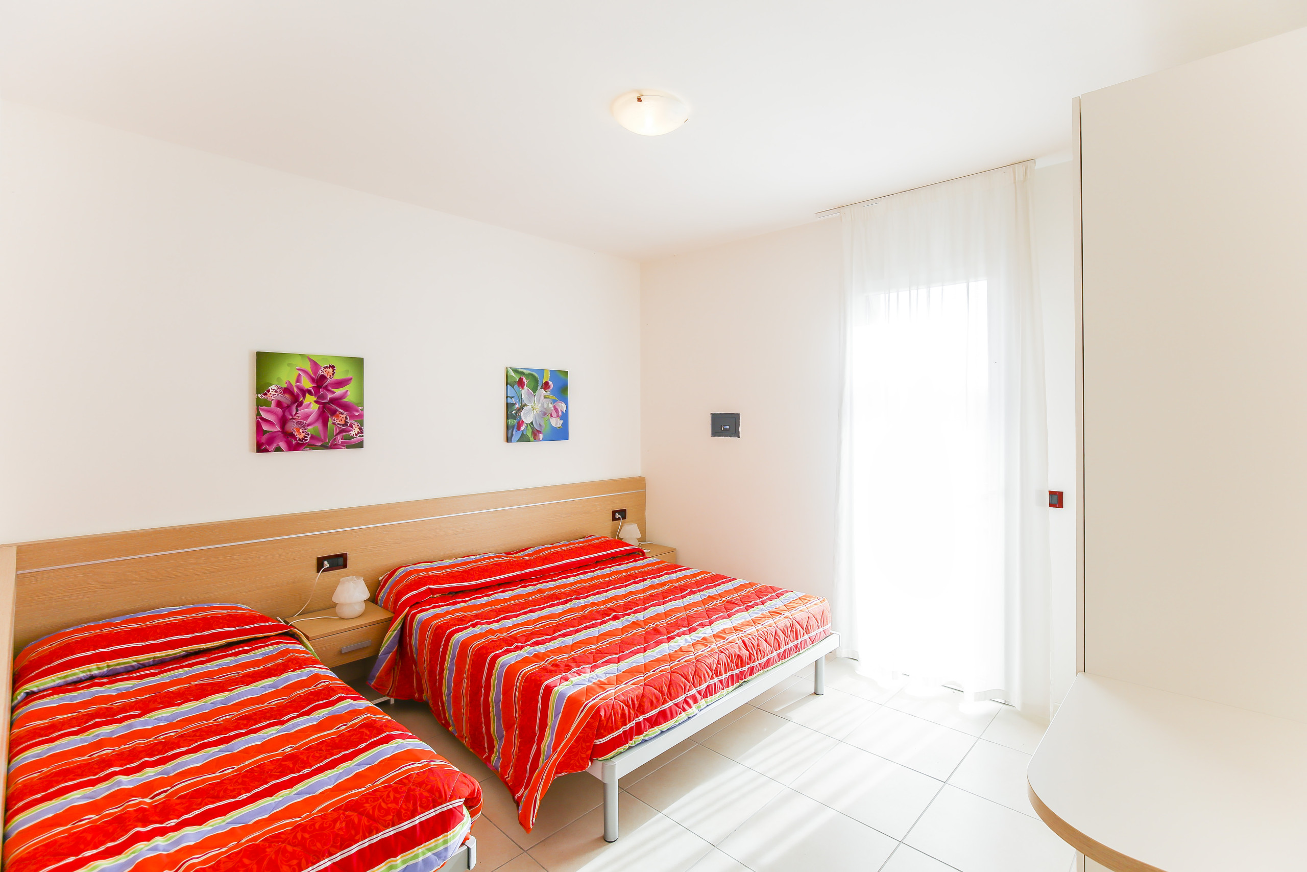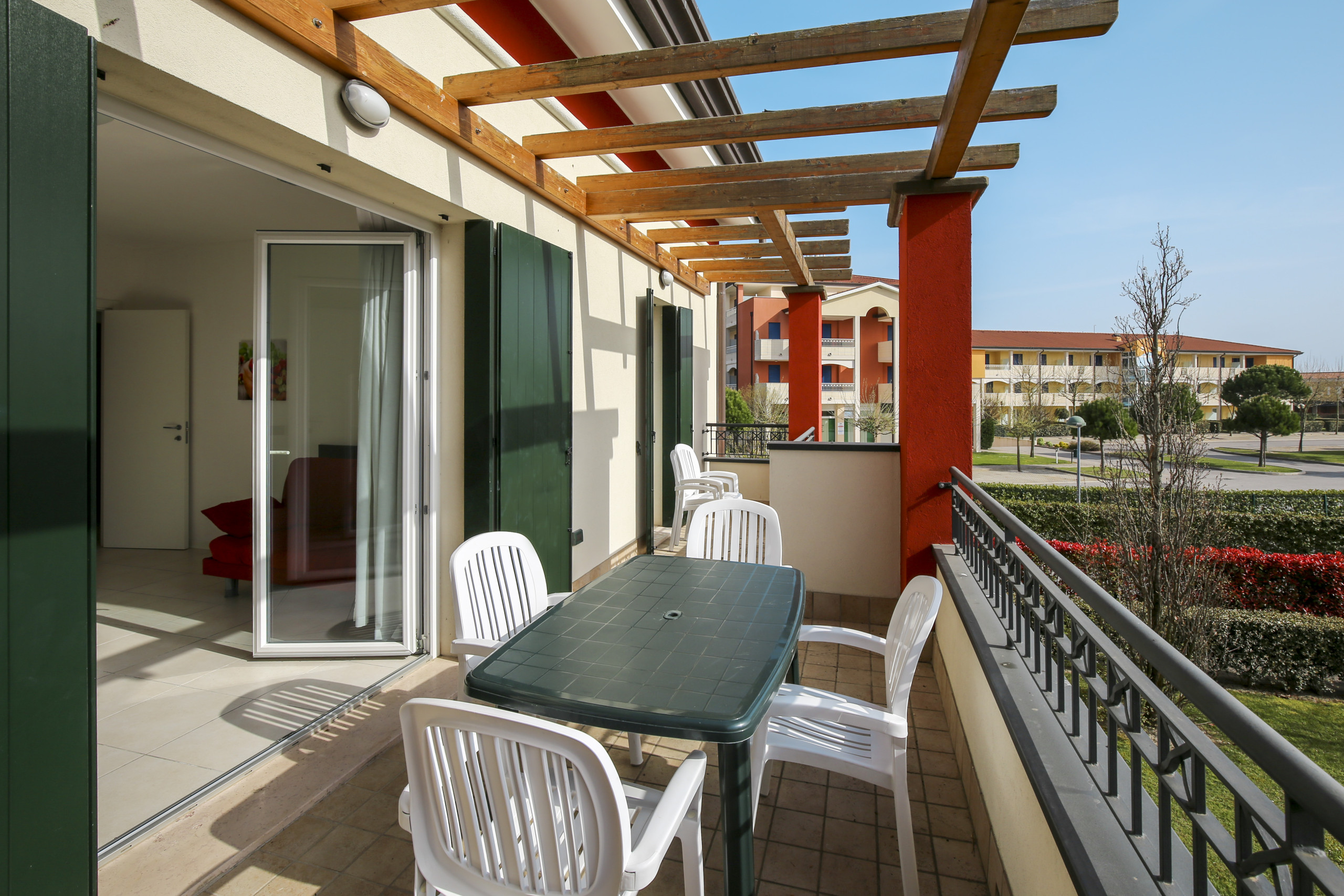 All apartments are developed on a single level and some offer views of the swimming pool while others have side views. The living room has an equipped kitchenette, table, chairs and a French double sofa bed, with access to the balcony or garden, ideal for outdoor lunches and dinners. The main bedroom is furnished with a double bed and a single bed, while the second bedroom offers two single beds. The bathroom is spacious and equipped with a shower enclosure.