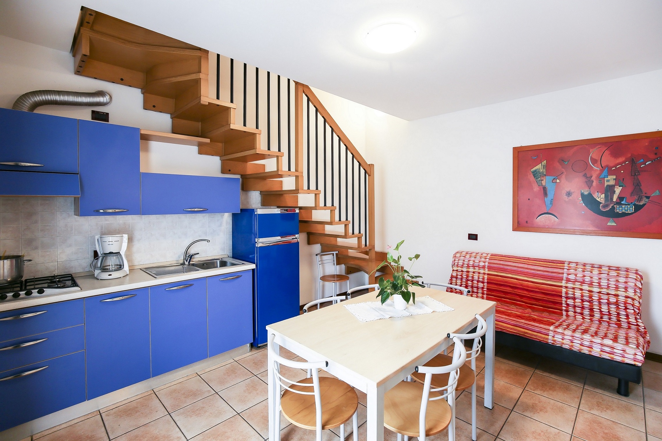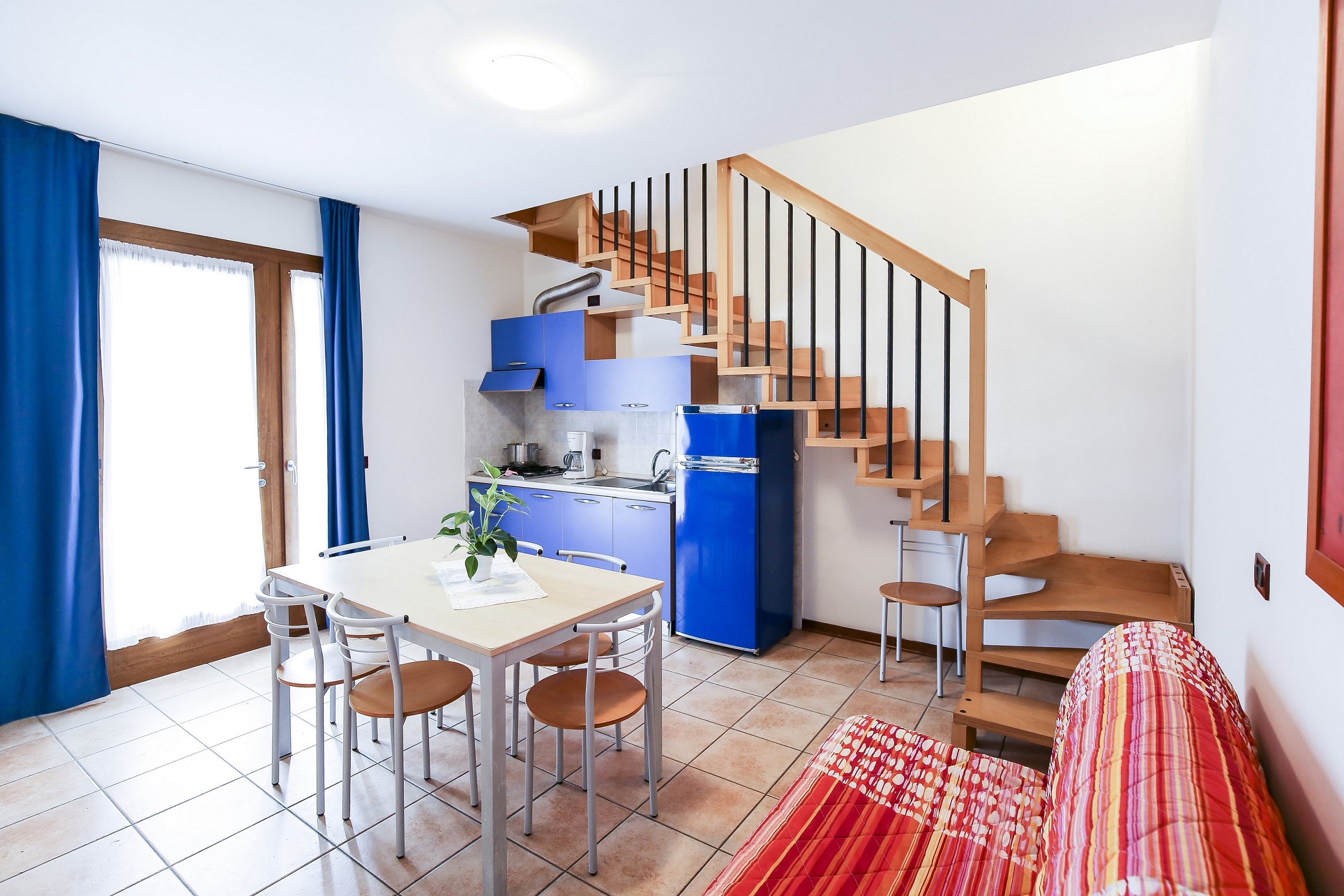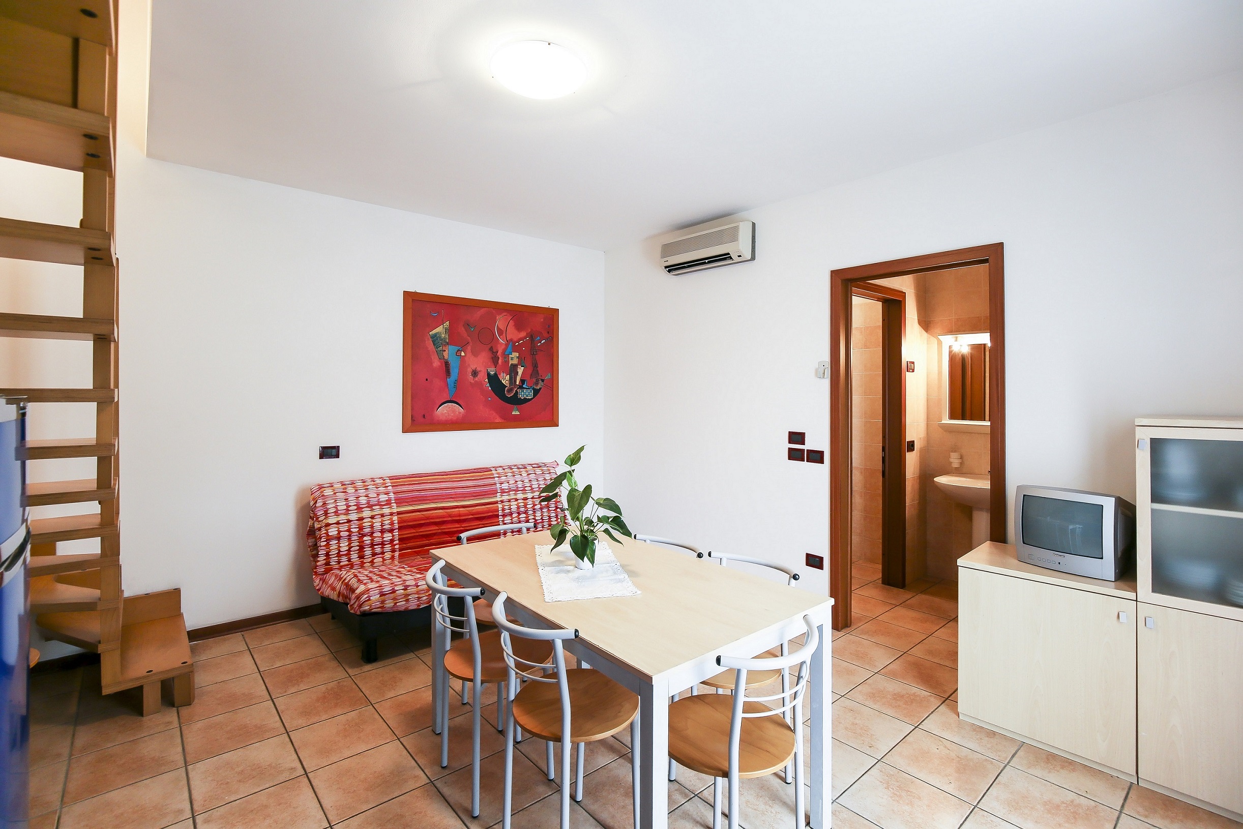 • bright living room with equipped kitchenette, dining table, French sofa bed and access to terrace or balcony;