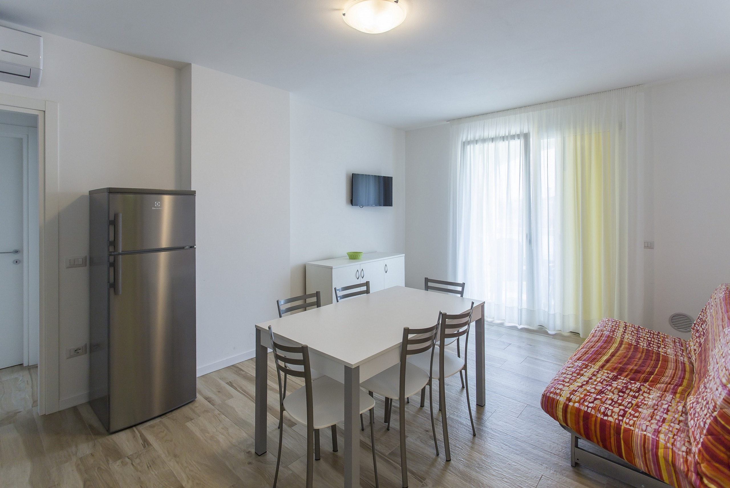 • bright living room with equipped kitchenette, dining table, French sofa bed and access to terrace or balcony;