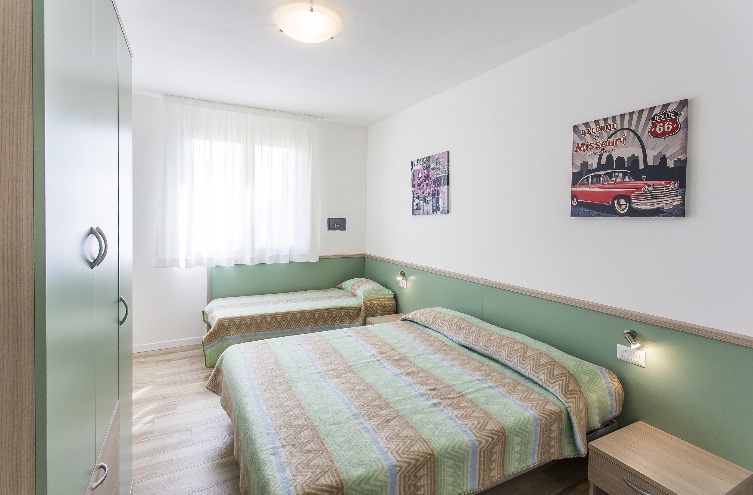 All apartments are developed on a single level and some offer views of the swimming pool while others have side views. The living room has an equipped kitchenette, table, chairs and a French double sofa bed, with access to the balcony or garden, ideal for outdoor lunches and dinners. The main bedroom is furnished with a double bed and a single bed, while the second bedroom offers two single beds. The bathroom is spacious and equipped with a shower enclosure.