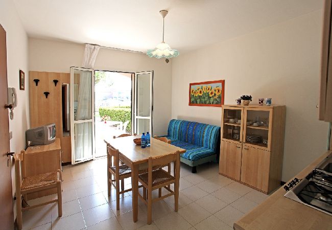 Two-room flat with garden, composed of bedroom with double bed and single bed, living room with kitchen corner and double bed sofa, bathroom. ALBATROS EST is a resort with swimming pool and lift (only in the stair house E) and it's situated by the marina "Darsena dell'Orologio", nearby the city centre, 800 meters from the beach. It consists of different sizes of apartments, some with garden, other with or without balcony. Each one has a private parking place.