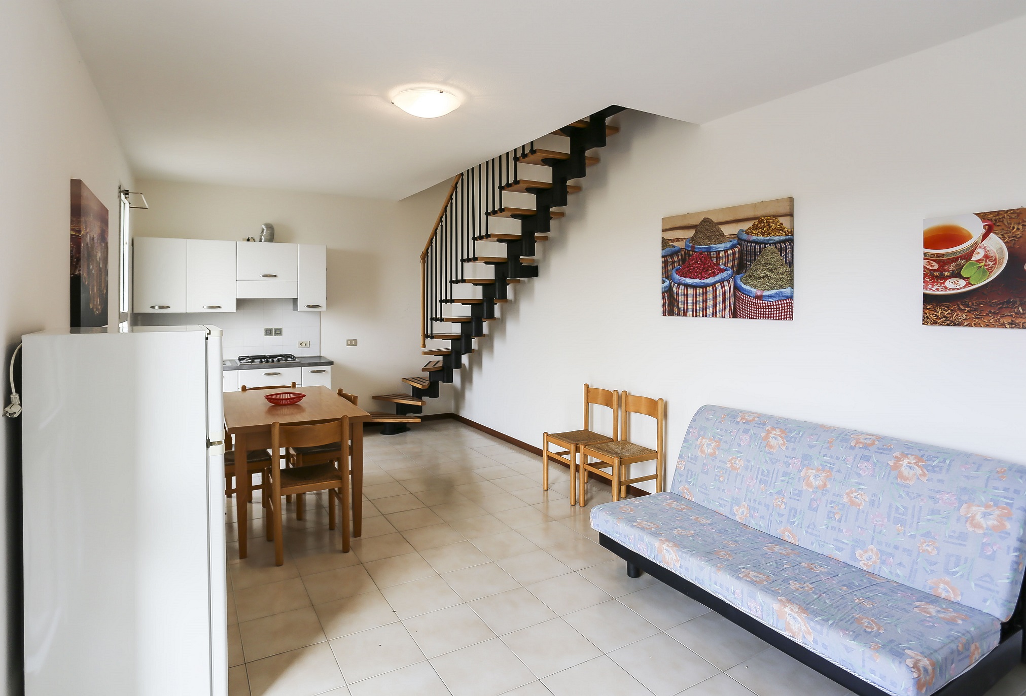 Two-floor terraced house with balcony and garden with outside fireplace. On the ground floor living room with double bed sofa and kitchen corner. On the first floor bedroom with double bed, bedroom with two single beds, bathroom. VILLAGGIO LUNA 2 is an holiday village situated on the West Beach of Caorle, 250 meter from the sea, composed of little terraced houses, all organized in two floors, equipped with air conditioning, safe and numbered parking spaces, some with a private garden, others with a terrace. Swimming pool for adults and children sorrounded by the solarium. In the village there is also a building with lift (door width: 75 cm) with apartments of different sizes, all with balcony.