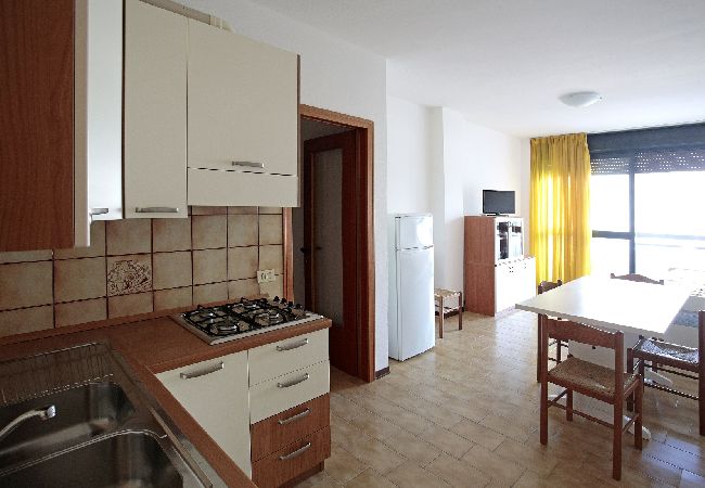 Three-room flat with balcony, composed of a bedroom with double bed, a bedroom with two single beds, living room with kitchen corner and double bed sofa, bathroom. PANFILO is a sea front building in Caorle, composed of apartments of various sizes, some with sea view, only few steps from the beach. All apartments are equipped with air conditioning and TV. Parking and lift available. On the first floor there is the restaurant/pizzeria Panfilo and on the ground floor the Lampo Agency of Caorle.