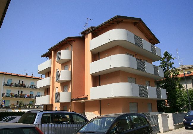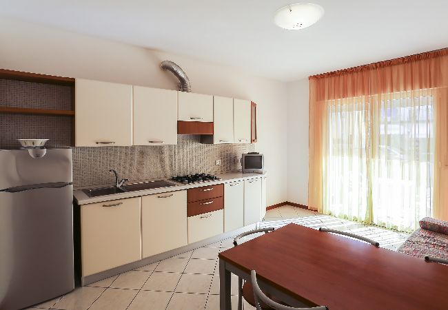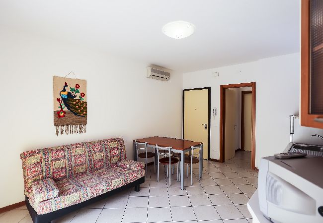 Two-room flat on the ground floor with terrace, composed of a bedroom with double bed and single bed, living room with double bed sofa and kitchen corner, bathroom. CA' MIRA is an apartament house located on the West Beach of Caorle, few steps far from the historical city centre and 100 meters far from the beach. It consists of well furnished two-room apartments, equipped with TV, air conditioning and safe, all with windowed bathroom and private parking space.