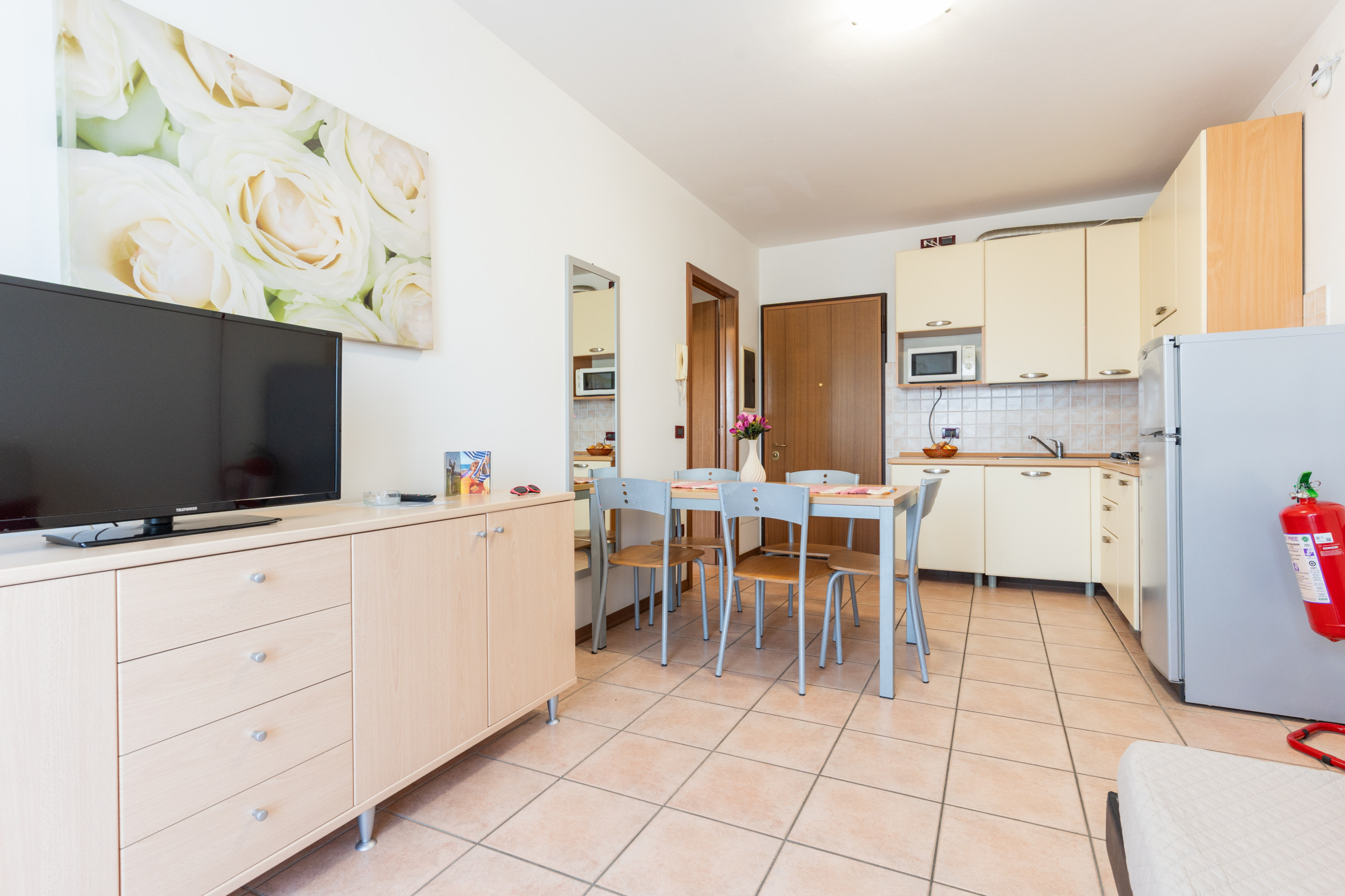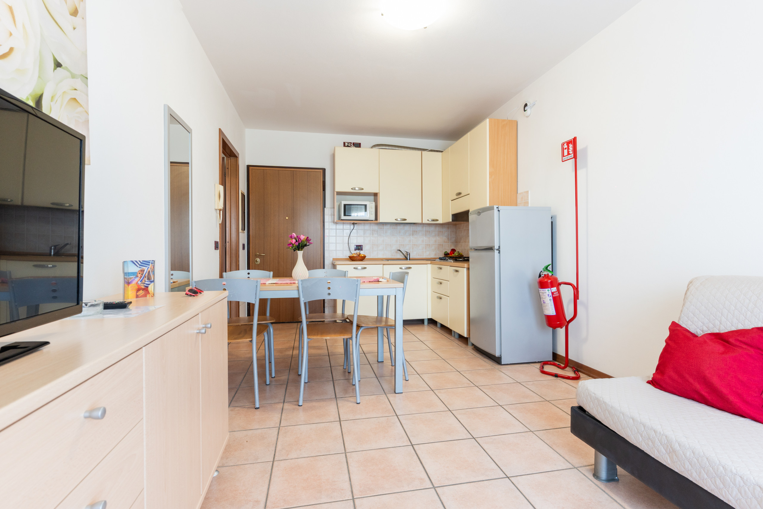 • A welcoming living room with an equipped kitchenette, table with chairs and a French double sofa bed, with direct access to a terrace or balcony;