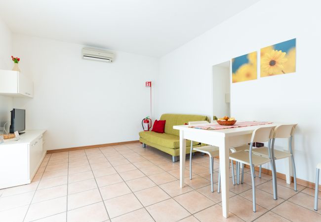 All apartments are developed on a single level and some offer views of the swimming pool while others have side views. The living room has an equipped kitchenette, table, chairs and a French double sofa bed, with access to the balcony or garden, ideal for outdoor lunches and dinners. The main bedroom is furnished with a double bed and a single bed, while the second bedroom offers two single beds. The bathroom is spacious and equipped with a shower enclosure.