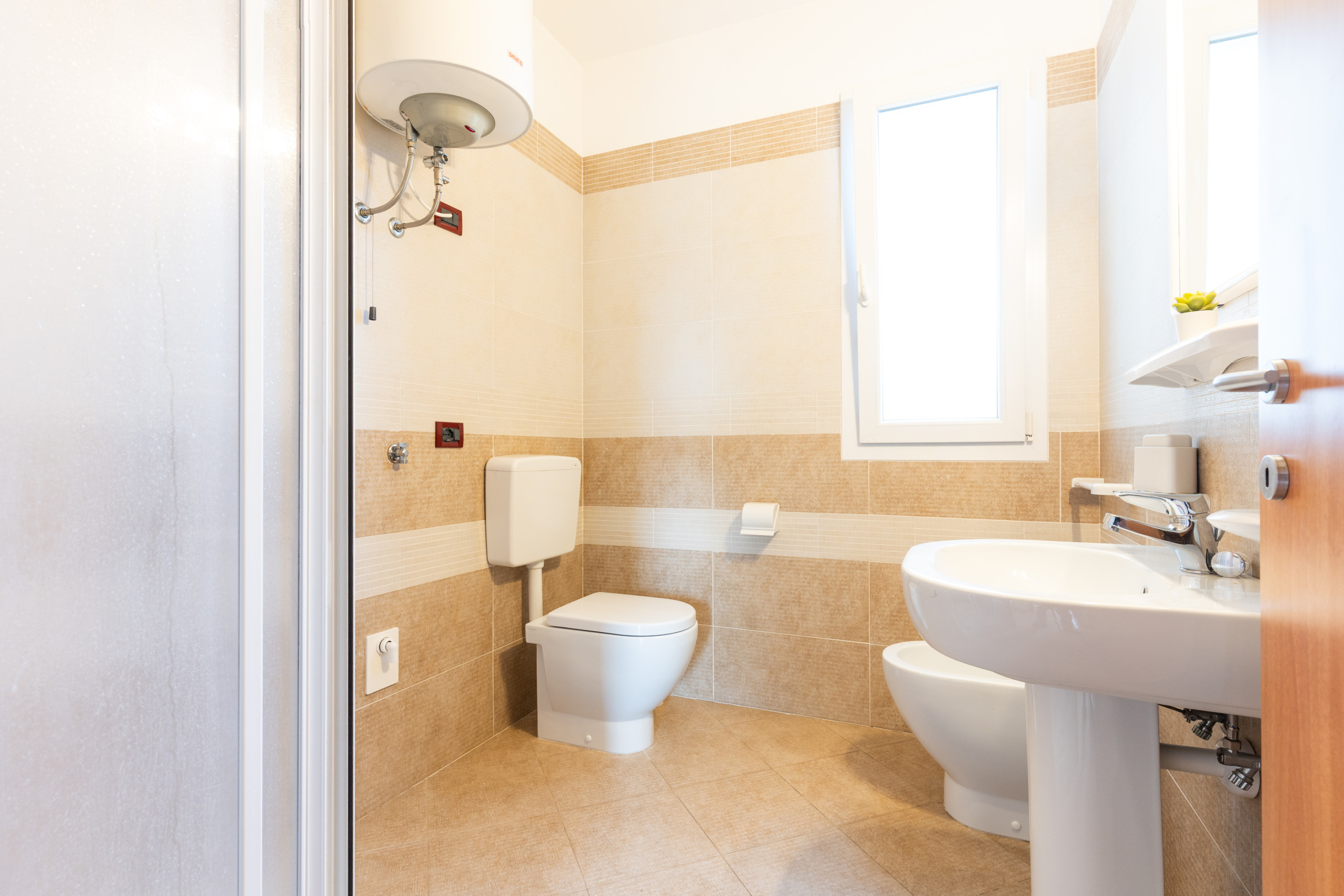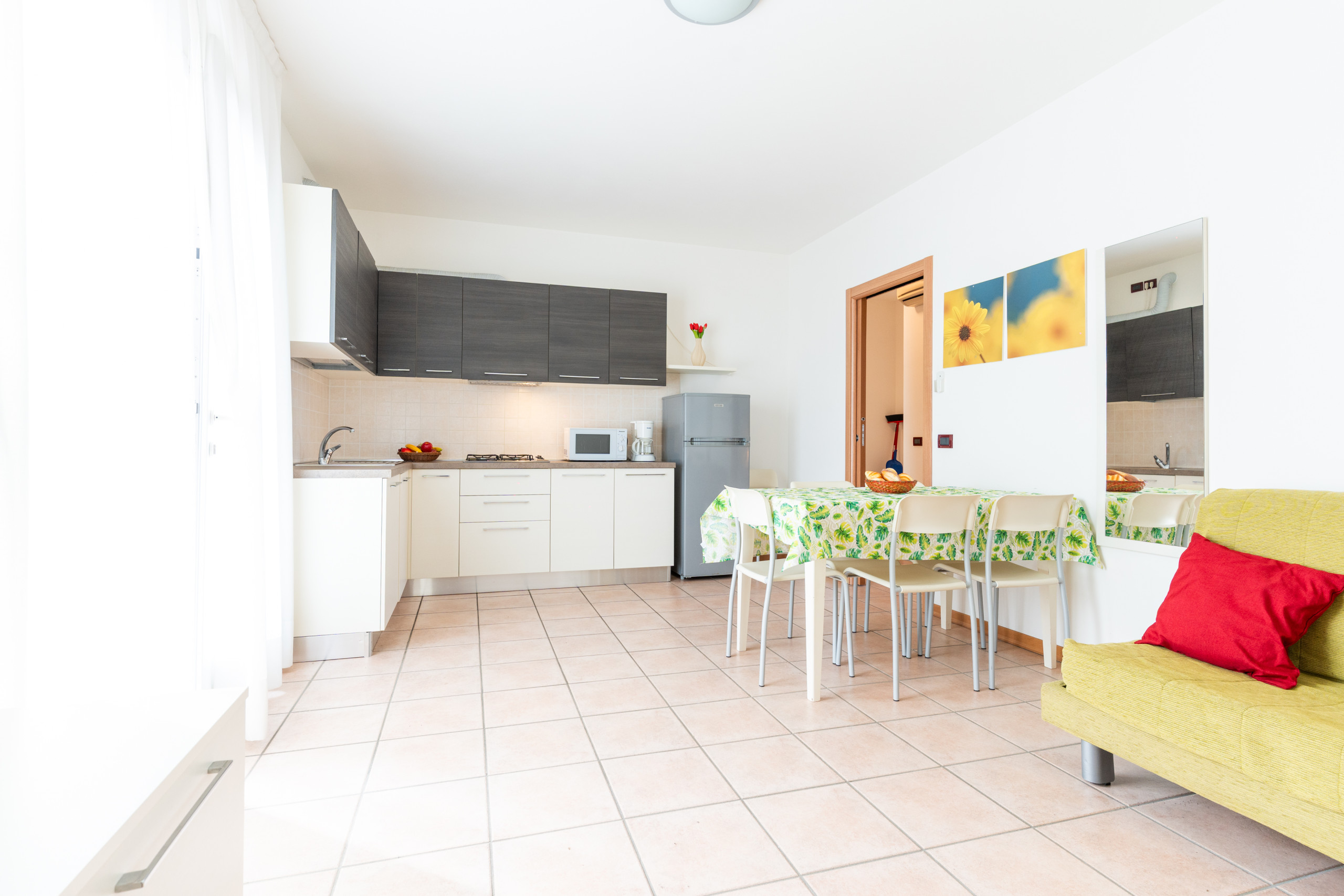 All apartments are developed on a single level and some offer views of the swimming pool while others have side views. The living room has an equipped kitchenette, table, chairs and a French double sofa bed, with access to the balcony or garden, ideal for outdoor lunches and dinners. The main bedroom is furnished with a double bed and a single bed, while the second bedroom offers two single beds. The bathroom is spacious and equipped with a shower enclosure.