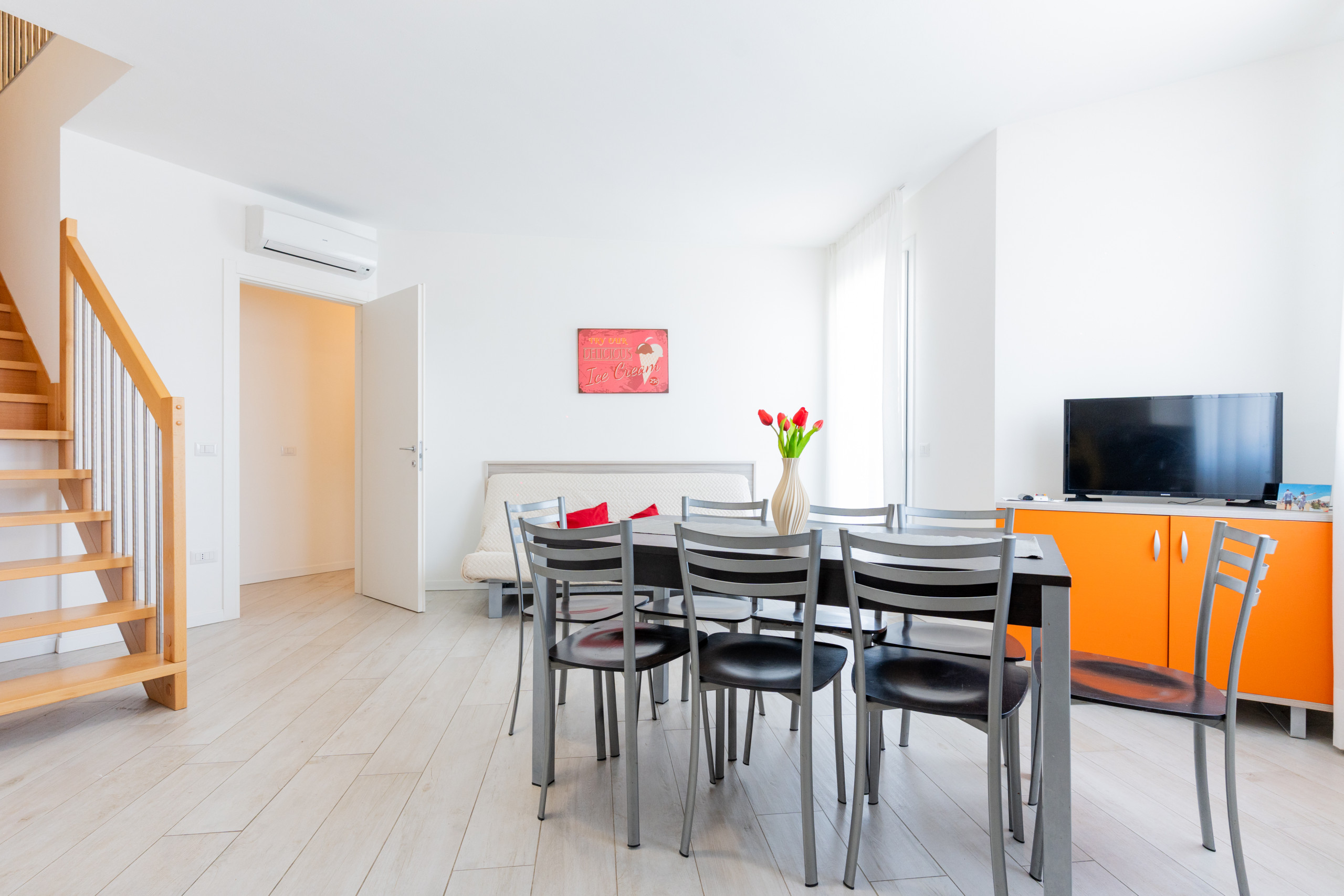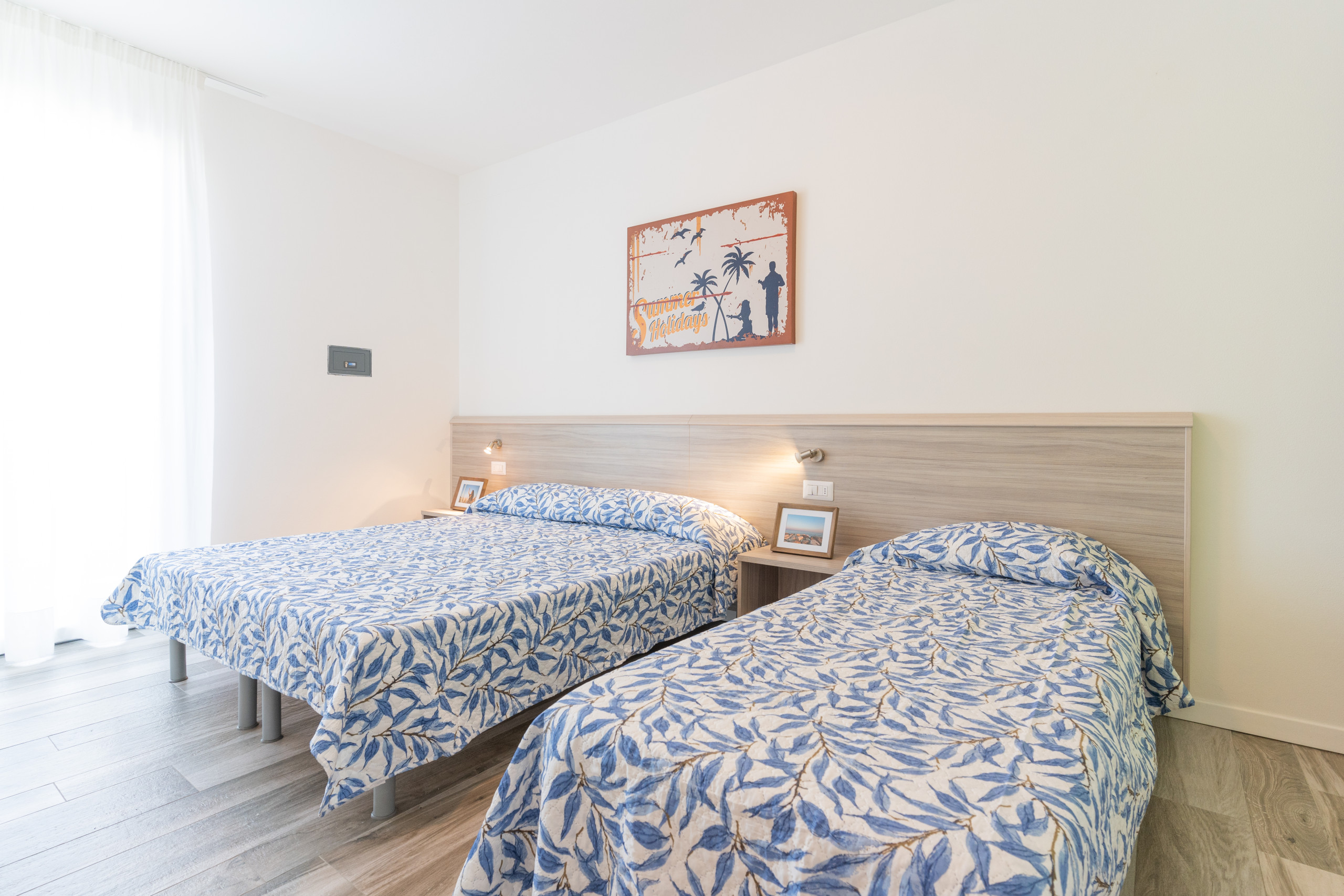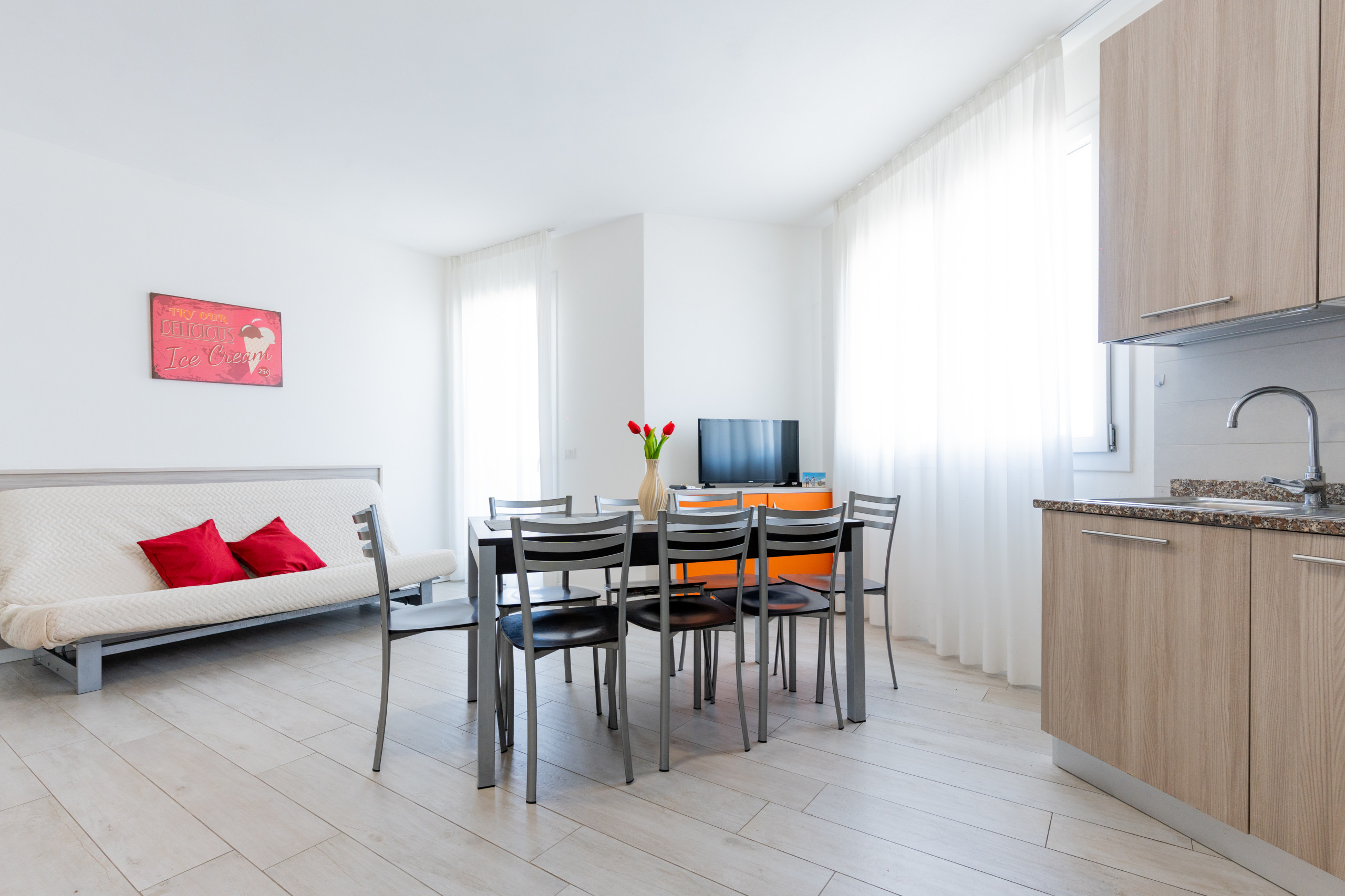 The apartments offer a bright living room with a fully equipped kitchenette and a French double sofa bed, a spacious double bedroom with an additional single bed, a second room with two single beds and a bathroom with a shower.