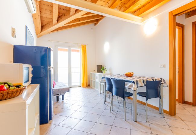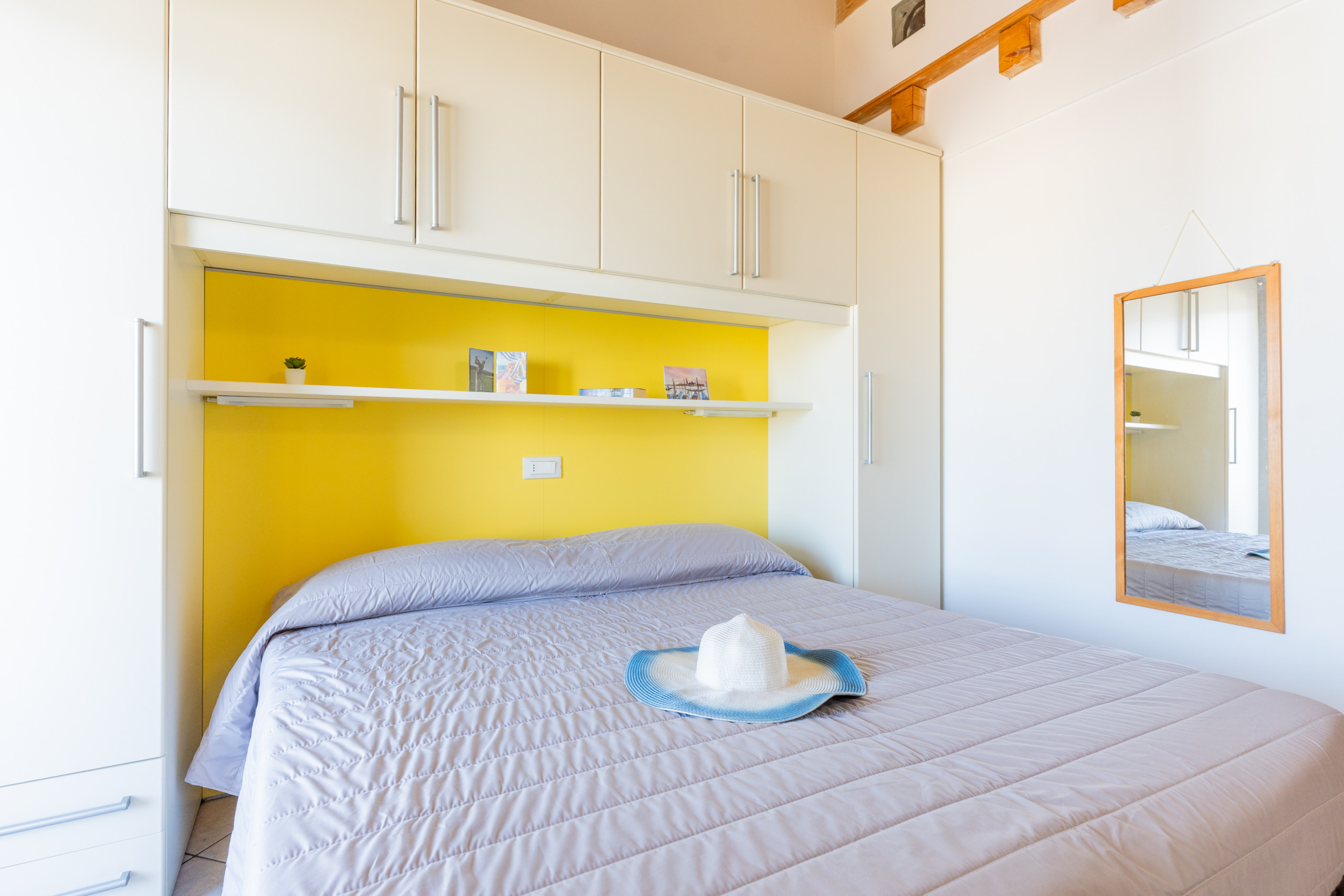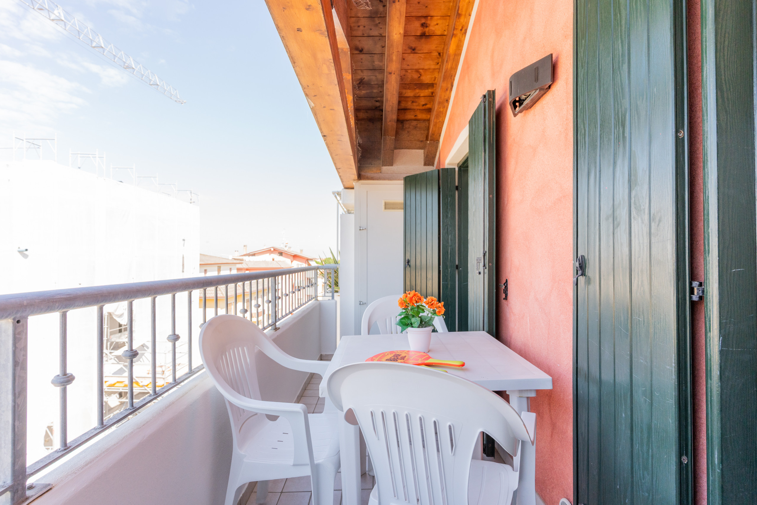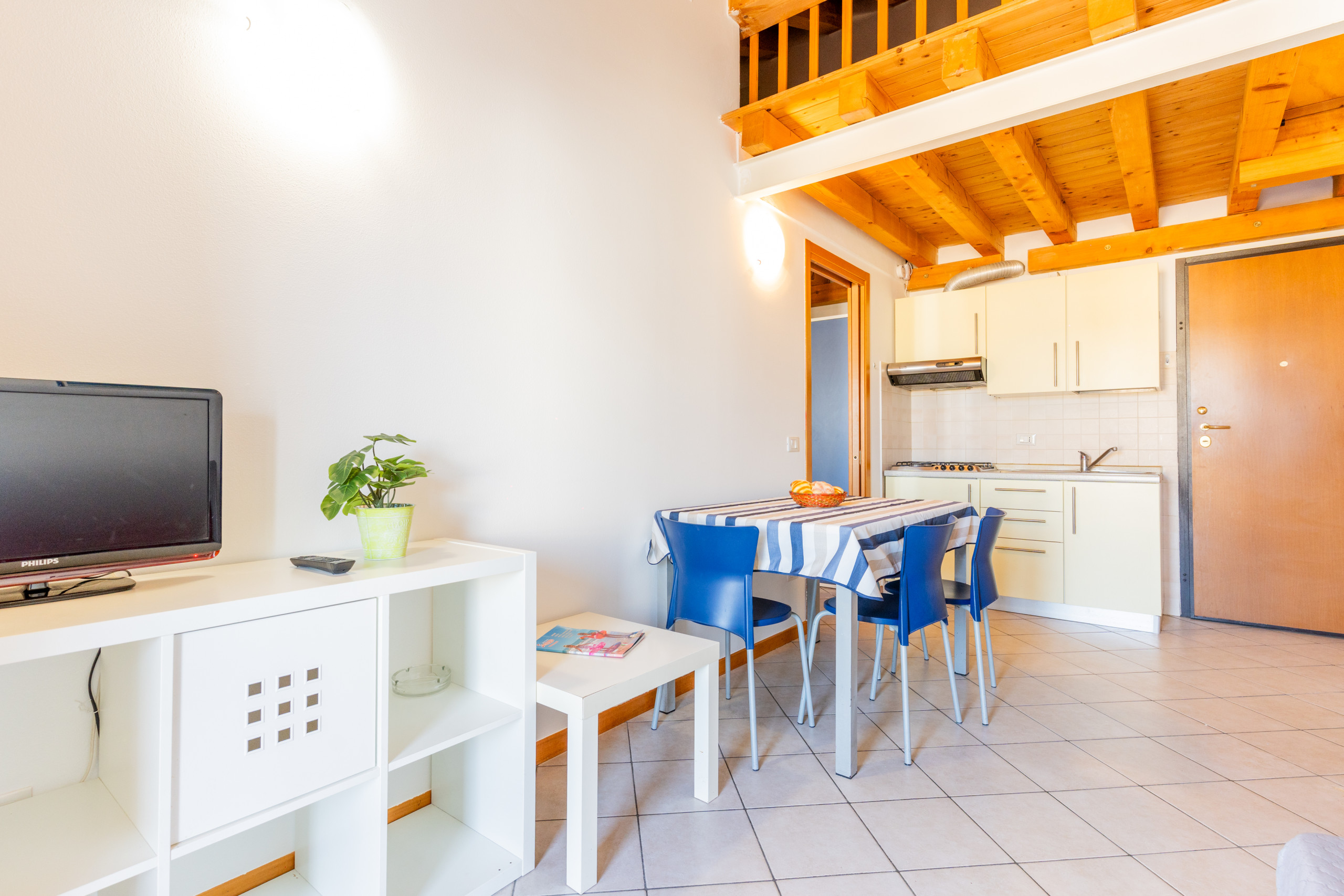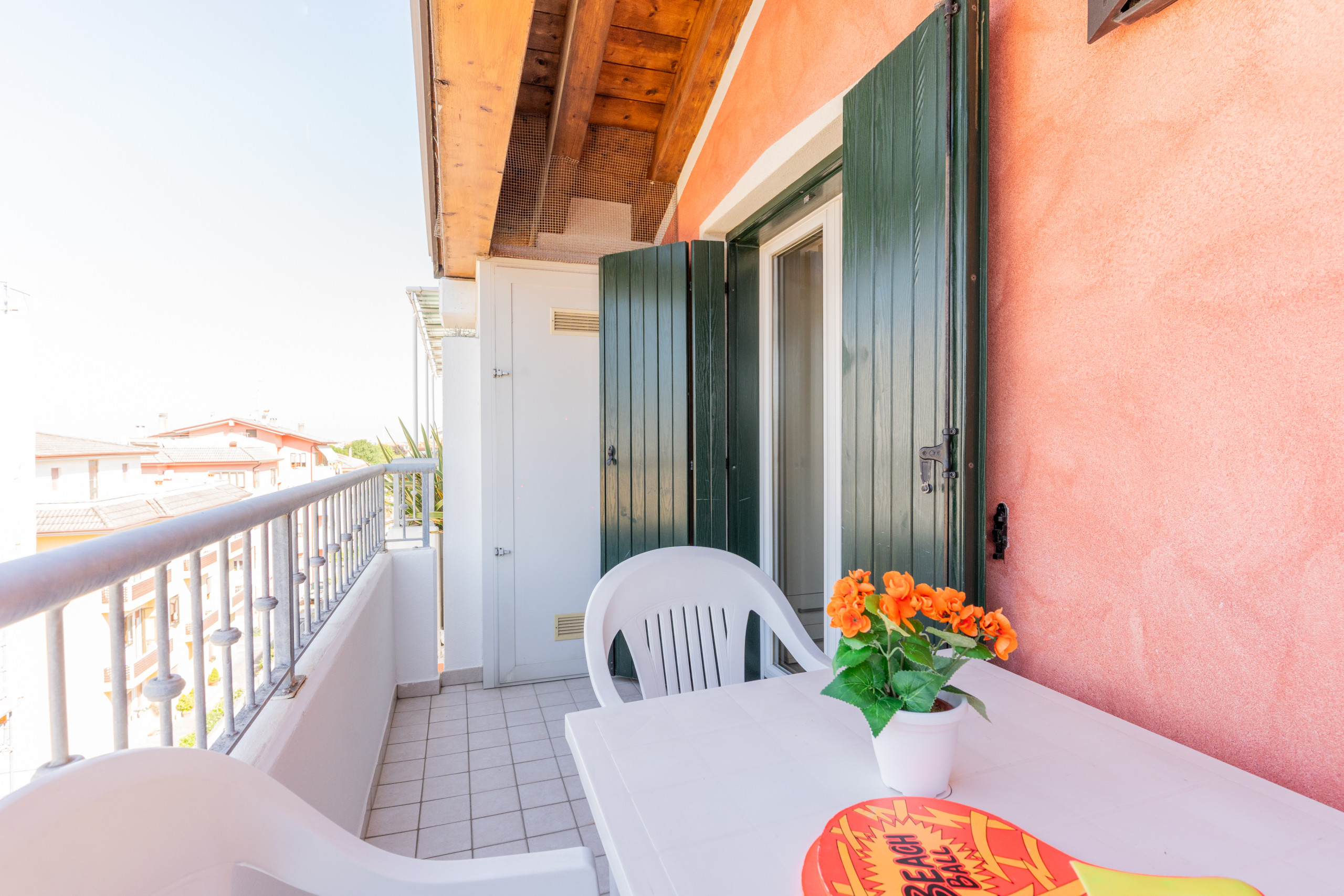 One-room flat with balcony on the upper floor of the apartment building, composed of living room with a double bed, an armchair bed and a fold-away bed, kitchenette, bathroom. VILLAGGIO LUNA 2 is an holiday village situated on the West Beach of Caorle, 250 meter from the sea, composed of little terraced houses, all organized in two floors, equipped with air conditioning, safe and numbered parking spaces, some with a private garden, others with a terrace. Swimming pool for adults and children sorrounded by the solarium. In the village there is also a building with lift (door width: 75 cm) with apartments of different sizes, all with balcony.