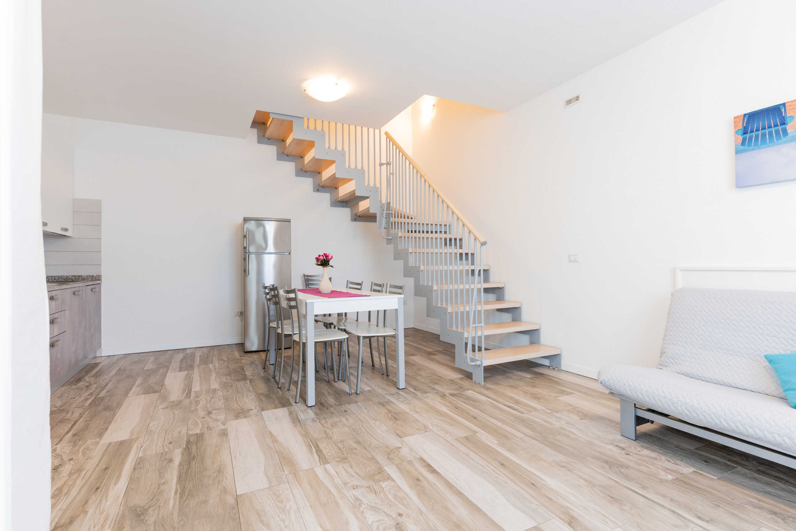 On the ground floor, there is a living room with an equipped kitchenette, a comfortable French double sofa bed and, in some units, also a bathroom with a shower cubicle.
