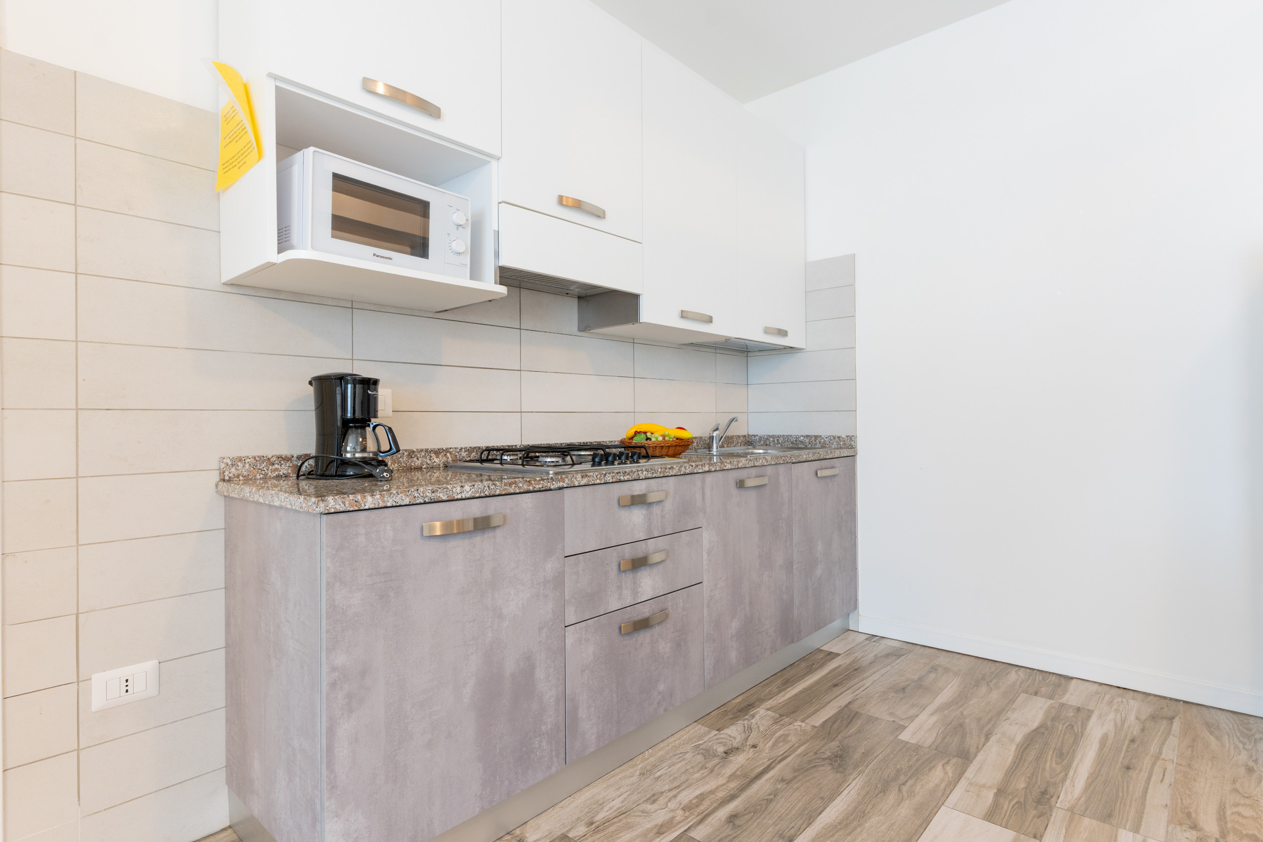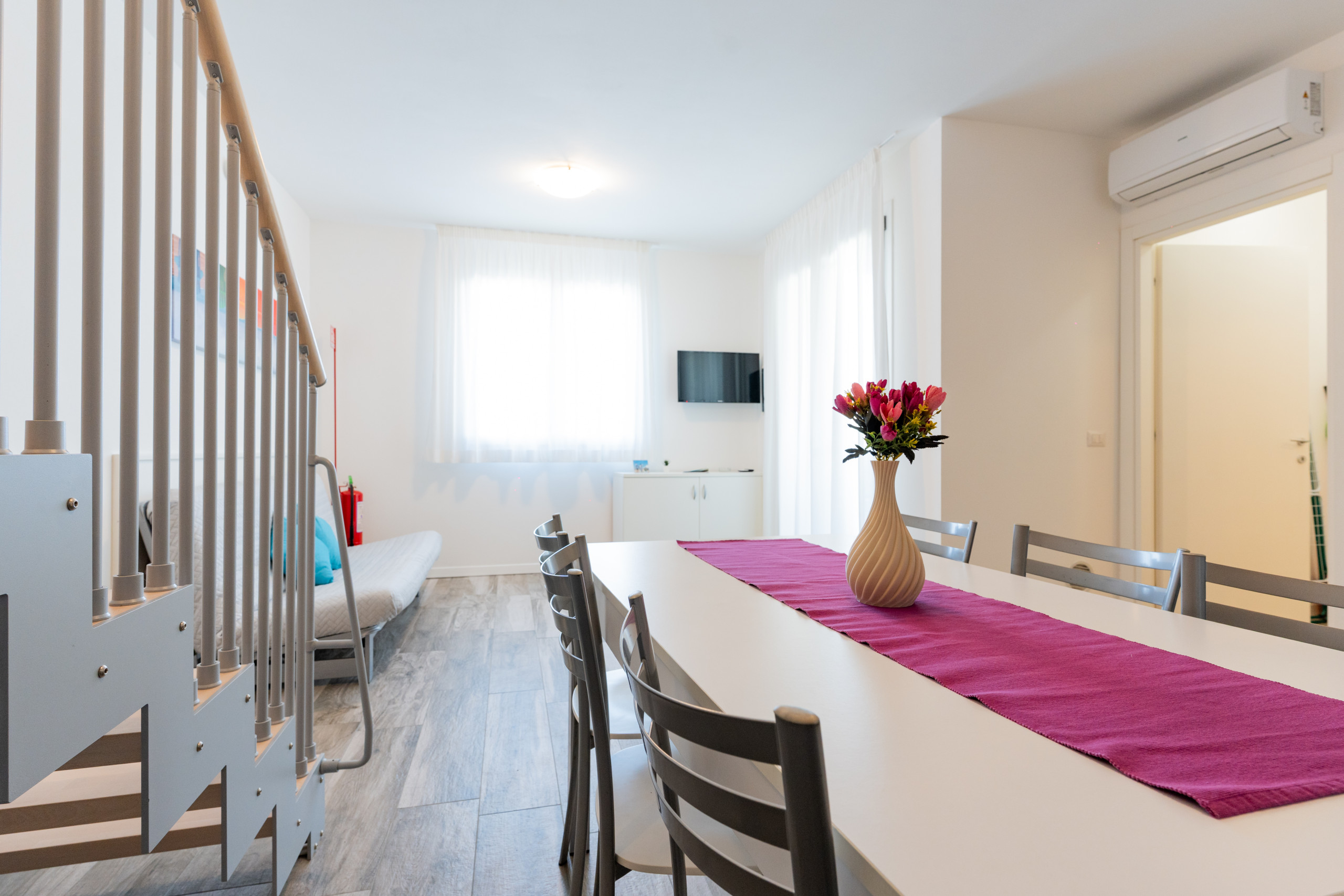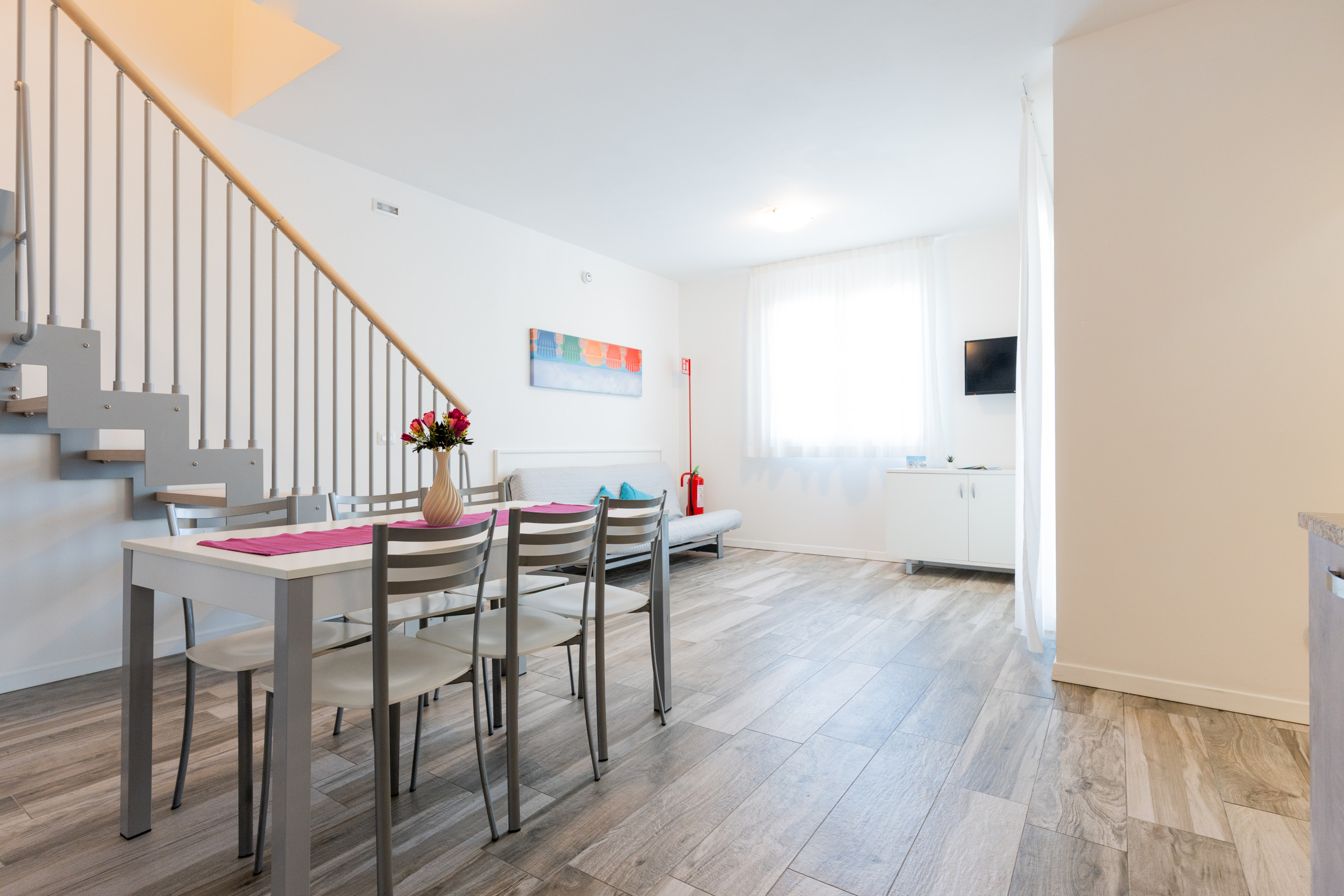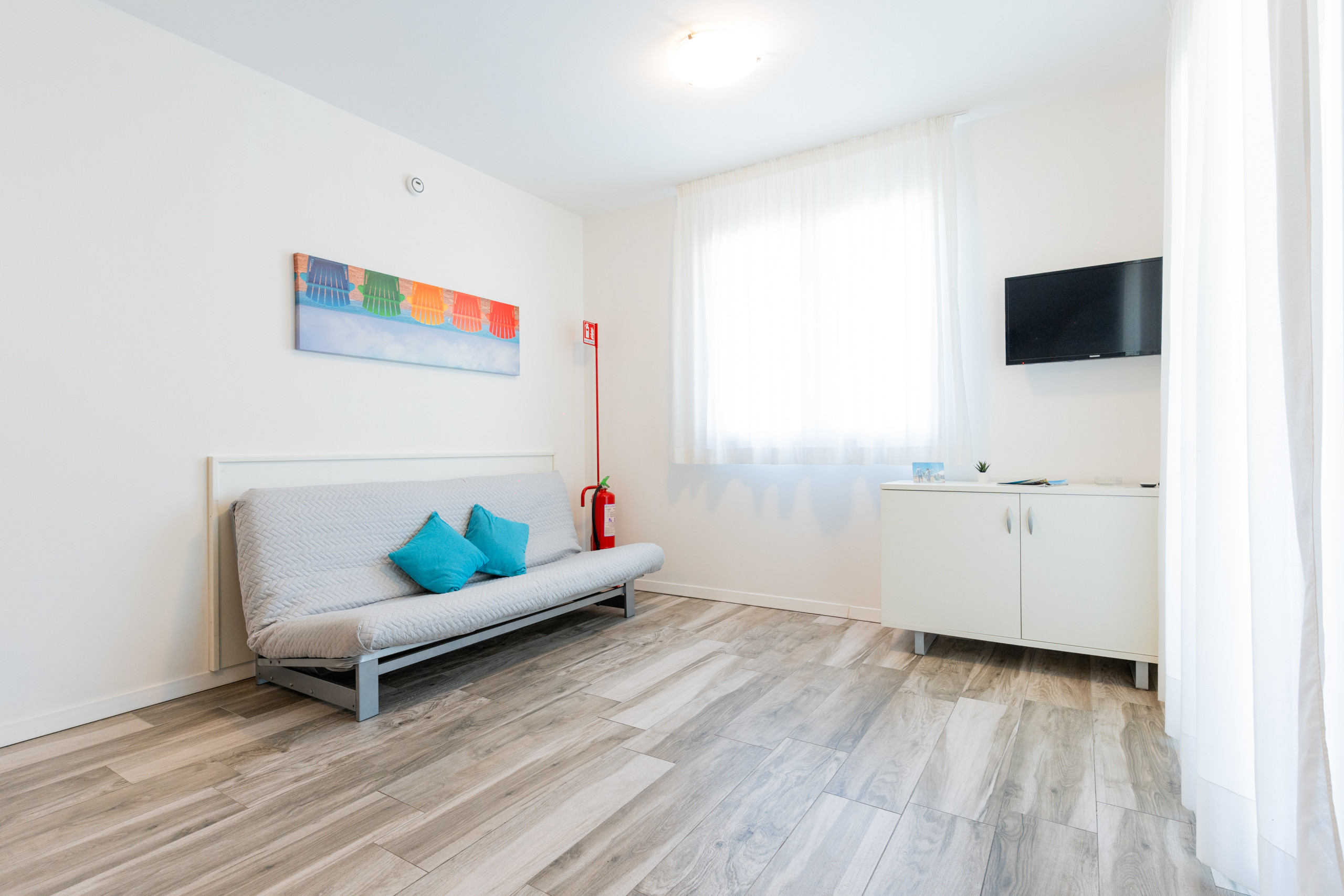 • bright living room with equipped kitchenette, dining table, French sofa bed and access to terrace or balcony;