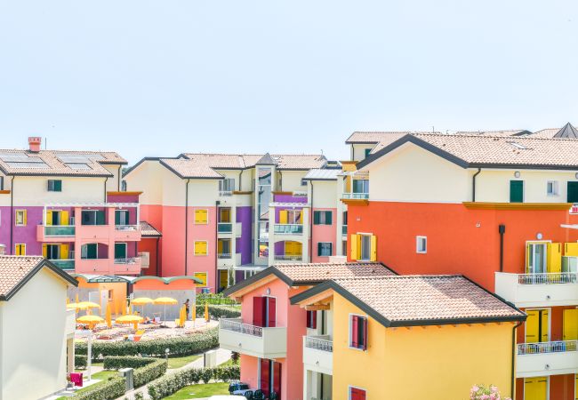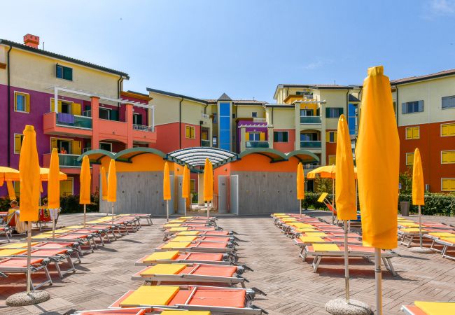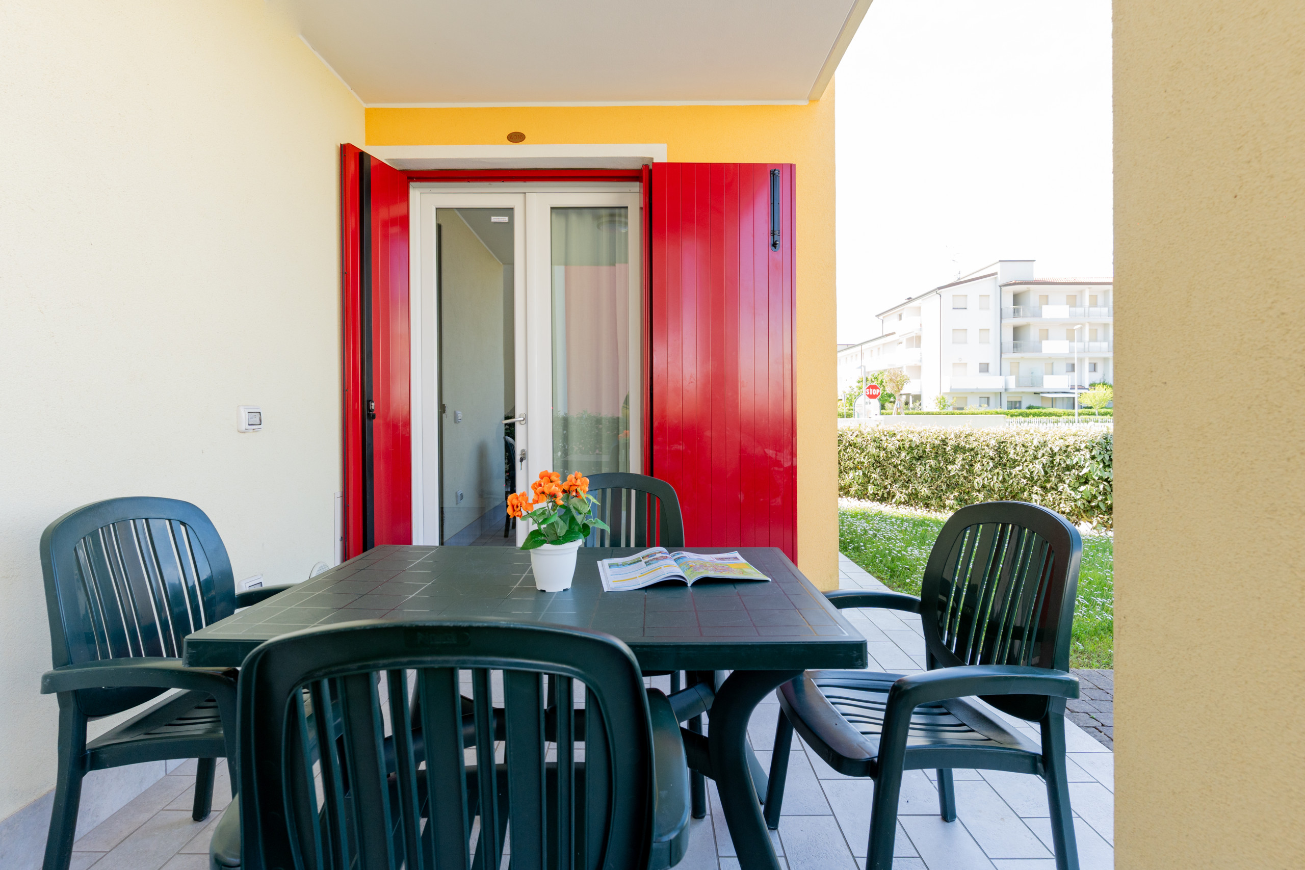 All apartments are developed on a single level and some offer views of the swimming pool while others have side views. The living room has an equipped kitchenette, table, chairs and a French double sofa bed, with access to the balcony or garden, ideal for outdoor lunches and dinners. The main bedroom is furnished with a double bed and a single bed, while the second bedroom offers two single beds. The bathroom is spacious and equipped with a shower enclosure.