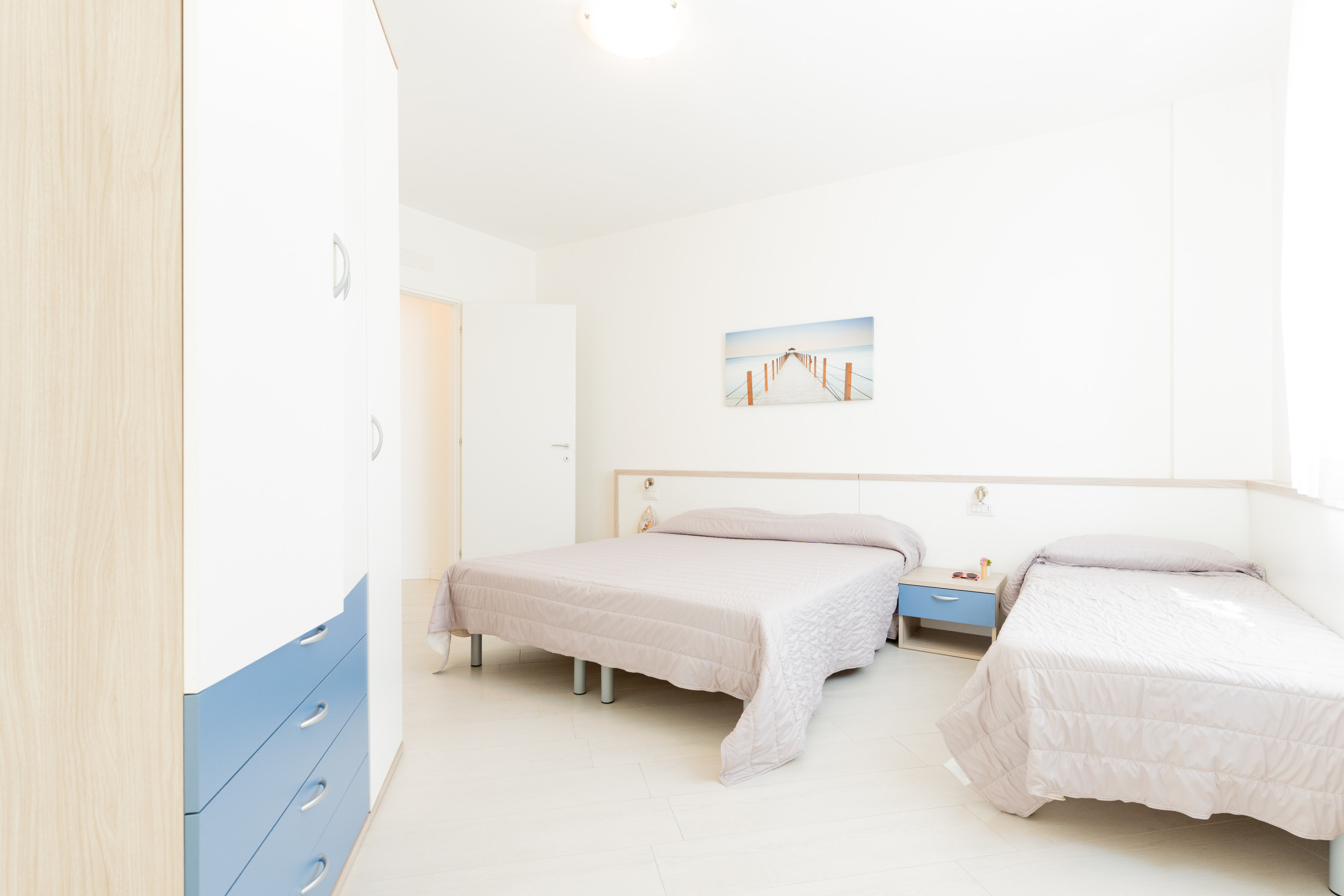 Inside, a bright living room with an equipped kitchenette and a French double sofa bed creates a welcoming and functional environment. The bedroom has a double bed and a single bed, while the bathroom, spacious and modern, is equipped with a shower enclosure.