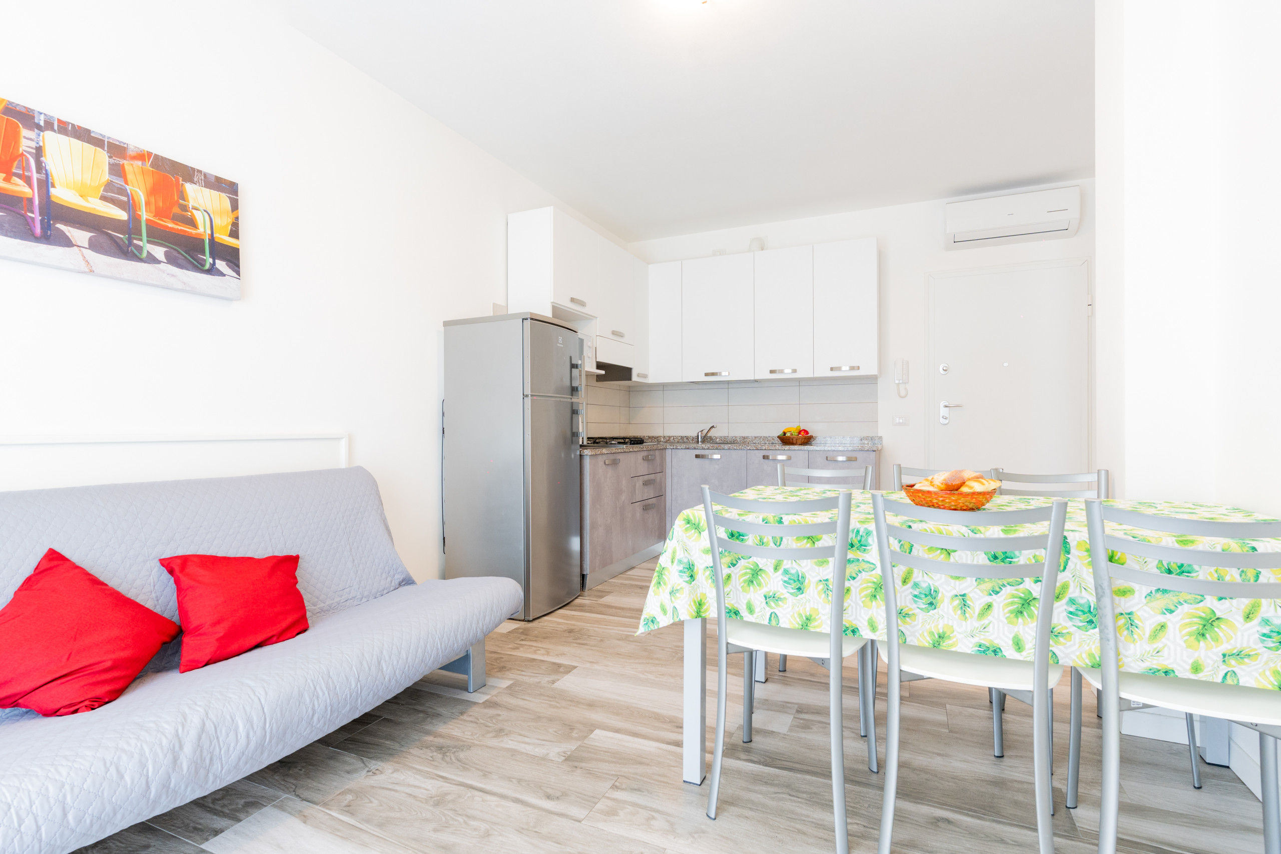Inside, a bright living room with an equipped kitchenette and a French double sofa bed creates a welcoming and functional environment. The bedroom includes a double bed and a single bed, while the bathroom is spacious and equipped with a shower enclosure.