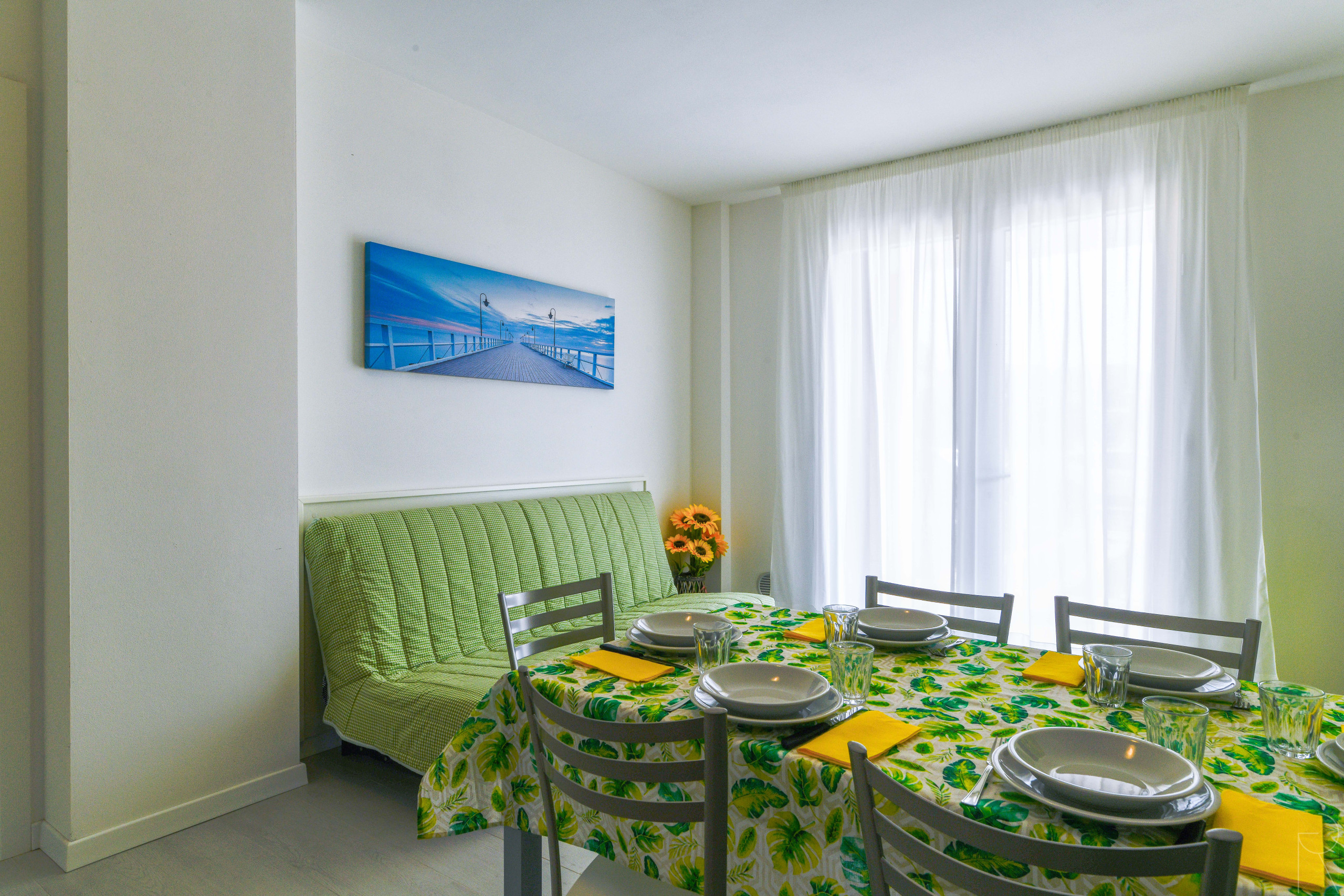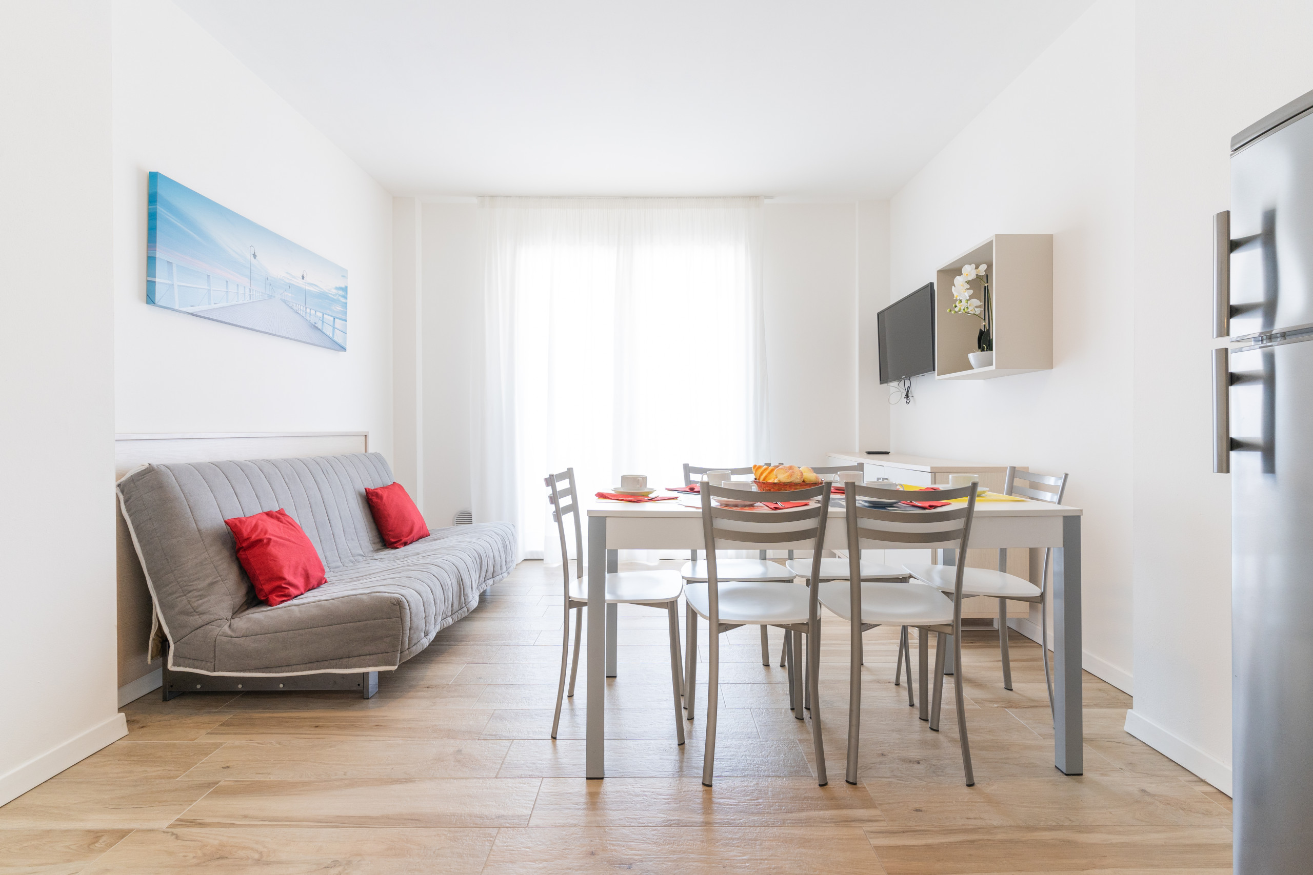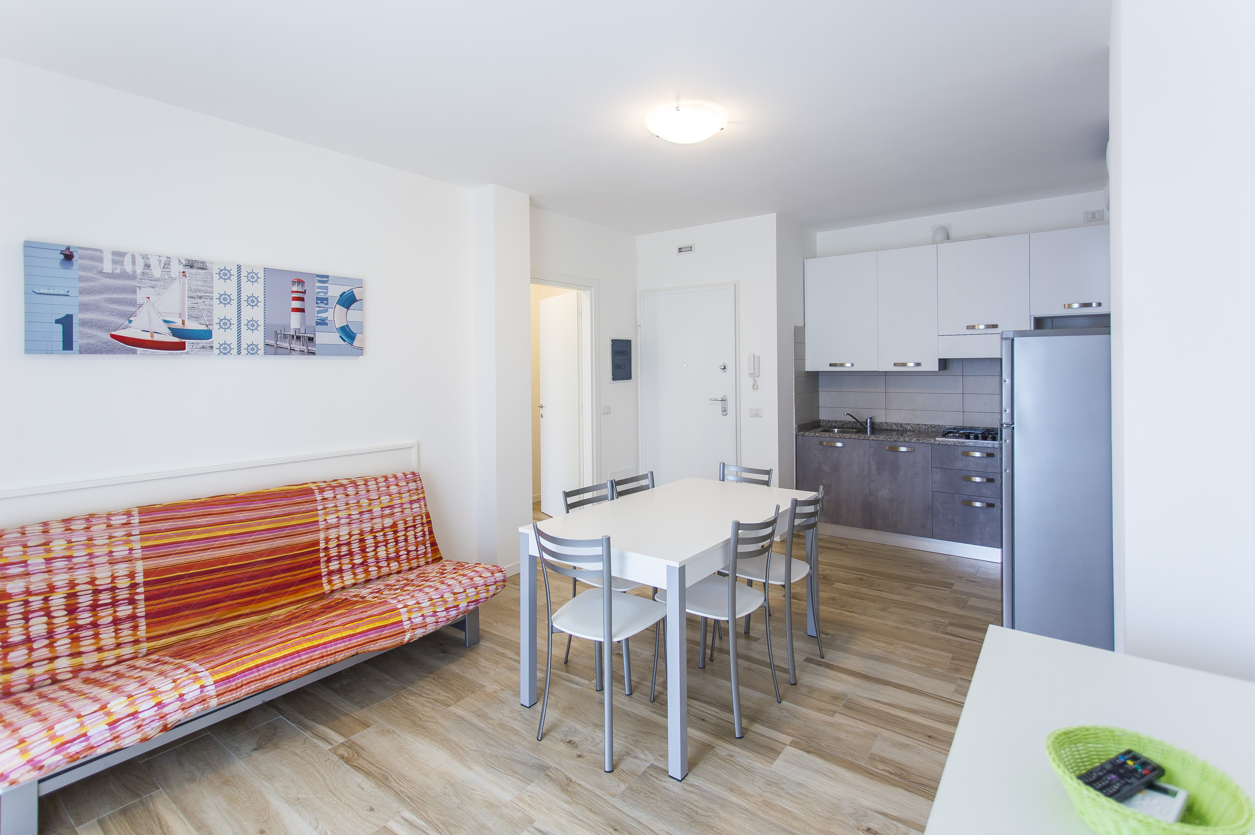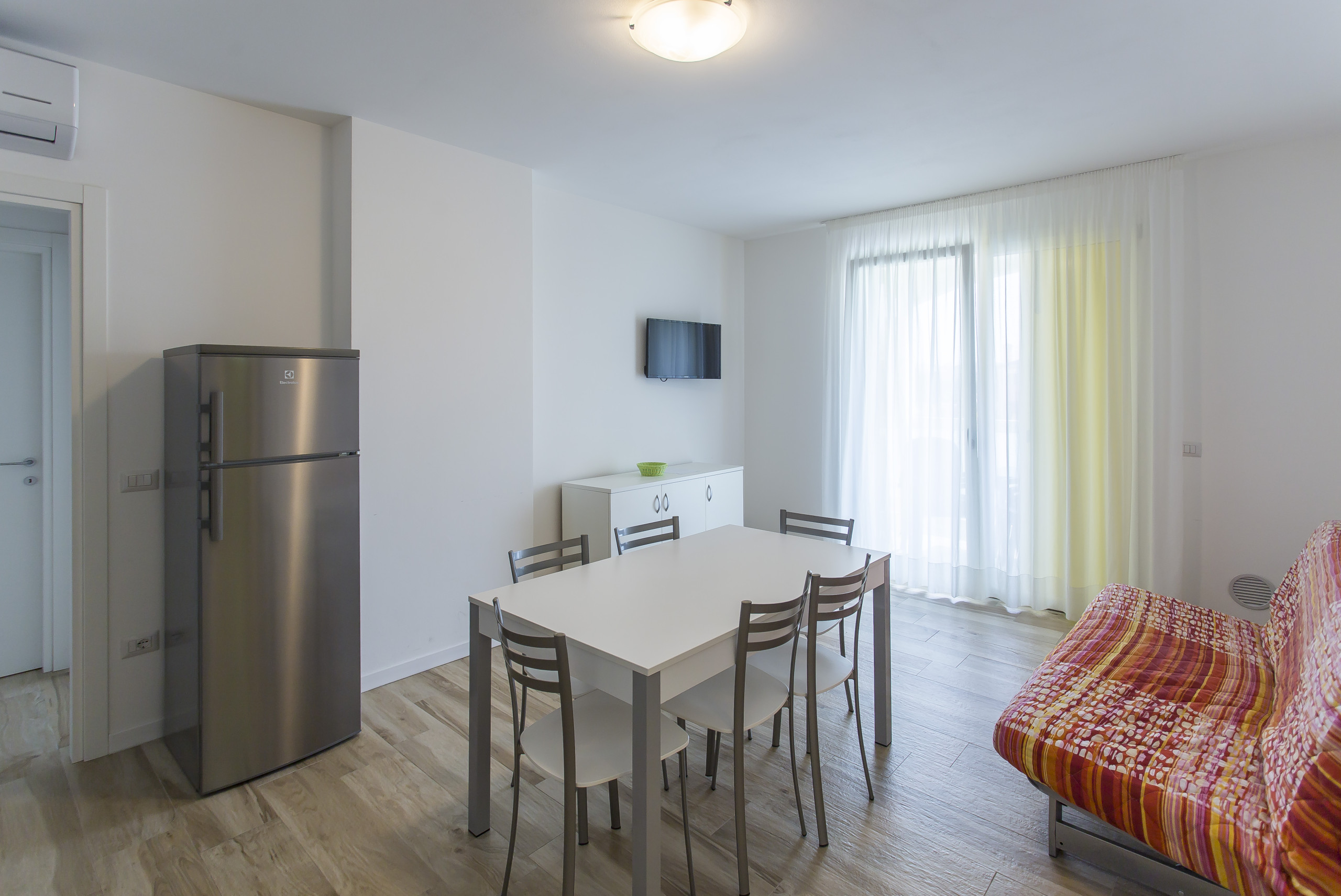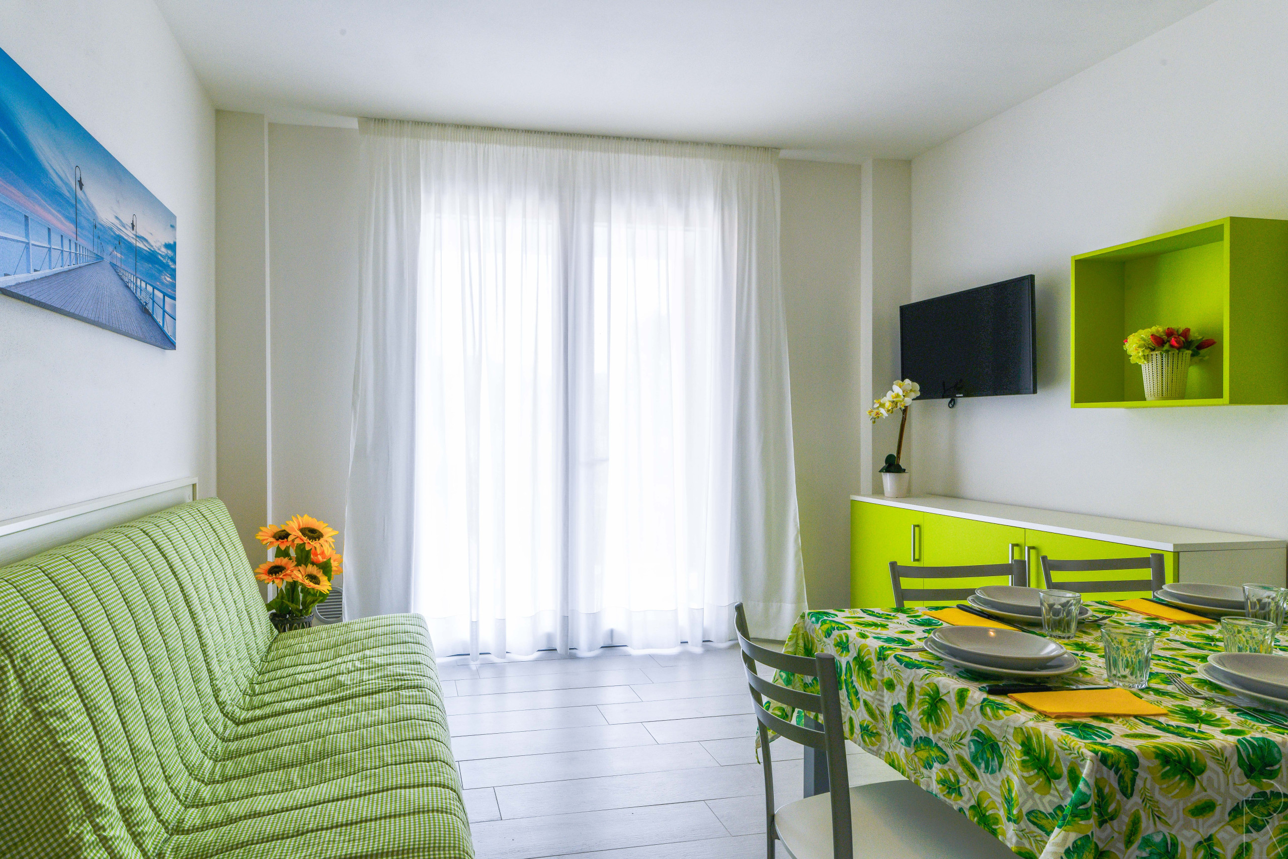 - cozy living room with equipped kitchenette, dining table with chairs, French double sofa bed, and direct access to the furnished balcony;