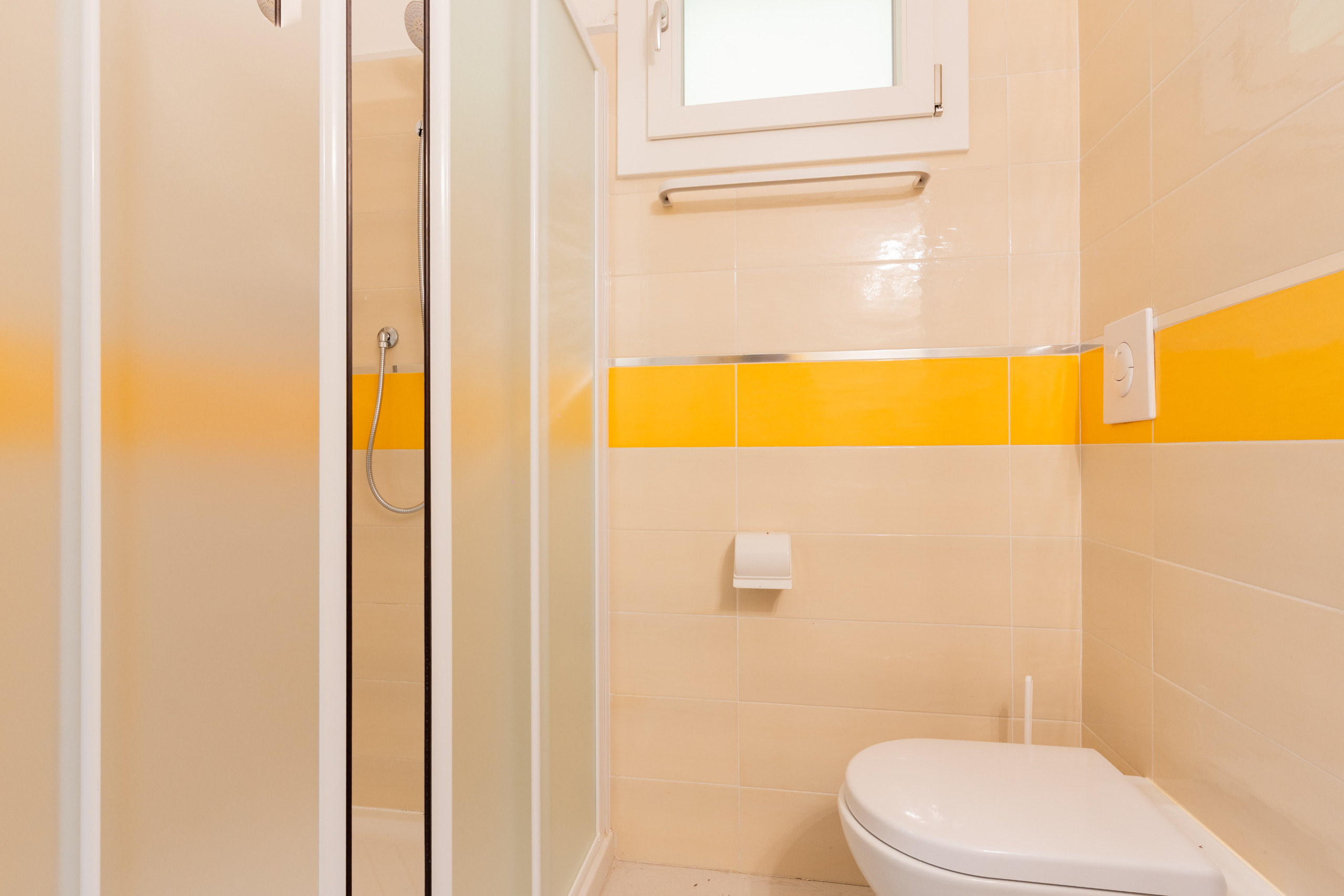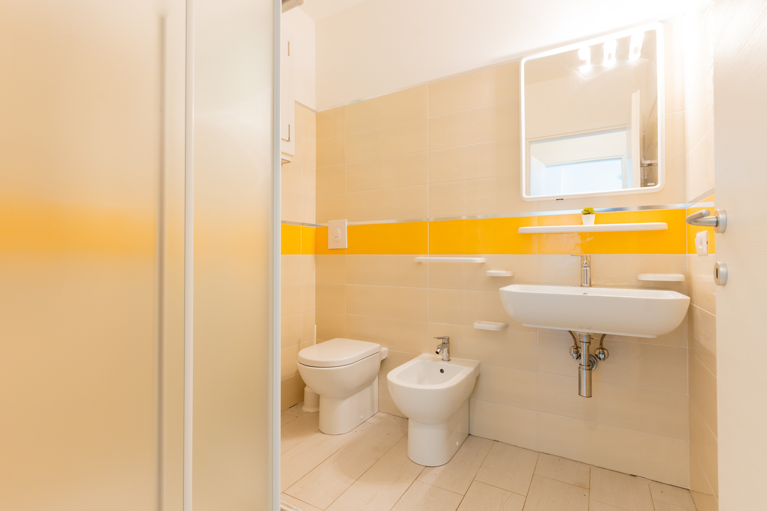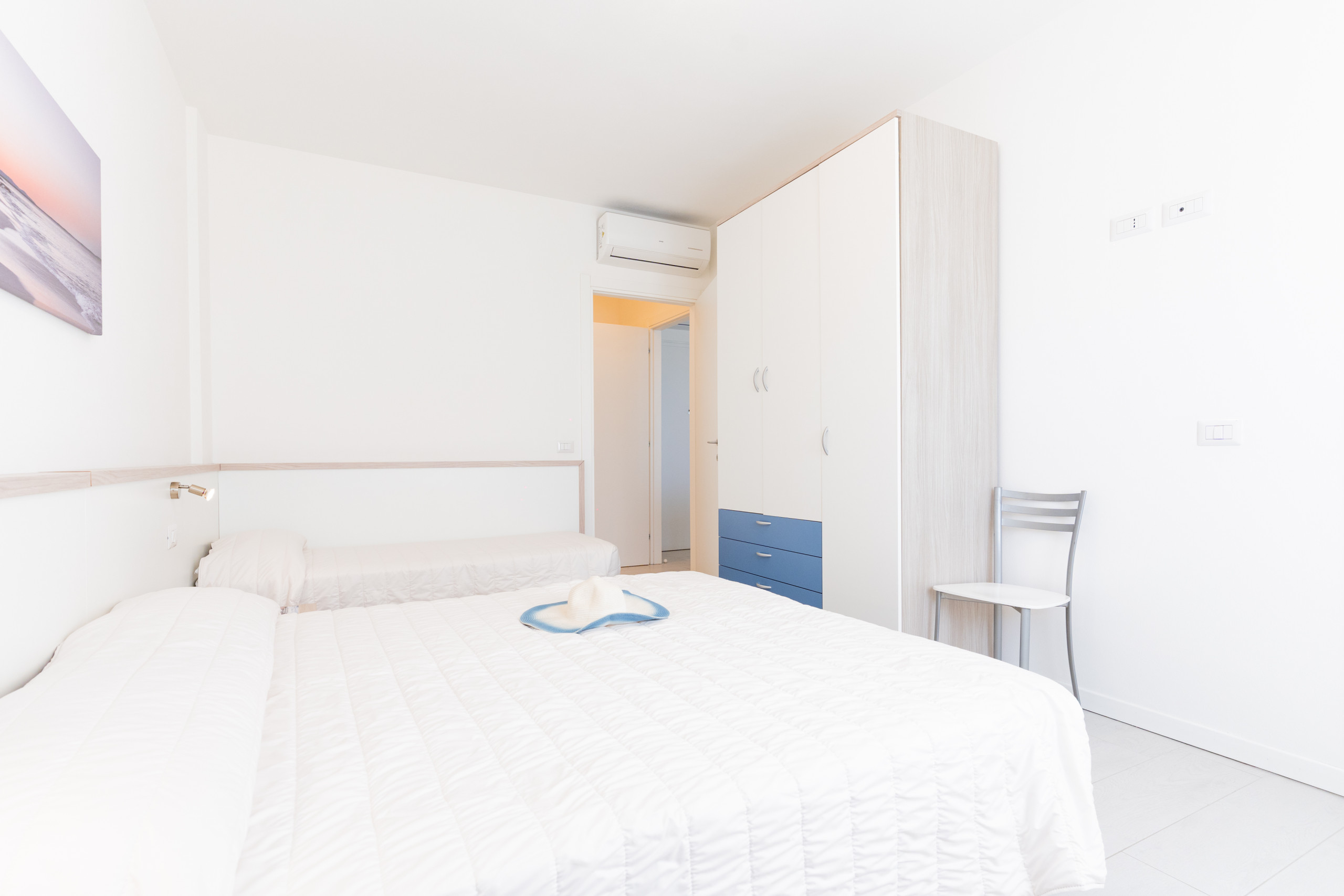 All apartments are developed on a single level and some offer views of the swimming pool while others have side views. The living room has an equipped kitchenette, table, chairs and a French double sofa bed, with access to the balcony or garden, ideal for outdoor lunches and dinners. The main bedroom is furnished with a double bed and a single bed, while the second bedroom offers two single beds. The bathroom is spacious and equipped with a shower enclosure.