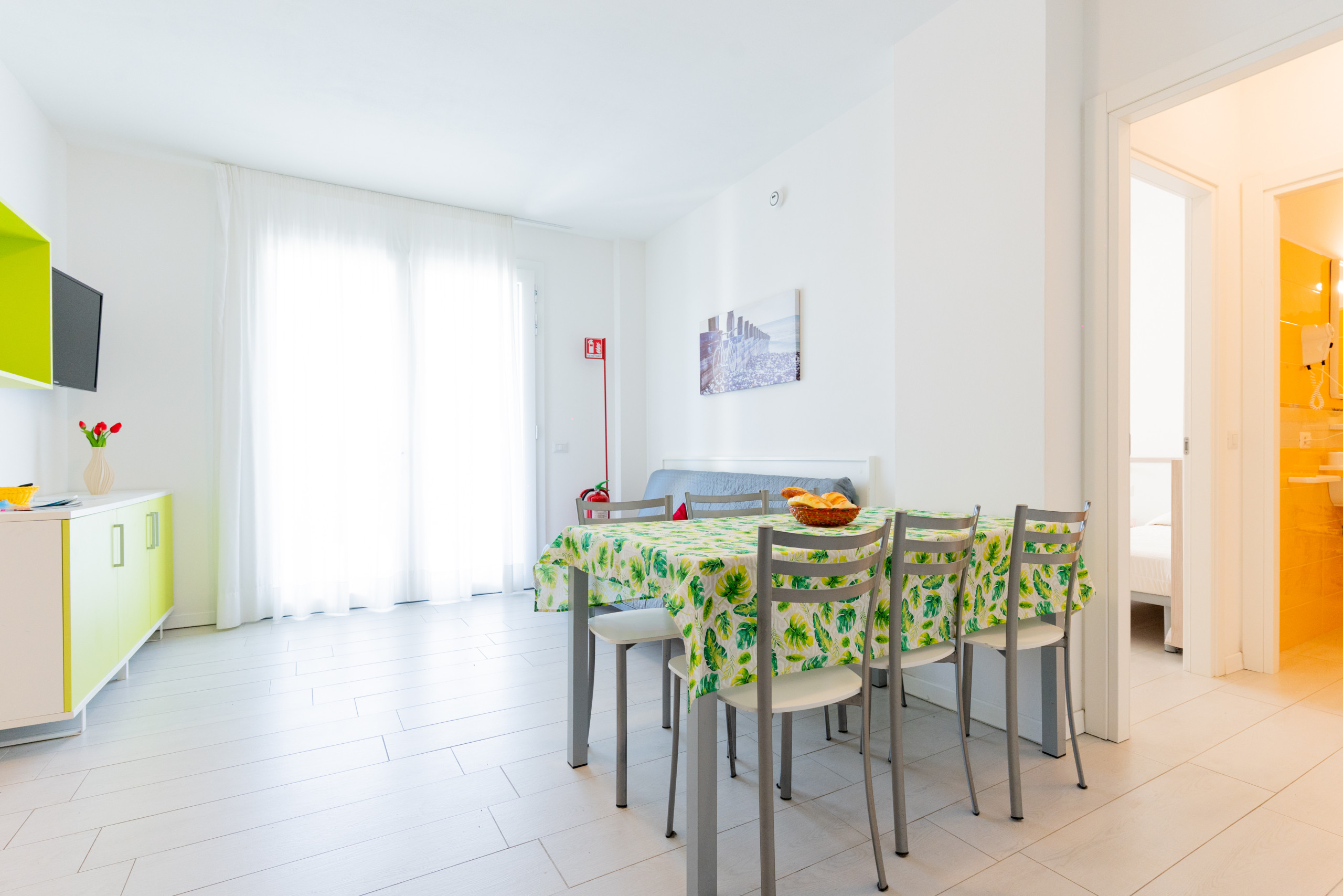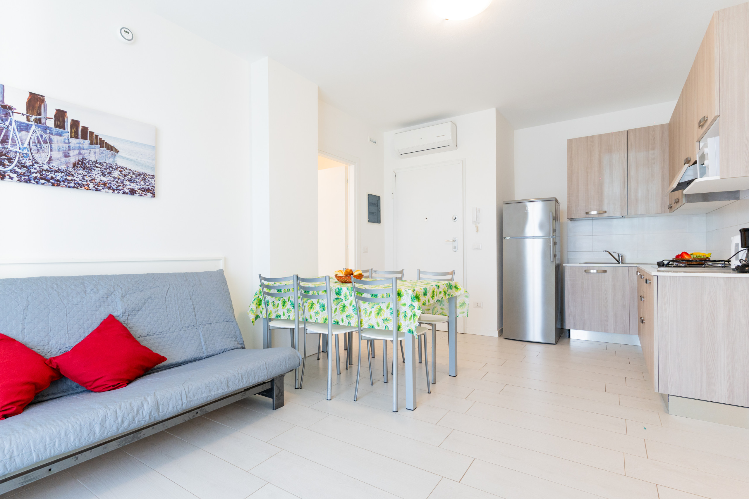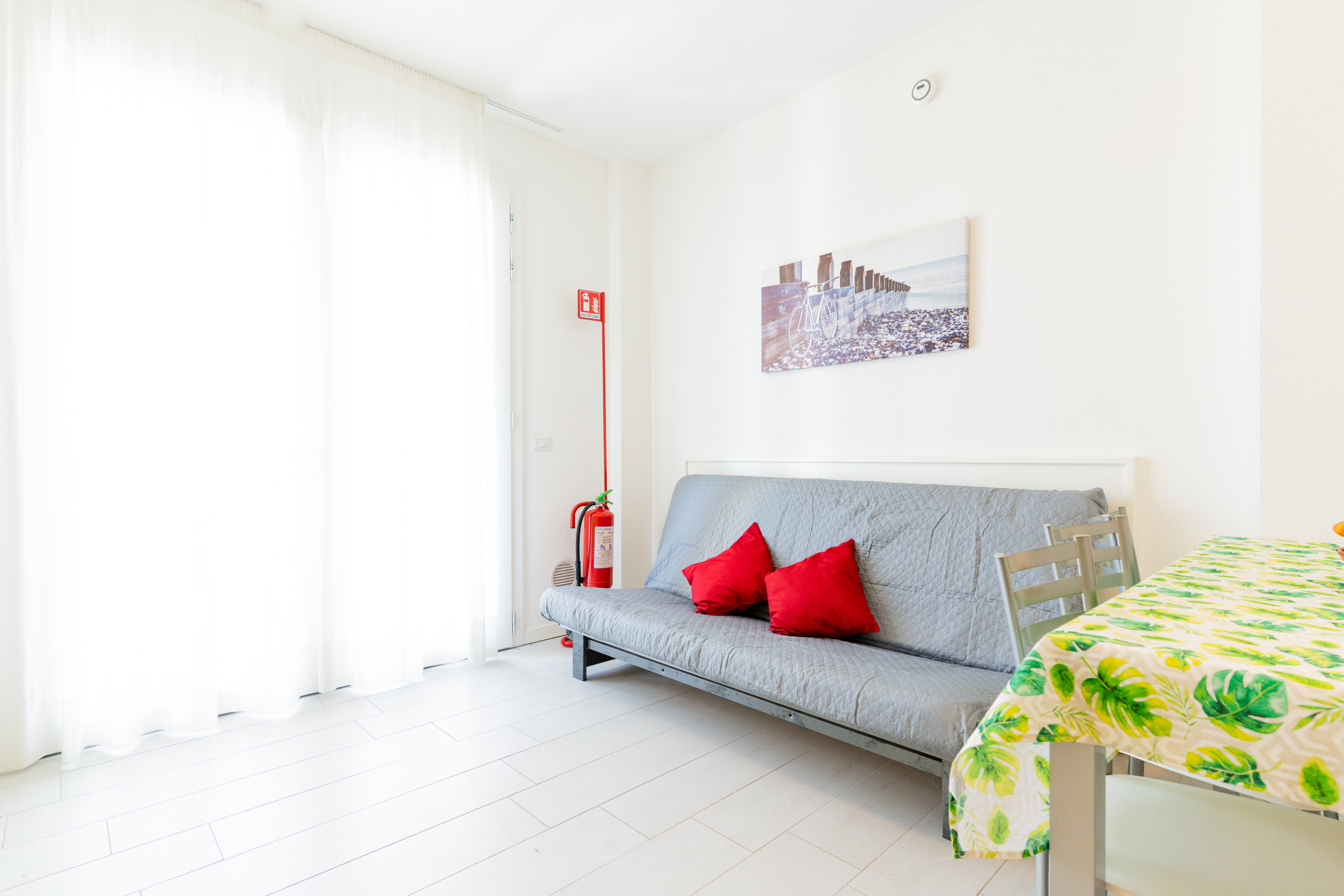 • bright living room with equipped kitchenette, dining table, French sofa bed and access to terrace or balcony;