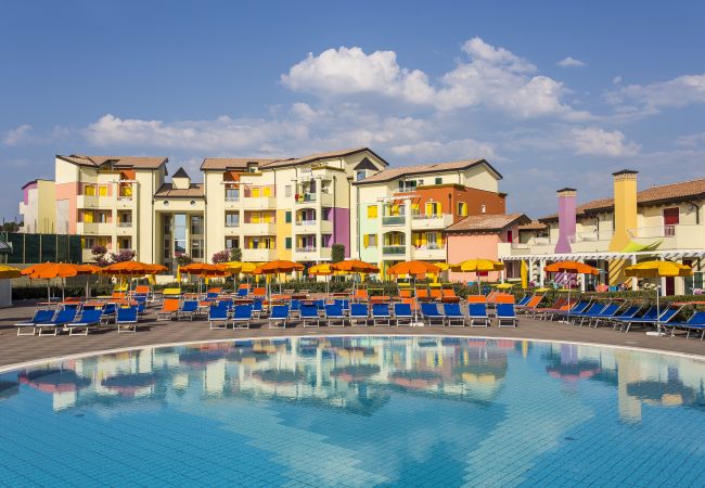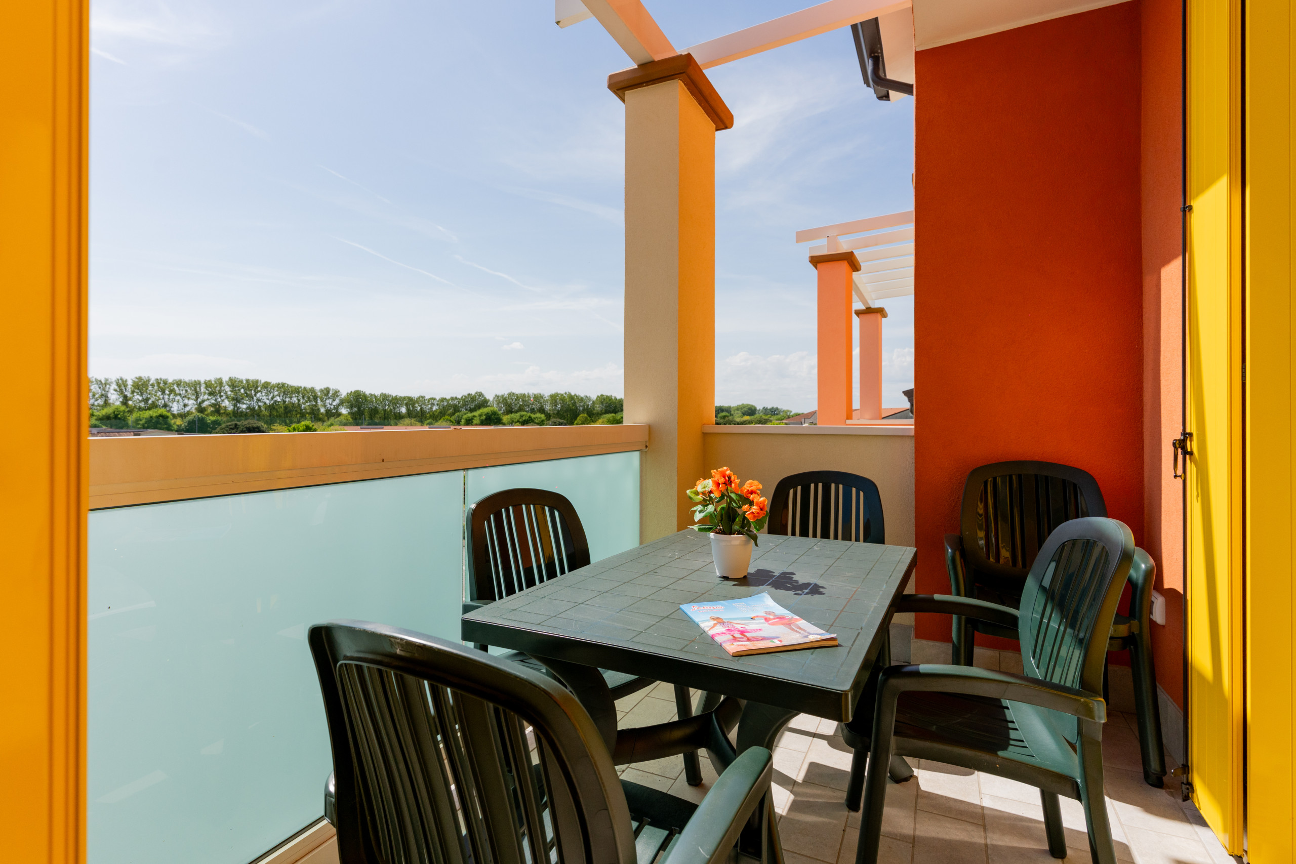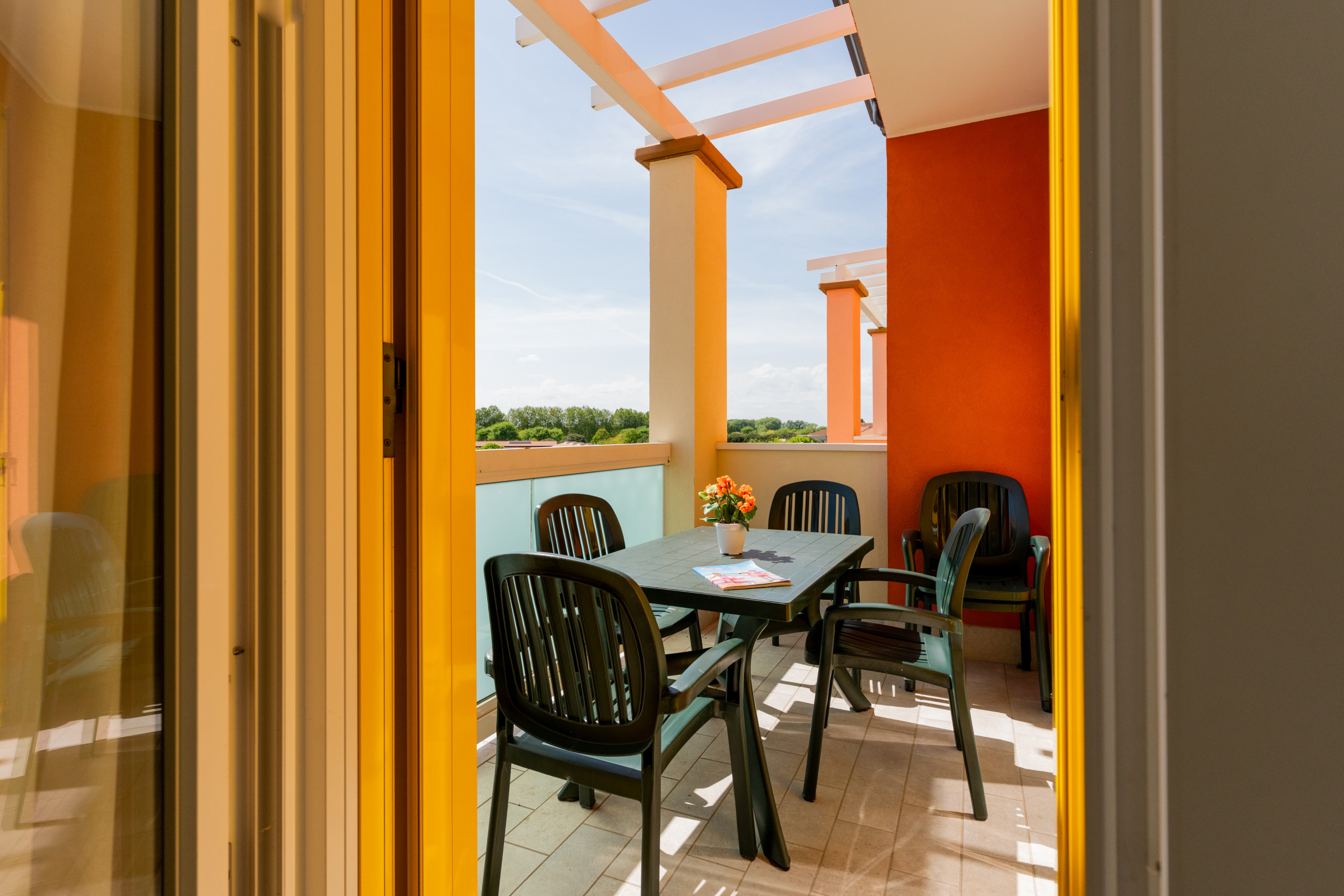 All apartments are developed on a single level and some offer views of the swimming pool while others have side views. The living room has an equipped kitchenette, table, chairs and a French double sofa bed, with access to the balcony or garden, ideal for outdoor lunches and dinners. The main bedroom is furnished with a double bed and a single bed, while the second bedroom offers two single beds. The bathroom is spacious and equipped with a shower enclosure.