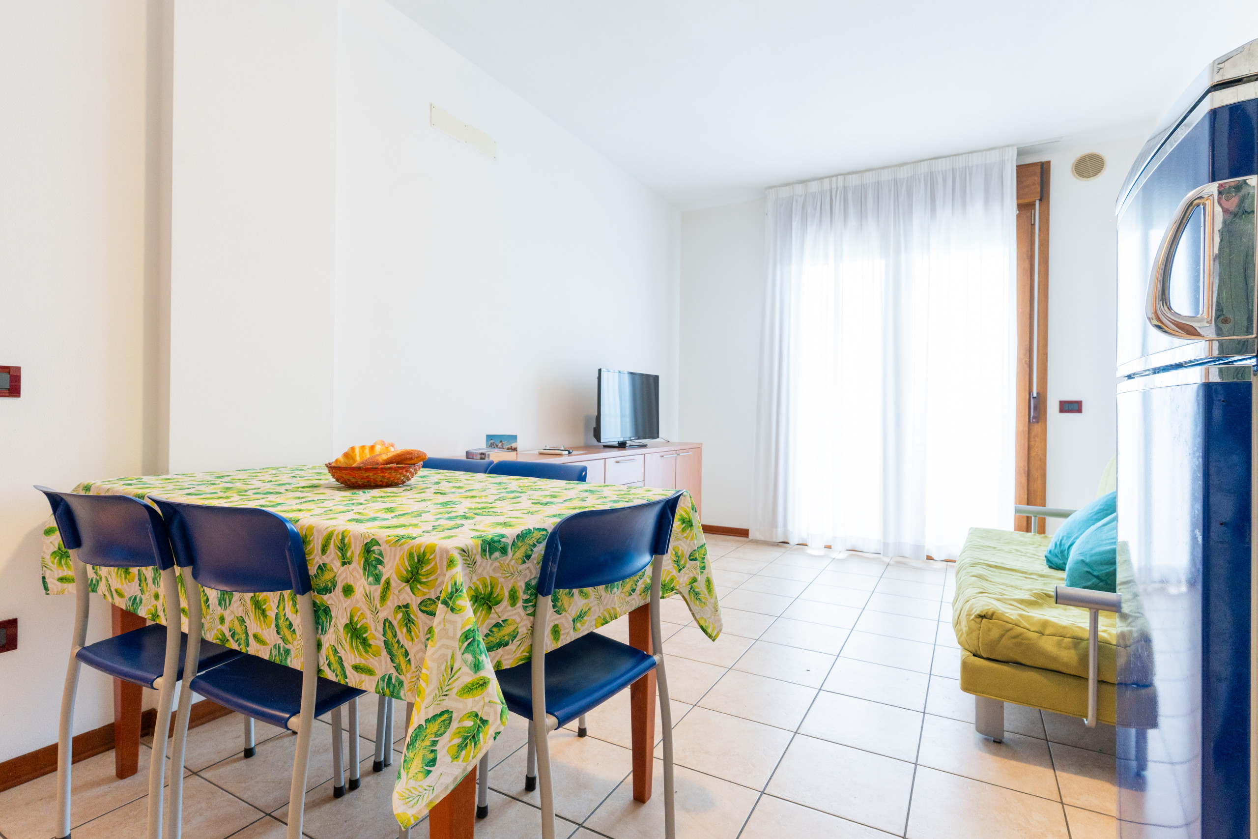 The interiors are developed on a single level and include a welcoming living room with an equipped kitchenette, table, chairs and a French double sofa bed.