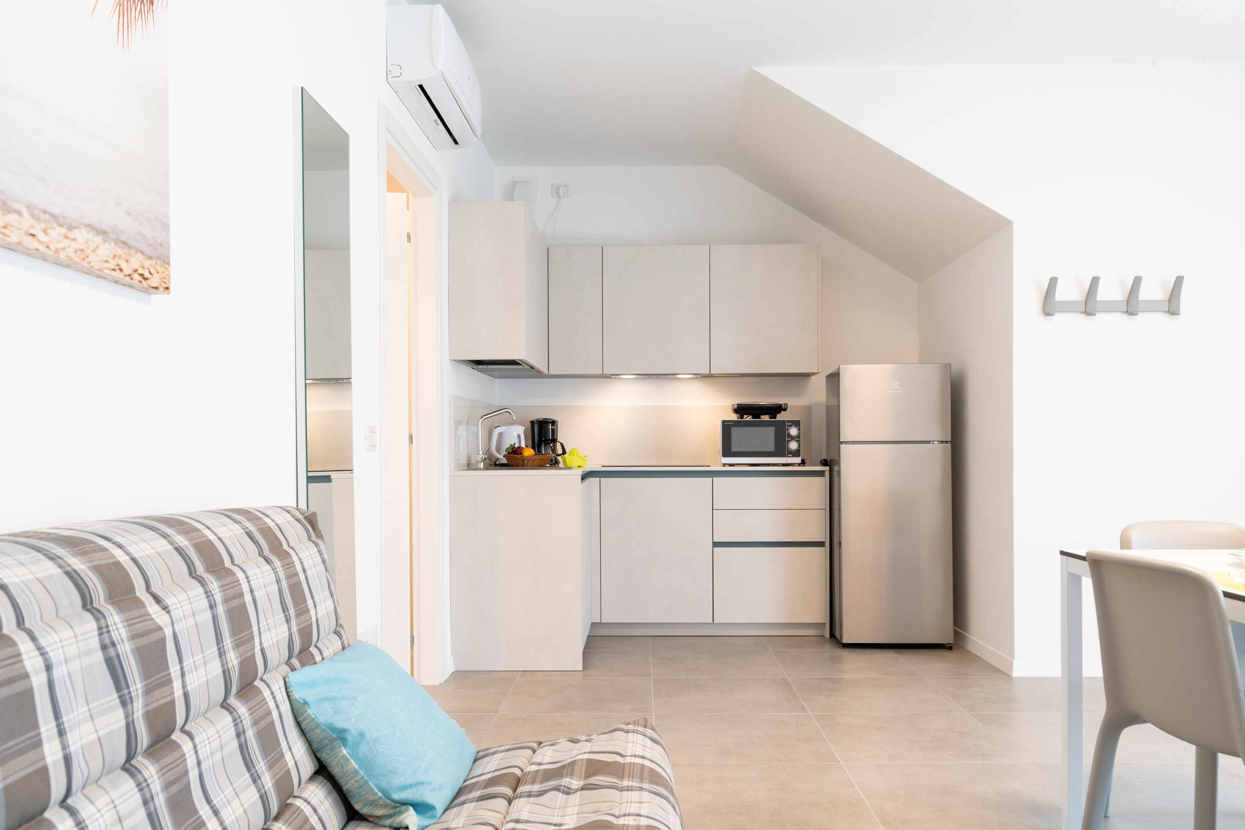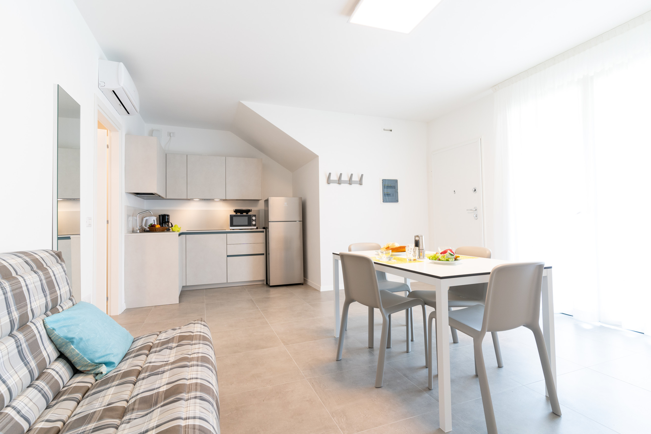 - Living room with equipped kitchenette (dishwasher, microwave, column fridge, kettle), table with chairs and French-style sofa bed.