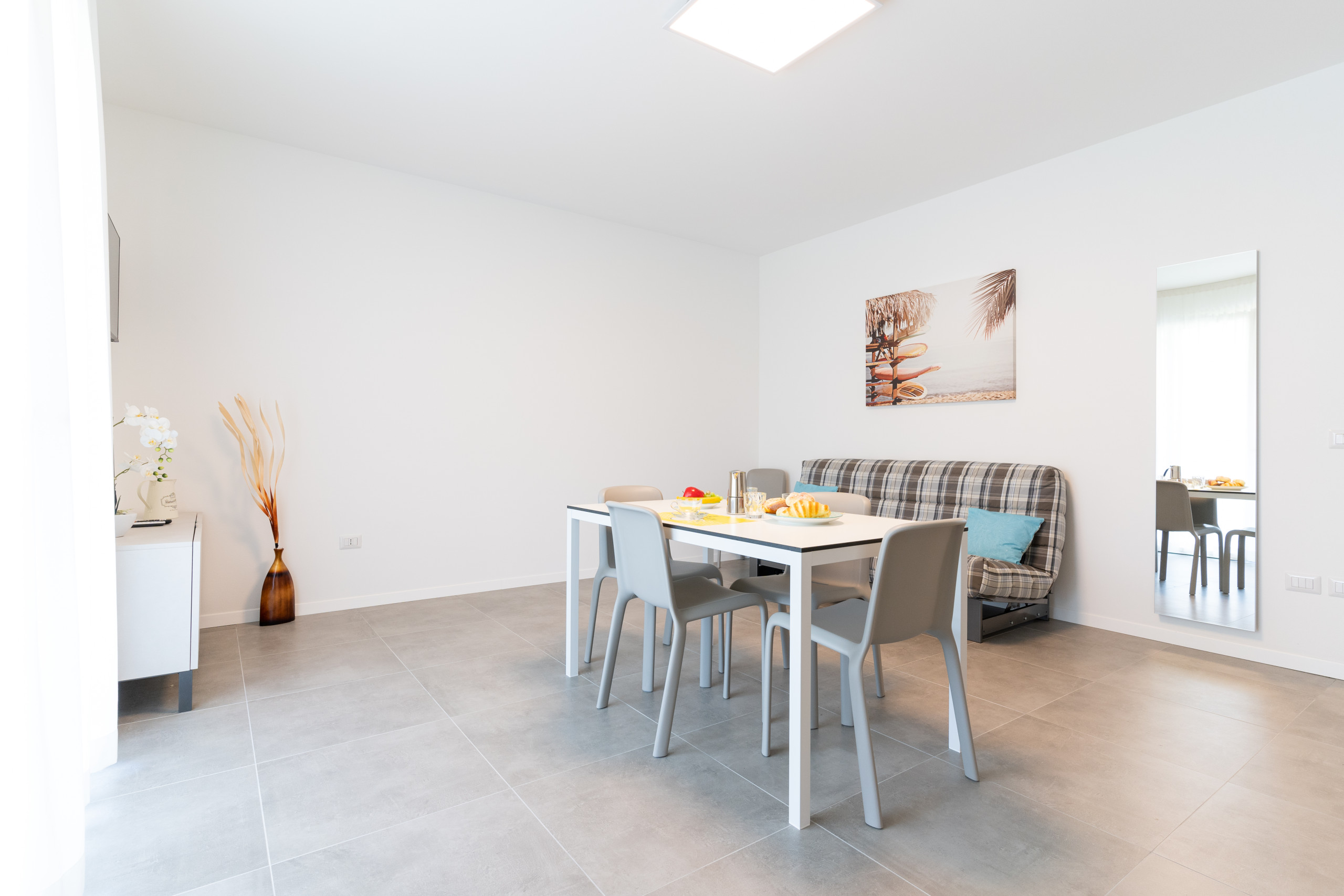 The elegant two-room apartments of 55 sqm, located on the ground floor, combine modern design and functionality. Each unit has a furnished private garden, ideal for outdoor breakfasts or summer evenings with family.