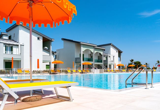 The ACACIE Village is located just 200 metres from the beach, near one of the sea access points. It consists of 76 terraced houses, arranged on two floors and organised around a central swimming pool for adults and children, surrounded by a large terrace with sunbeds and umbrellas. In the common area, there is a children's play area and a barbecue zone, ideal for moments of relaxation and family conviviality.