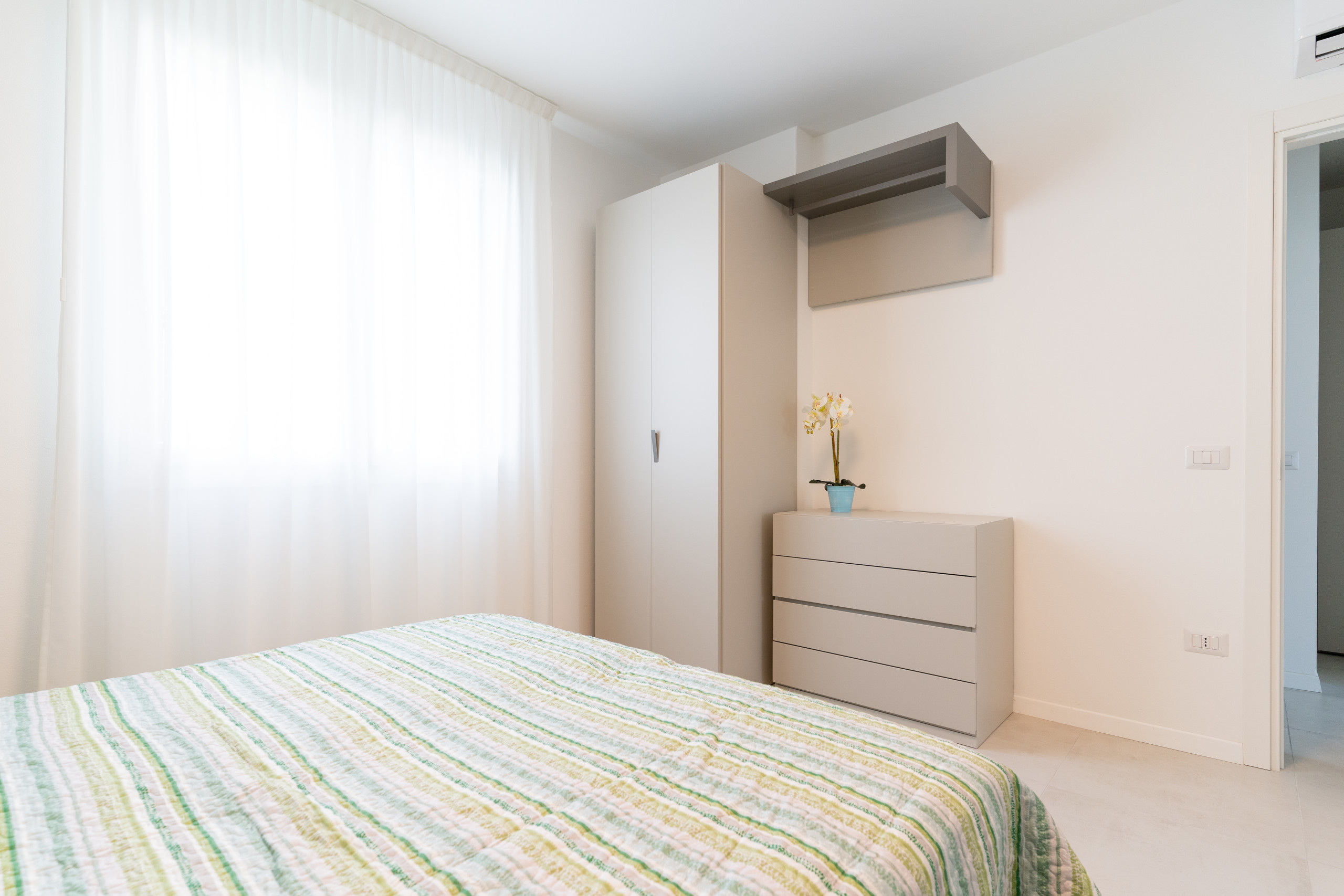 All apartments are developed on a single level and some offer views of the swimming pool while others have side views. The living room has an equipped kitchenette, table, chairs and a French double sofa bed, with access to the balcony or garden, ideal for outdoor lunches and dinners. The main bedroom is furnished with a double bed and a single bed, while the second bedroom offers two single beds. The bathroom is spacious and equipped with a shower enclosure.