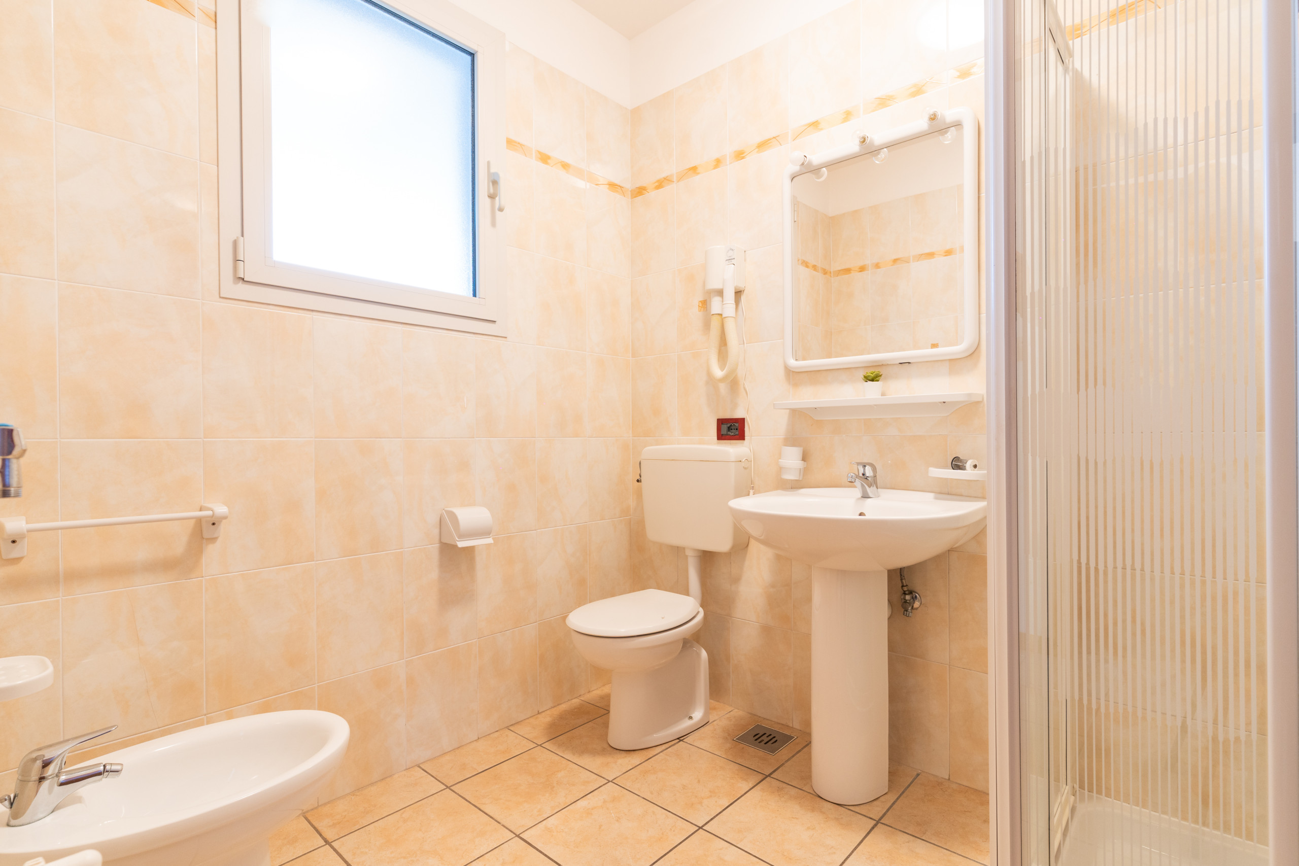 All apartments are developed on a single level and some offer views of the swimming pool while others have side views. The living room has an equipped kitchenette, table, chairs and a French double sofa bed, with access to the balcony or garden, ideal for outdoor lunches and dinners. The main bedroom is furnished with a double bed and a single bed, while the second bedroom offers two single beds. The bathroom is spacious and equipped with a shower enclosure.
