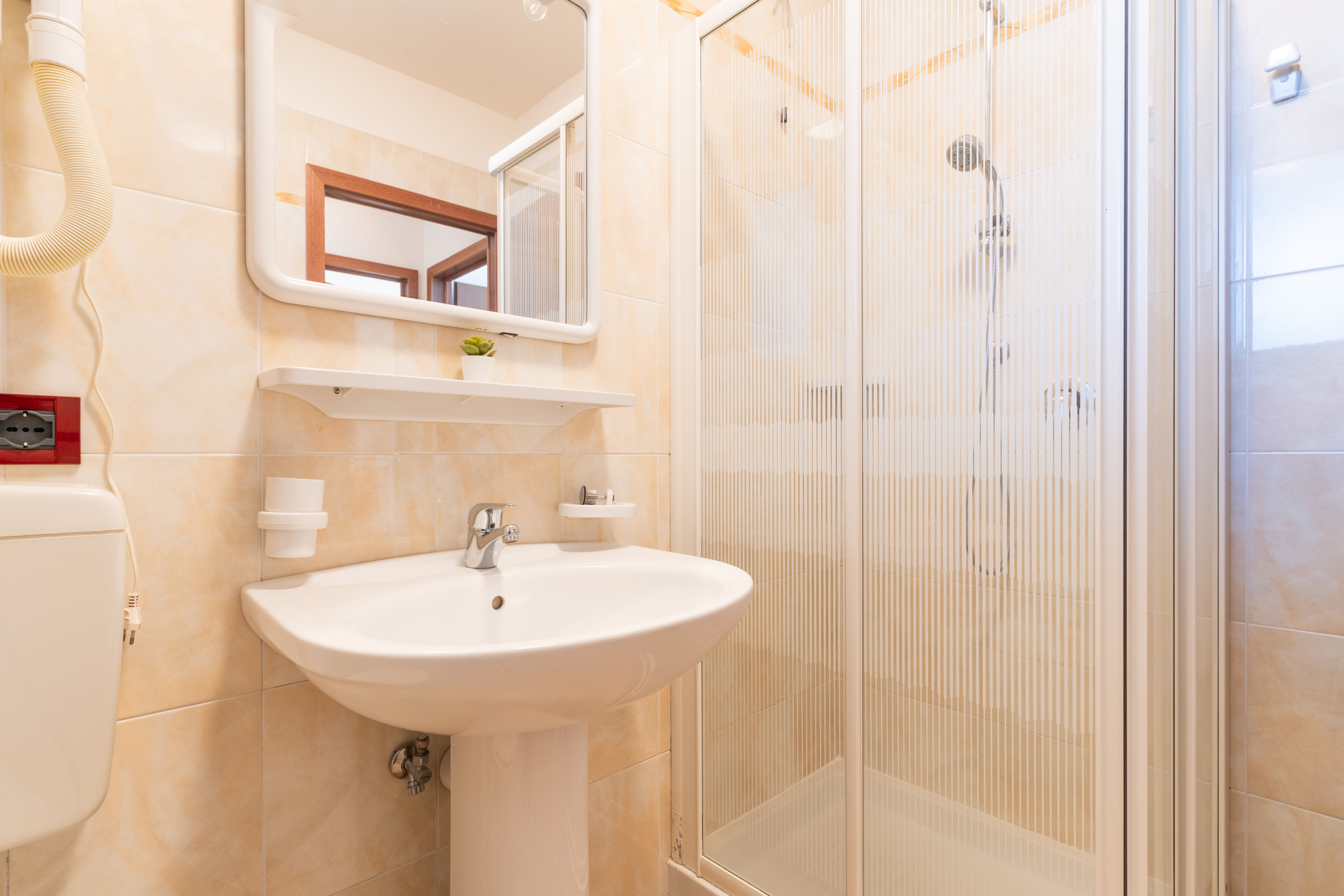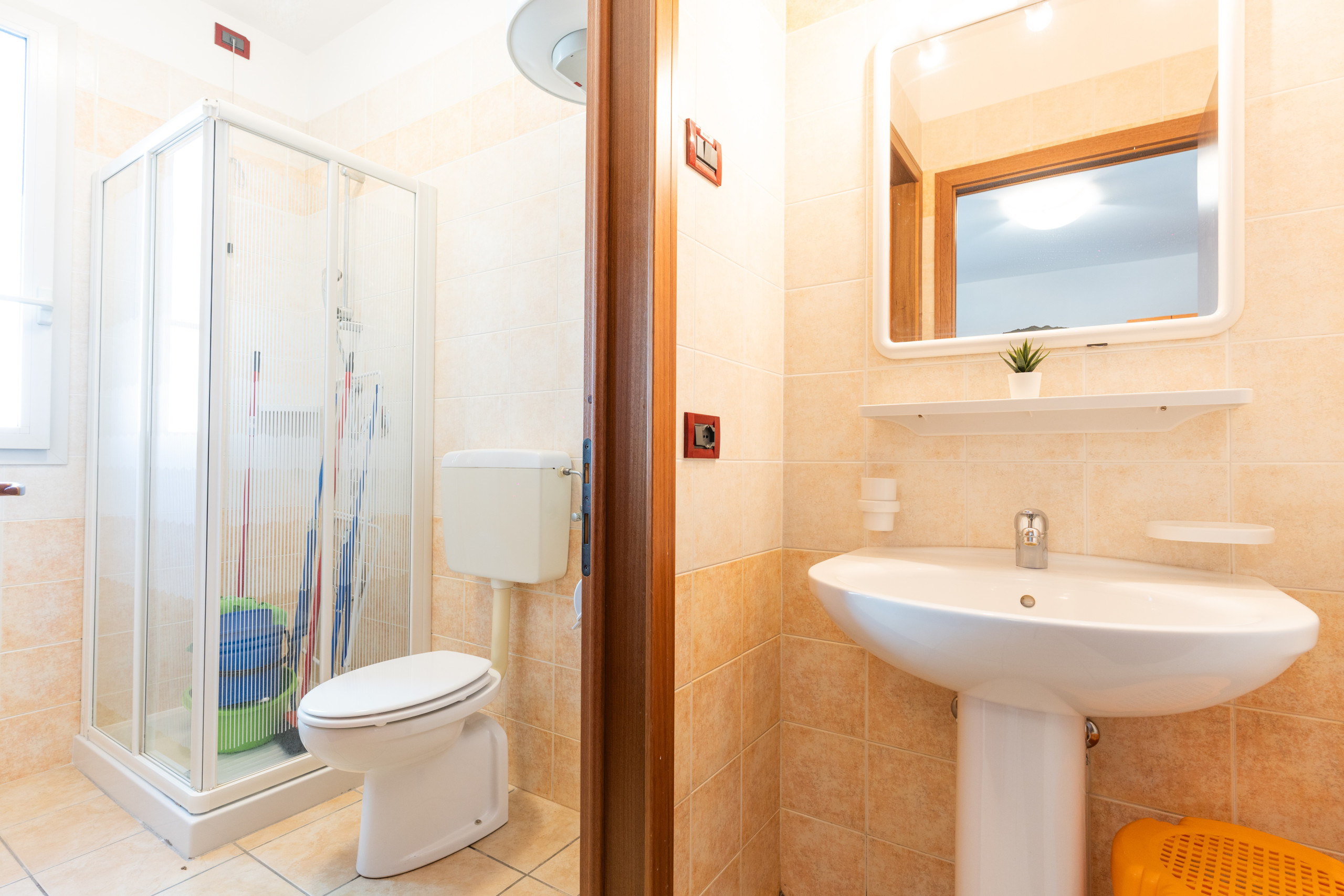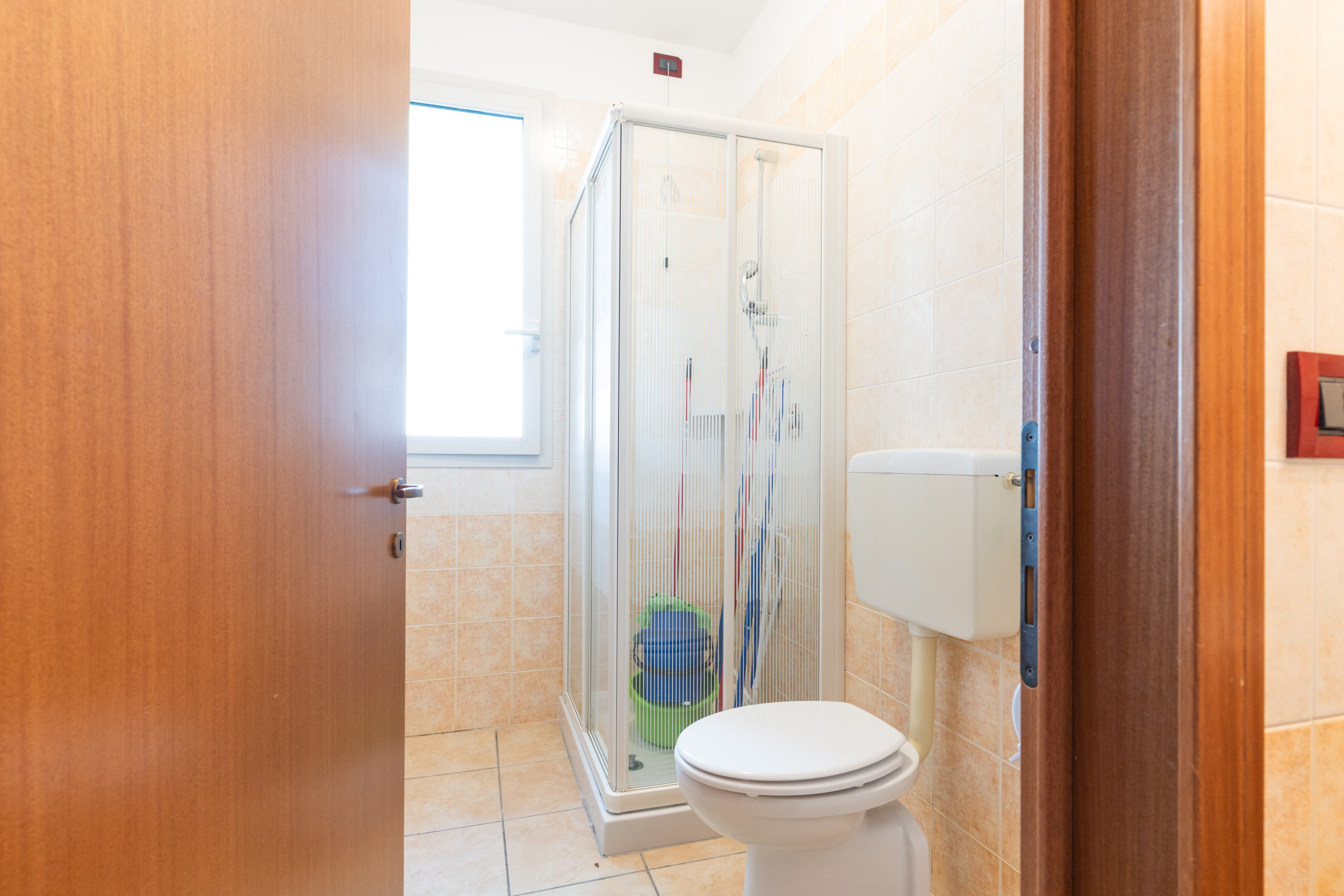 - First floor, accessible via internal stairs: room with balcony and double bed + single bed, a second room with two single beds, and a spacious bathroom with window and shower cubicle.